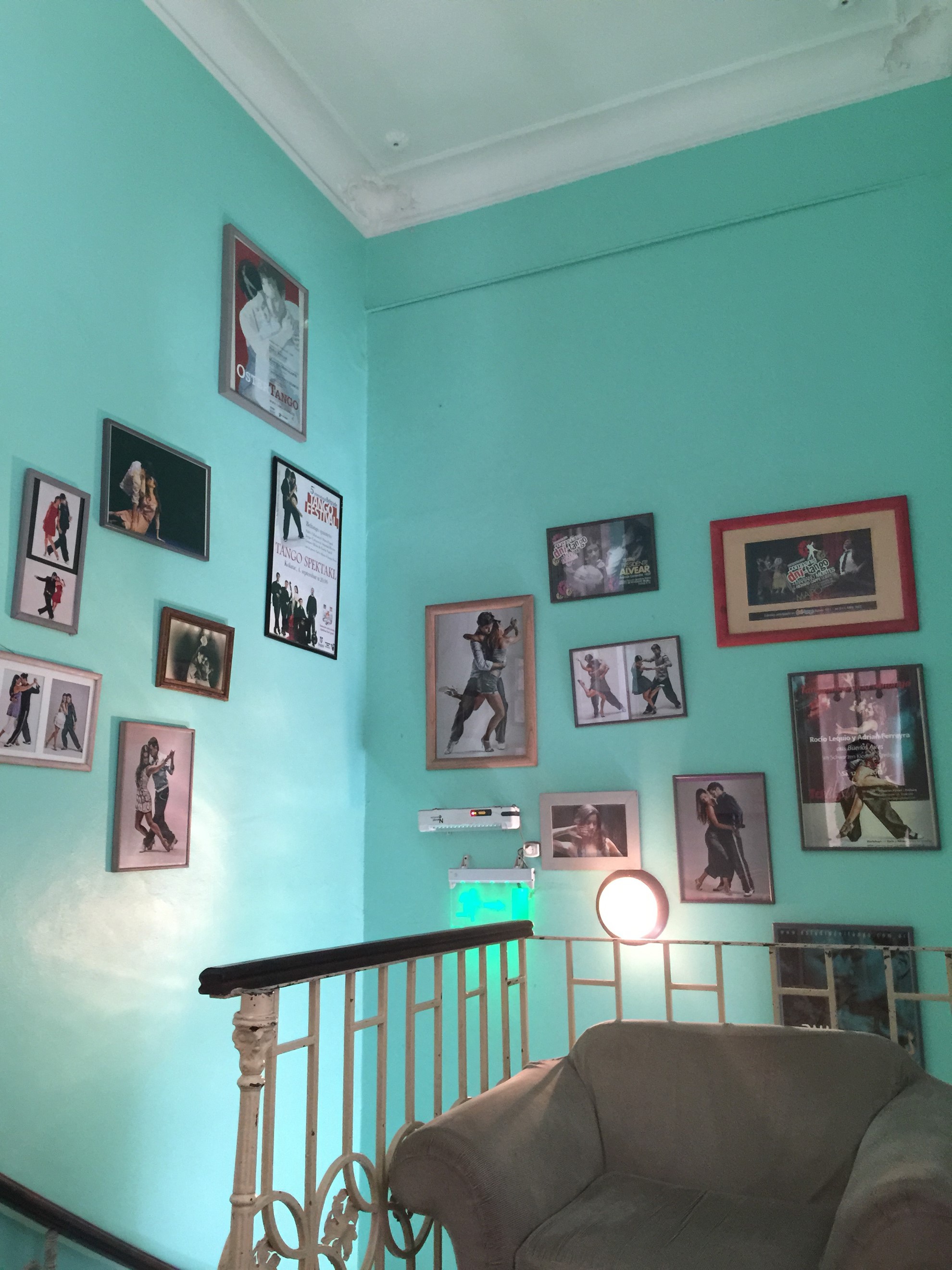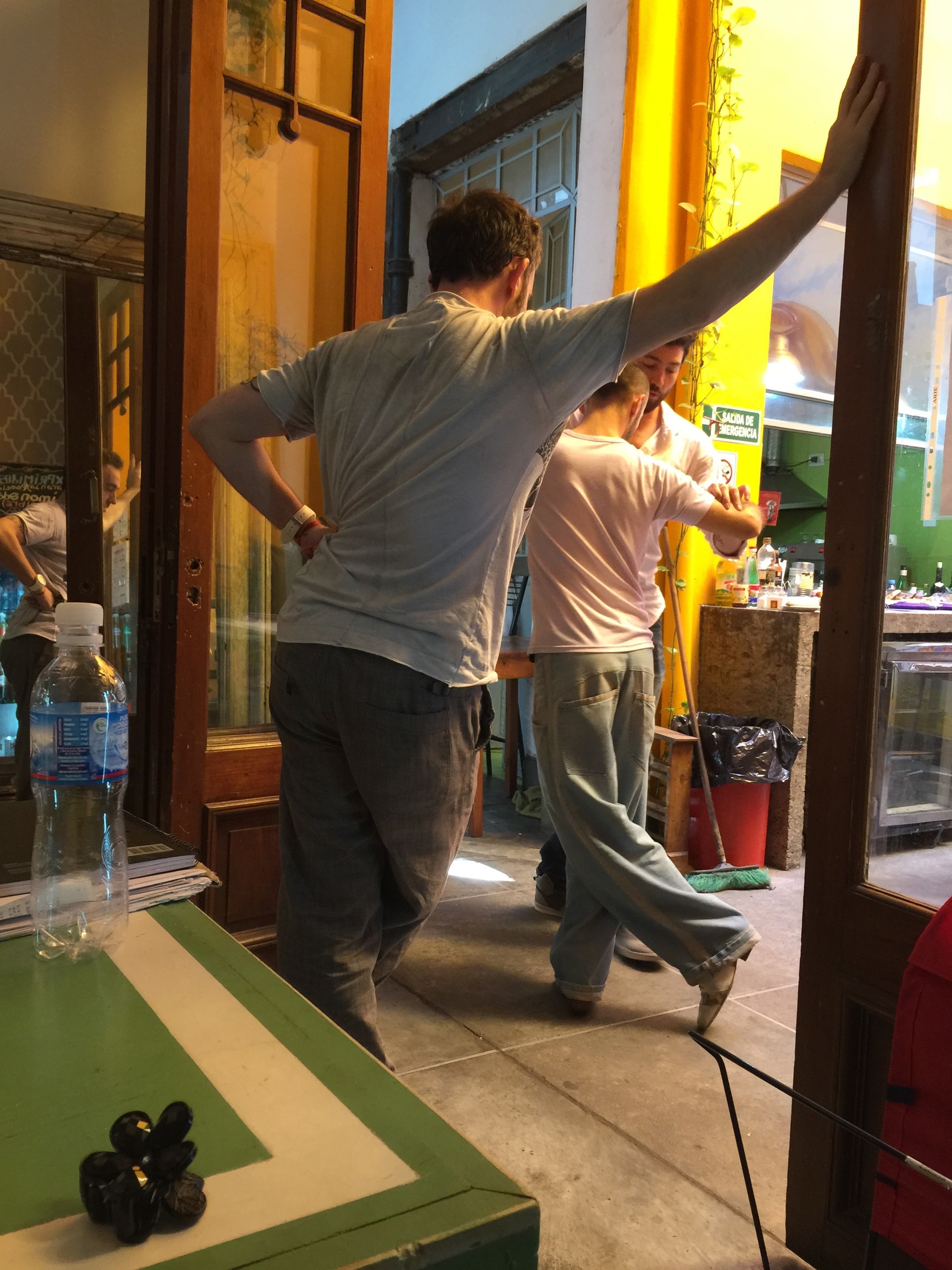 上完私人課,馬上安排了一堂練習課Practica, 這點其實蠻好的,一堂私人課搭配一堂練習課,找他們資淺的團員來陪你跳一個小時,我因為怕體力不好,就坐在那等m, 剛好看到幾個大概是學生還是團員的男生很認真的討論起舞步來