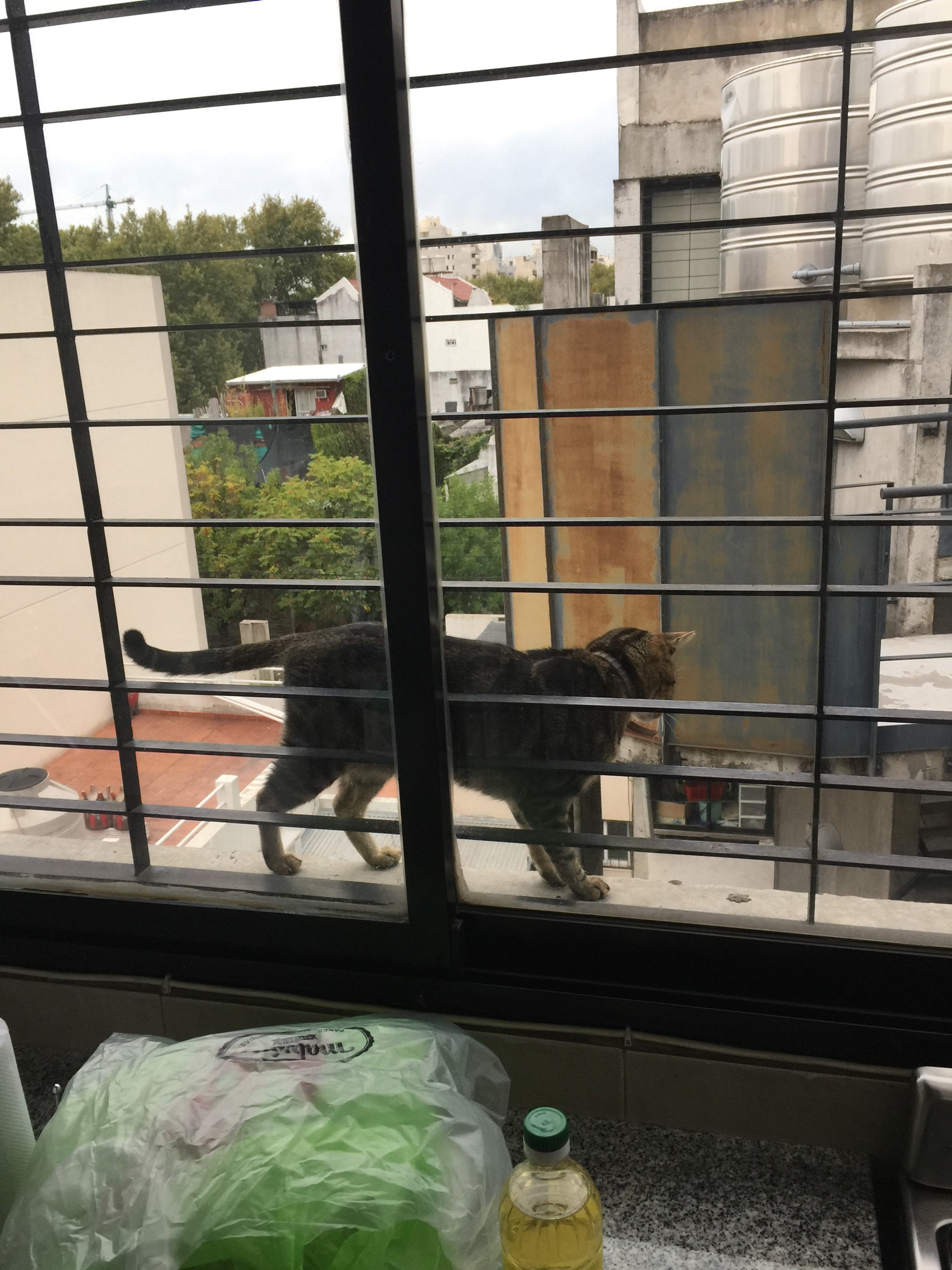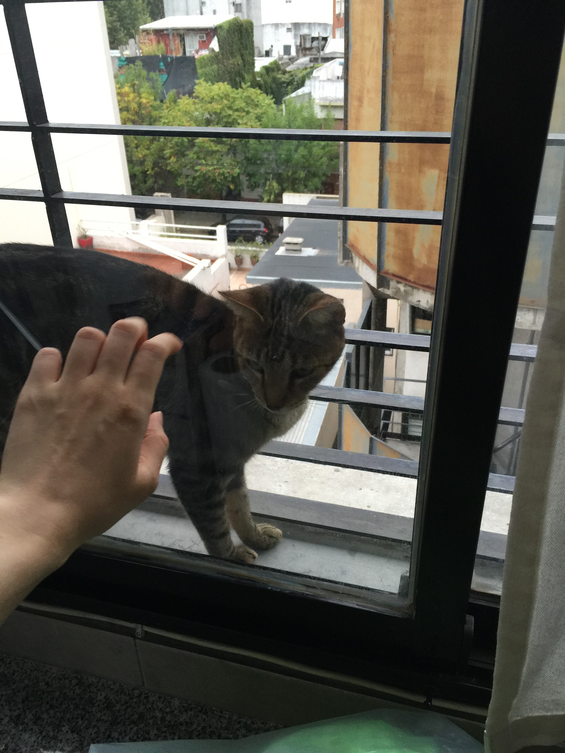 我們這區地上到處都是狗大便,家家戶戶都養狗,狗的種類多到讓我大開眼界,很少看到重複的,阿根廷人真是有夠愛養狗耶,只是遛狗大多不清狗大便,我甚至看到大嬸就一腳把狗便便踢到路上..這樣是有比較好嗎? 但是狗狗多半都是牽著的,都沒機會跟她們玩到,反而是我家附近有兩隻貓超級主動,一隻是一看到人就跑過來在旁邊磨蹭,另一隻則是會擋住你的路在你面前就四腳朝天在地上翻滾想要撒嬌,把m嚇得半死,我通常是很愛跟貓玩,但是現在因為說貓糞的弓形蟲很傷胎兒頭腦,我就都忍住不去摸他們。這天早上在廚房就聽到貓叫,看一看有一隻跑在門口,沒多久居然就爬上我窗外的鐵欄杆裡面,要是我窗子打開的她現在已經進屋子裡了耶,她真的很友善也很愛找人玩,就在我窗外這樣磨蹭一陣子,可愛極了。