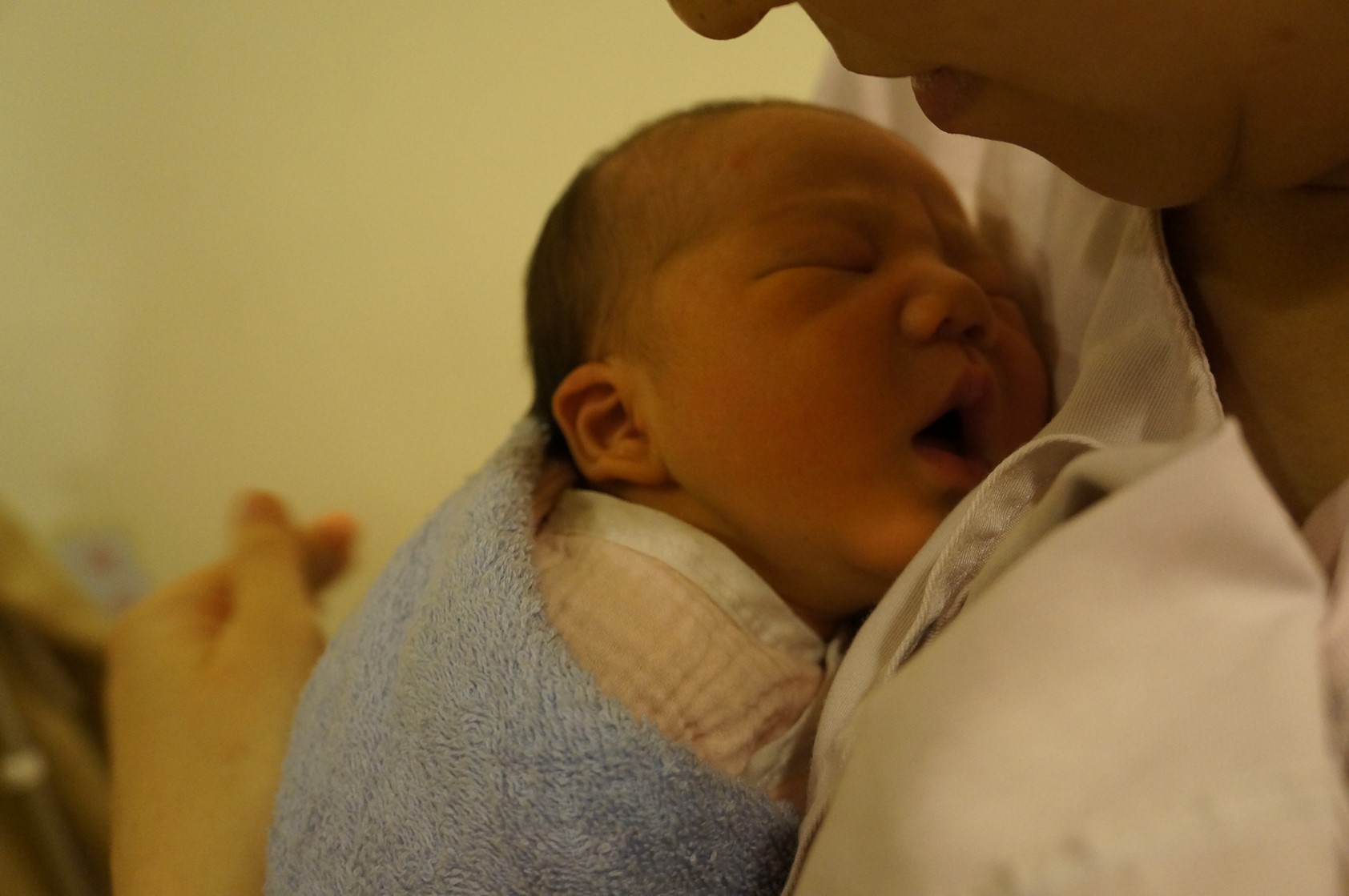 18:18,再次隨著宮縮用力,頭出來又縮了回去,間隔時覺得很想吐,有人幫我拿塑膠袋過來,但又吐不出來,下次的宮縮我再次用力,終於把寶寶的頭推了出來,就在陰道口外面,醫生大聲說繼續用力,原本Michael以為這次宮縮我已經用力三次了,大概沒有宮縮的能量了,沒想到這次宮縮還有最後一次,雖然不是很強但我跟著自主性的用力,終於把肩膀和身體擠出來了,我的寶寶誕生了!