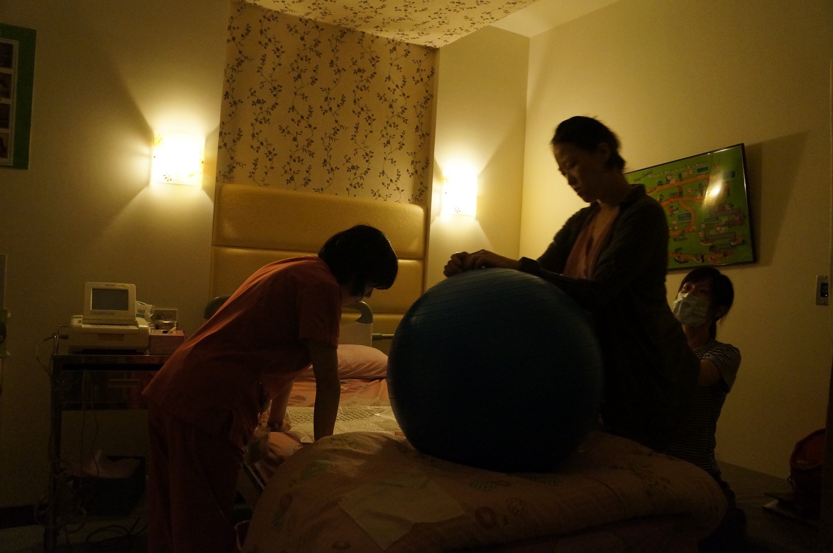 燕芳來了後就關上了門,之後就沒什麼護士來打擾我了(歐耶! 真是令人開心啊!),燕芳也很自動的幫我把燈光調暗(我當下已經很忙著專注呼吸,這些我自己生產計畫書上寫的東西像是微暗燈光、芳香精油燈等其實我都沒時間和心思去架設或檢驗,幸好我有陪產員和先生幫我執行啊!!),她倆和我跟我先生四個人在微暗的燈光下在關上門的房間裡站著討論一些細節,我當下頓時覺得好安心啊,從得知純惠護理長不能來、到禾馨沒待產房以來的擔心,算是終於放了心了,而且這種很親暱又安心的氛圍居然讓我有種開party前的興奮,因為知道不用再被未知的護理人員打擾且大部份事情都可以依照我們預期的進行,開心的不得了。其實這時宮縮已經很強烈了呢。