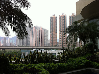來香港的期間,我都住在”奧運站” *,第一次來這邊覺得自己很像是鄉下來的土包子,住宅區的樓房怎麼都這麼高阿,看了實在很有壓迫感,雖然也很壯觀,在前面都覺得自己很渺小,很像這龐大建築物中有無數個小膠囊,每個膠囊也都長得差不多,在這膠囊裡面住的人也不太需要發揮自己的美感和創意,因為膠囊裡面像飯店一樣都已經統一裝潢好了,進出都要嗶卡表明身分,從一樓就會有人幫你按電梯,到了七樓的大廳會看到大片草地和游泳池(見圖),接著又有三座各自不同的門廳,又再嗶卡一次,也又會有管理人員幫你按電梯,有一種在未來世界生活的感覺,覺得很不真實。