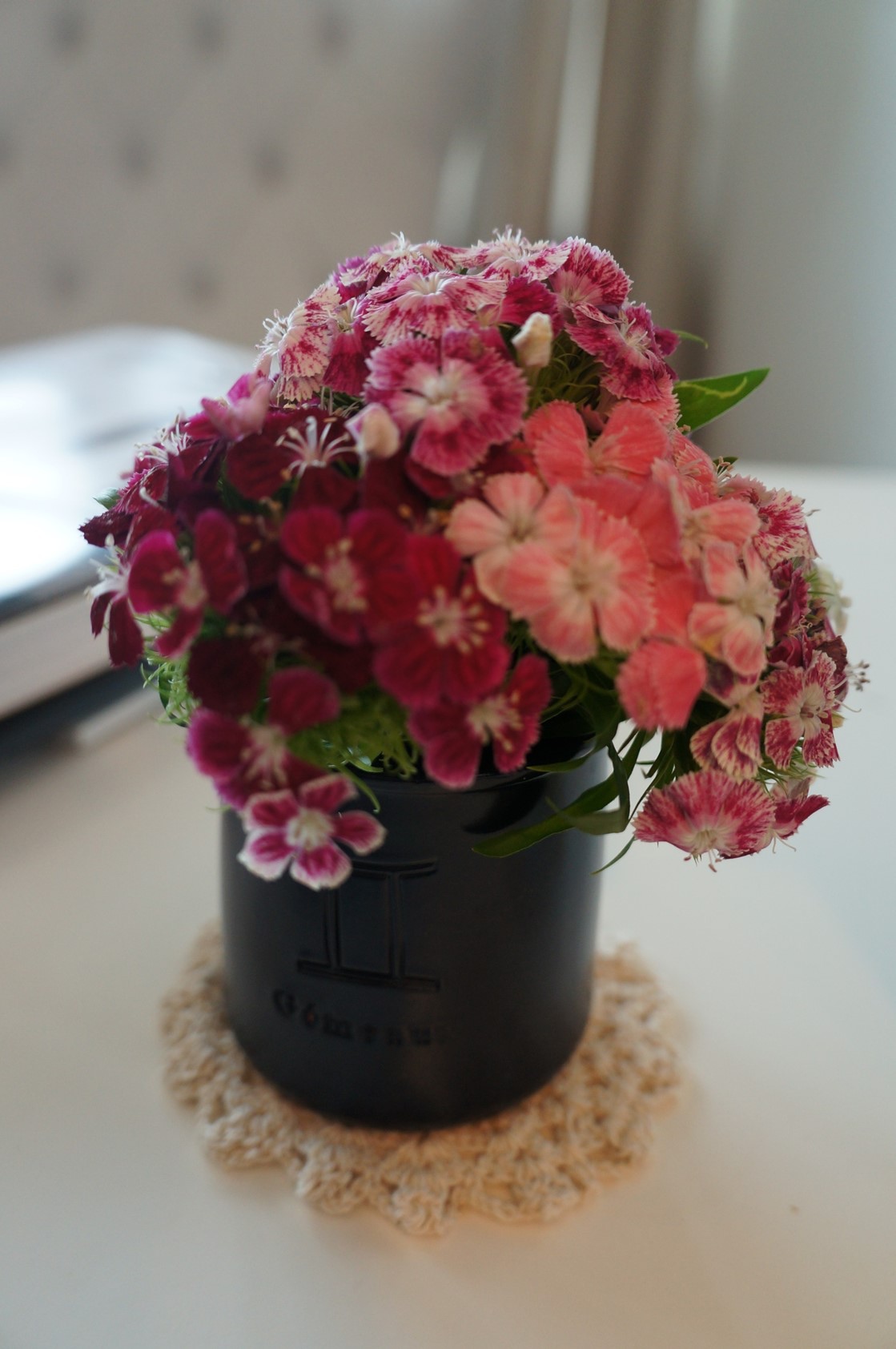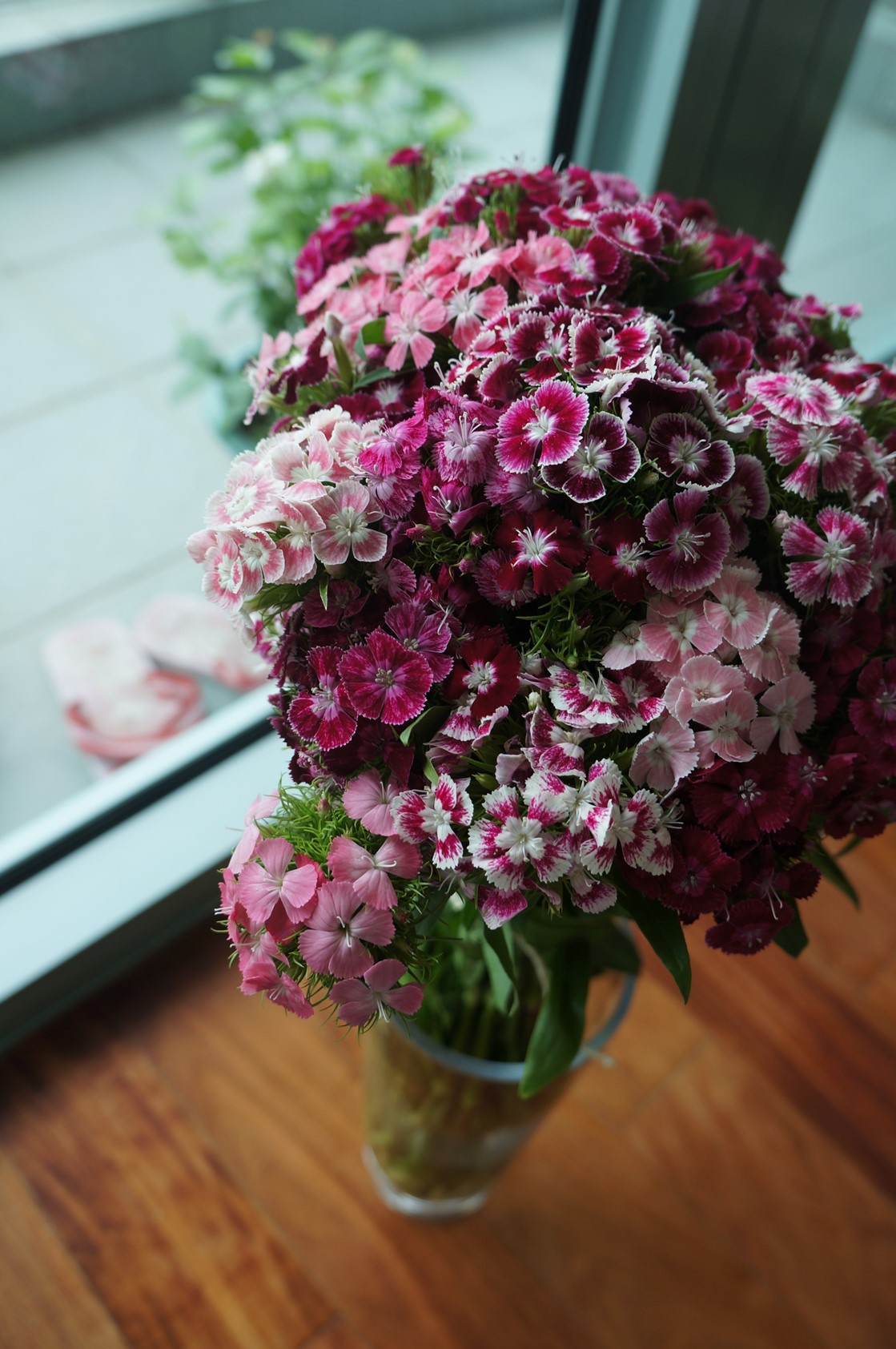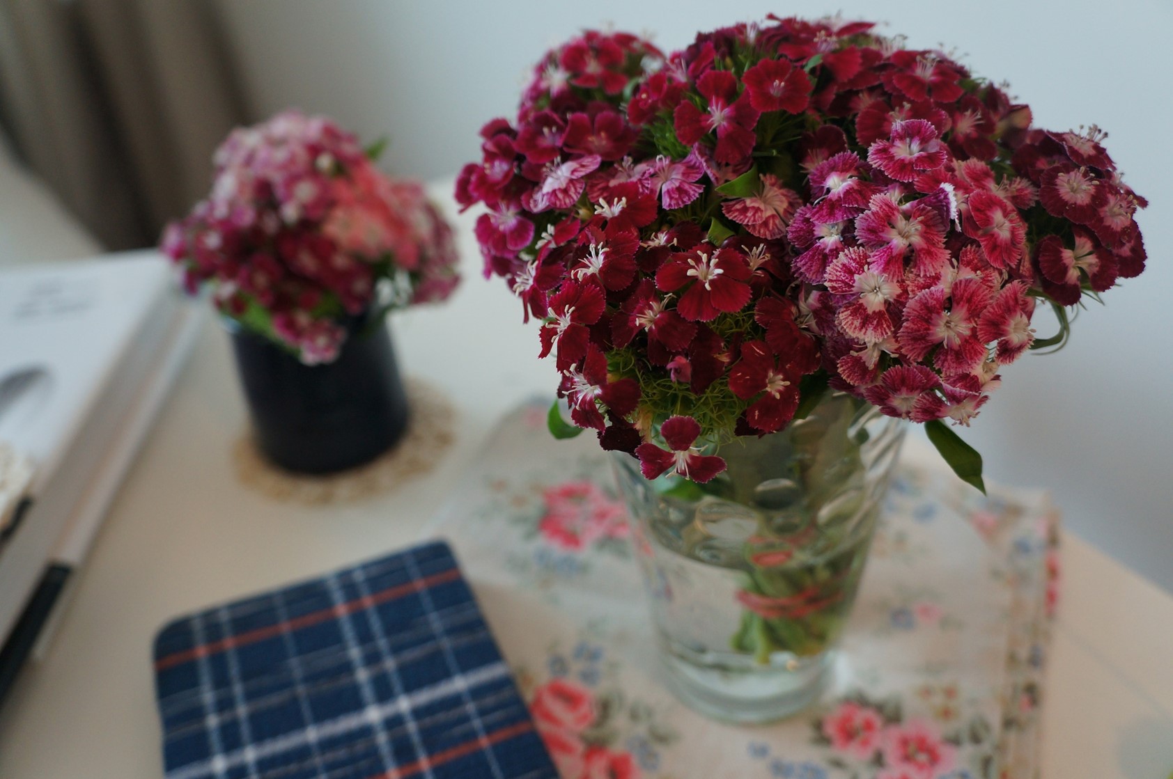 後來的某個周末又去買了一把石竹,一大把才45港幣,雖然葉子很多整理不方便,還是擺弄了幾盆當擺飾,用之前訂花時剩下的花器和之前買優格剩下的器皿,好像都還蠻搭的喔。