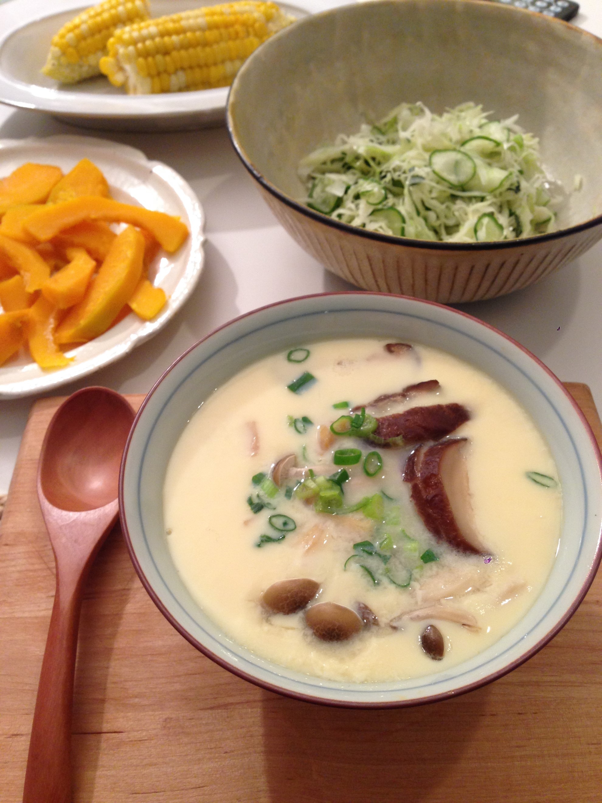 2014.06.19茶碗蒸,參考了阿基師的撇步,像是一個蛋兩顆水(或高湯)的比例,過篩去掉氣泡,電鍋蓋加兩根筷子以降溫,還有分兩次蒸(食材才會浮在上面)等技巧真是好實用,另外我用之前煮過蔬菜的高湯,泡了香菇和干貝加入蛋液,意外發現隔夜後的剩餘蛋汁再蒸更好吃,M跟我狼吞虎嚥的吃完,猜測大概是香菇和干貝泡了一晚更加入味,又可能是煮過南瓜和有機玉米的高湯更香甜?