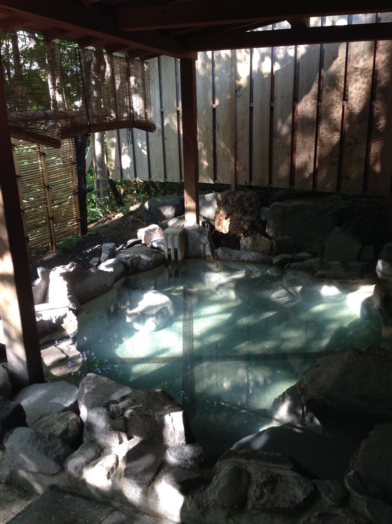 這森乃湯的湯屋是木頭的建築,一進去被木頭包圍的氣氛就很是不一樣,好像進入了深山一樣。由於這間湯屋並非全部住客都可使用,湯客很少,當晚第一次去泡的時候只有我一個人。我很怕悶熱所以往往直接跑到戶外池,熱騰騰的水配上山間清新微涼的空氣,真是一個舒服啊! (順帶一提,我衝動地跑來泡湯,根本忘了拿浴巾,幸好M有發現,去要了兩條,跑到室外湯隔著木欄呼叫我的名字,我才免於沒毛巾的窘境。)