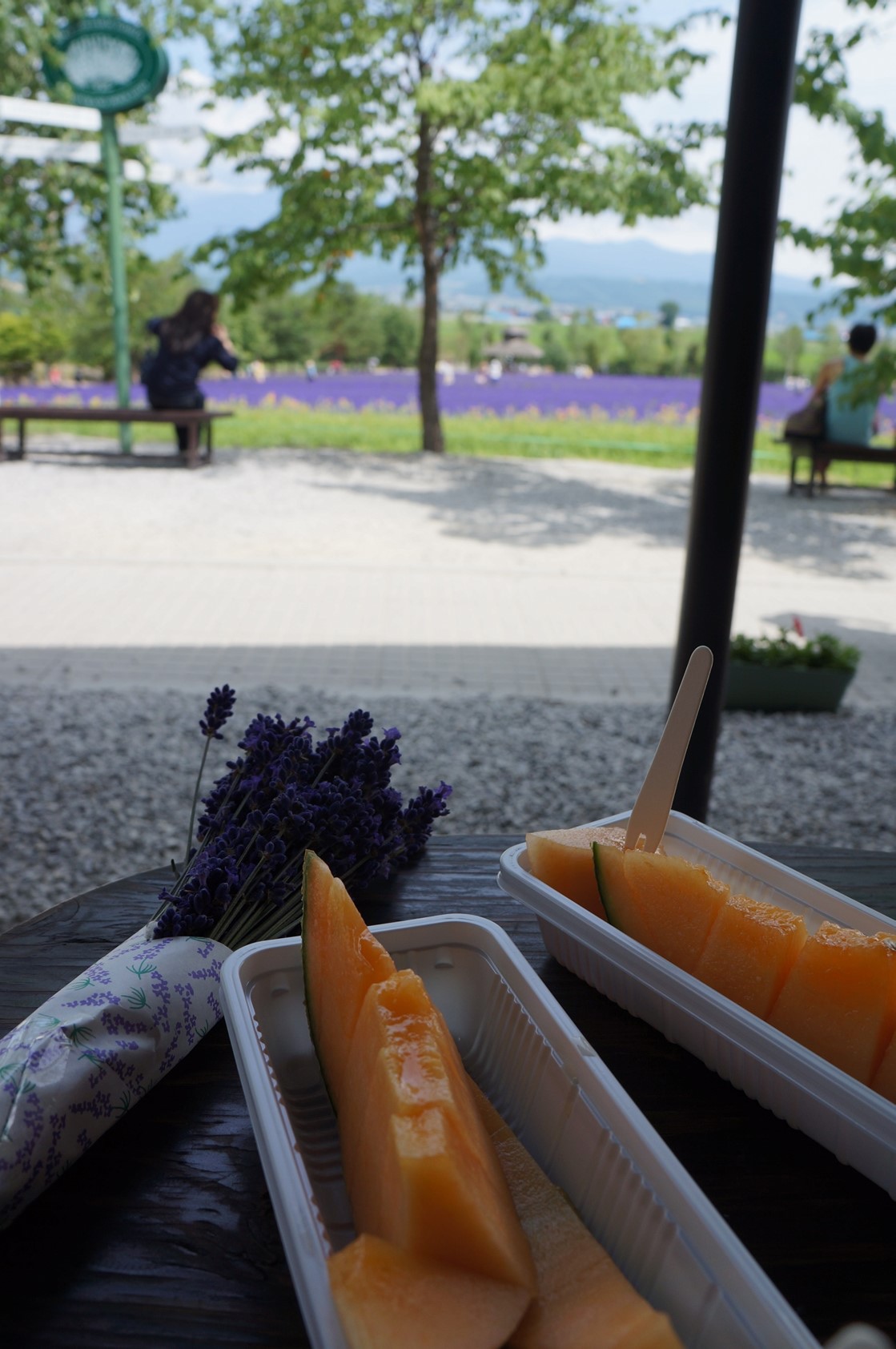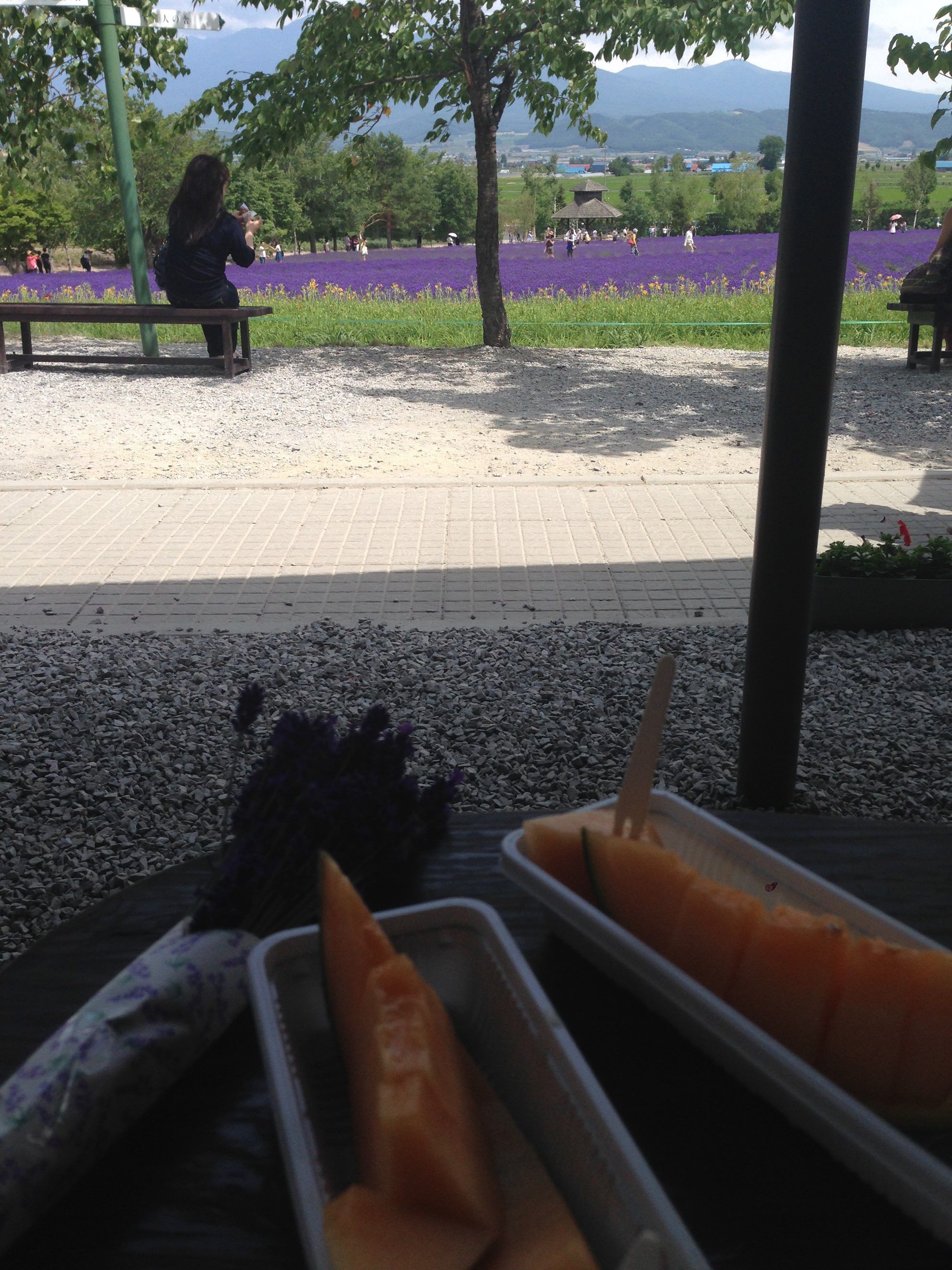 逛了不同的花田、買了些許送禮自用的小物、也殺了無數底片後,坐在這有遮陽座位的販賣亭前,先買了塊富良野的哈密瓜,鮮甜多汁,香氣就跟以前吃到的夕張牛奶糖一樣但是又更加天然清新,我知道這種比喻很怪,但是原以為人為的牛奶糖一定是香的太誇張,沒想到那牛奶糖真是有盡責的模仿北海道哈密瓜真實的香氣阿,真正的哈密瓜又香又甜,我們後來還帶了一顆回香港,回家還留戀不已,不愧是北海道名物!