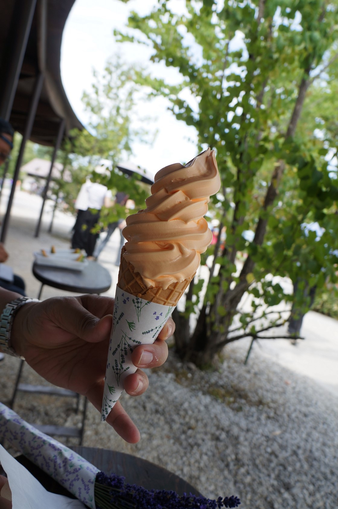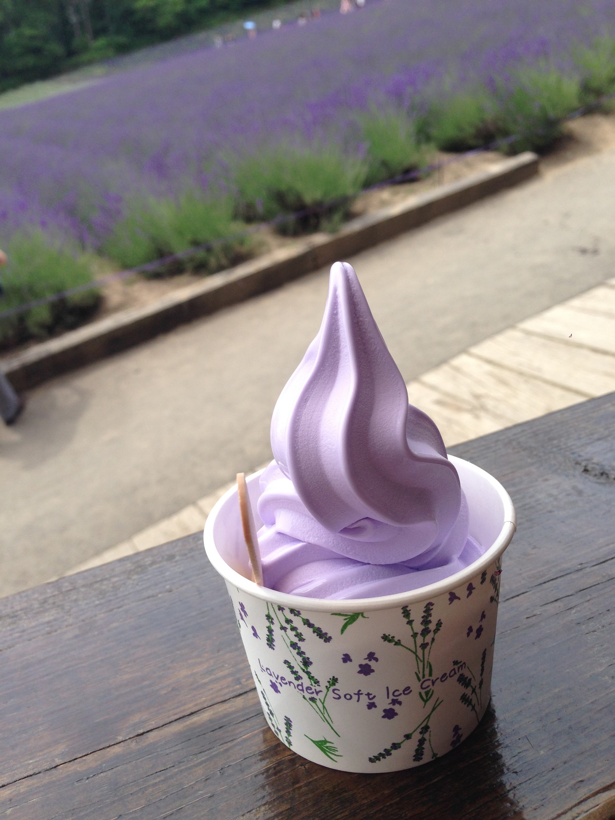 在出發前M就一直很期待北海道的霜淇淋,我倒是沒特別的感覺,在富野農場還在逛第一個花田時,看到看板上淡紫色美麗的霜淇淋時,我們就忍不住先買了一支,姑且不管是否天然拉,這浪漫的顏色和"在薰衣草田吃著薰衣草霜淇淋"的感動就已經無敵啦。
