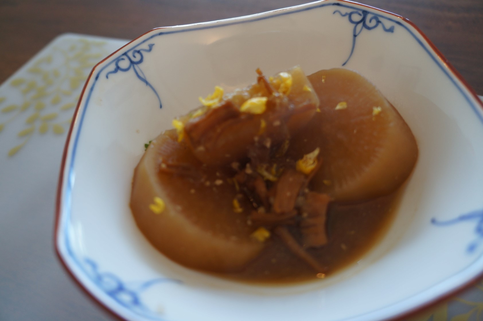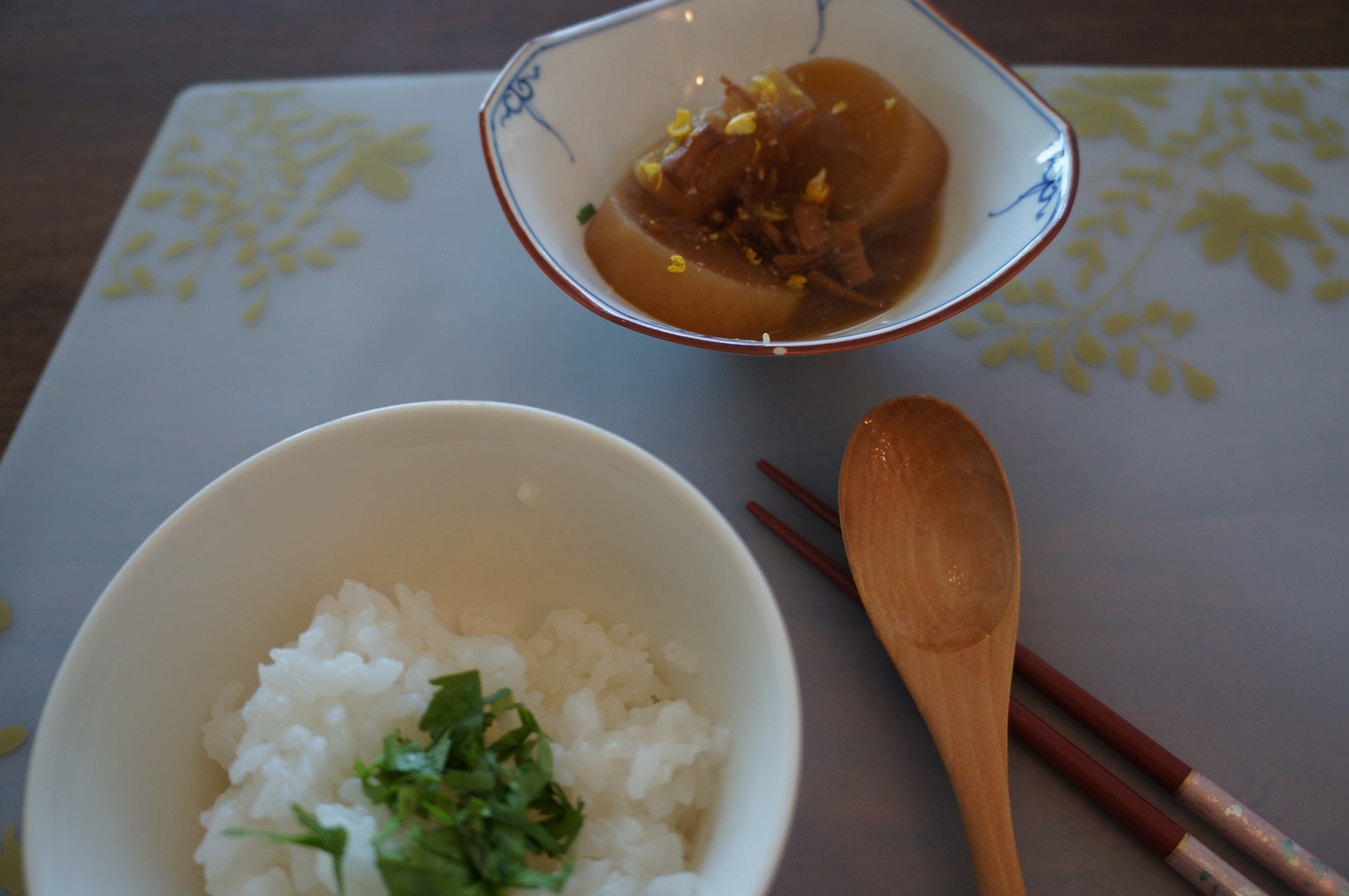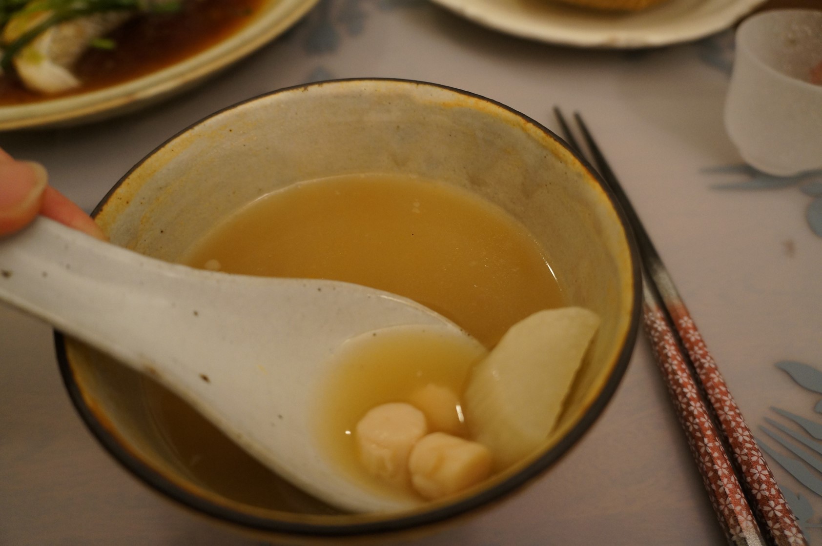 迫不及待用美瑛扛回來的兩公斤米煮飯,早上起的早,煮了一杯米,現在每次煮米因為米量太小,用不銹鋼內鍋都會黏鍋底,我直接用我的小土鍋放進電鍋煮,要吃的時候還可以直接把土鍋拿來當飯碗,省去洗碗,哈哈。冰箱有一段日本白蘿蔔,原本想學日本人磨成蘿蔔泥佐菜,後來懶惰決定用燉的,那來個煮大根吧,水加了點日本醬油、清酒,沒甚麼料可以增加鮮味,還是丟了干貝下去,結果發現這瓶很少用的日本醬油也太鹹了吧,趕快搶救,把醬油湯撈起來,另外加水稀釋,後來網路上看有人加味增,我就也加了點進去,果真馬上飄香。小火燉煮許久,晚上因為沒煮飯就沒吃,泡了一碗湯汁,隔天早上配白米飯吃,因為過鹹剛好當作漬菜佐飯,好香好下飯,稀哩呼嚕的就吃完了,醬油味增湯底還可以倒入飯中當茶漬。