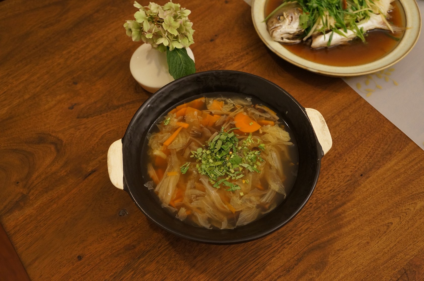 這就是我熬的高湯,我喜歡喝湯但是每次用豬肉和骨頭熬是不錯喝但不夠濃郁,這次加了雞腿進去,果真變濃而且顏色也較白,比較接近我喜歡的湯頭,一樣加了鮮干貝提味,還有日本山藥,是我喜歡的路線。