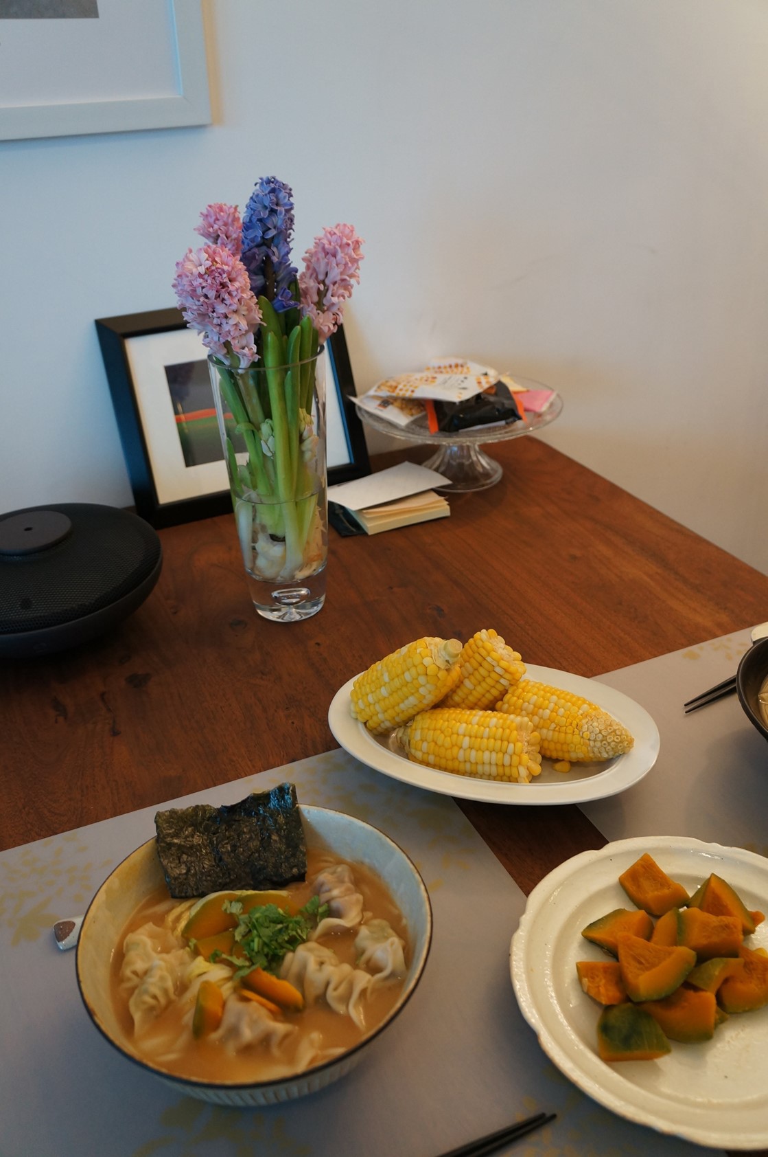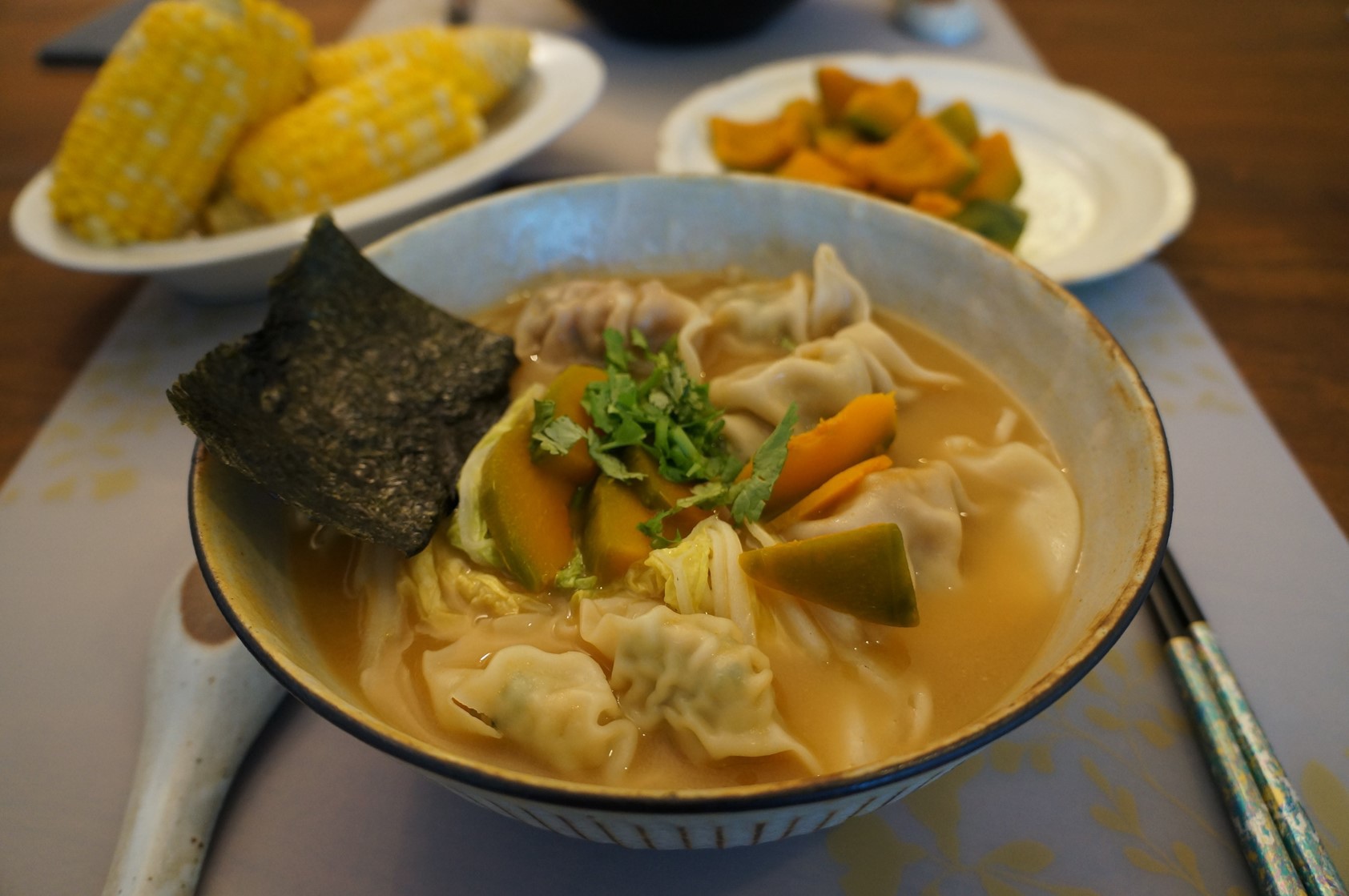 2014.07.27 是個亂煮的概念,但是食材好亂煮也不會太差。冰箱有日本種南瓜和天然堆肥玉米,用日本火鍋用高湯煮熟蔬菜後,再用煮蔬菜的高湯煮麵,一物多用且煮完蔬菜後高湯會帶點甜味,我很喜歡;我吃麵喜歡加很多料,冰箱沒有肉片很可惜,不然這高湯是偏芝麻香味,若有上好的豬肉火鍋切片就太搭拉,沒豬肉就放豬肉水餃吧,哈哈,於是加了幾顆不同口味的豬肉水餃進去,再丟點大白菜和紫菜,就是個吃飽吃爽的拉麵啦。