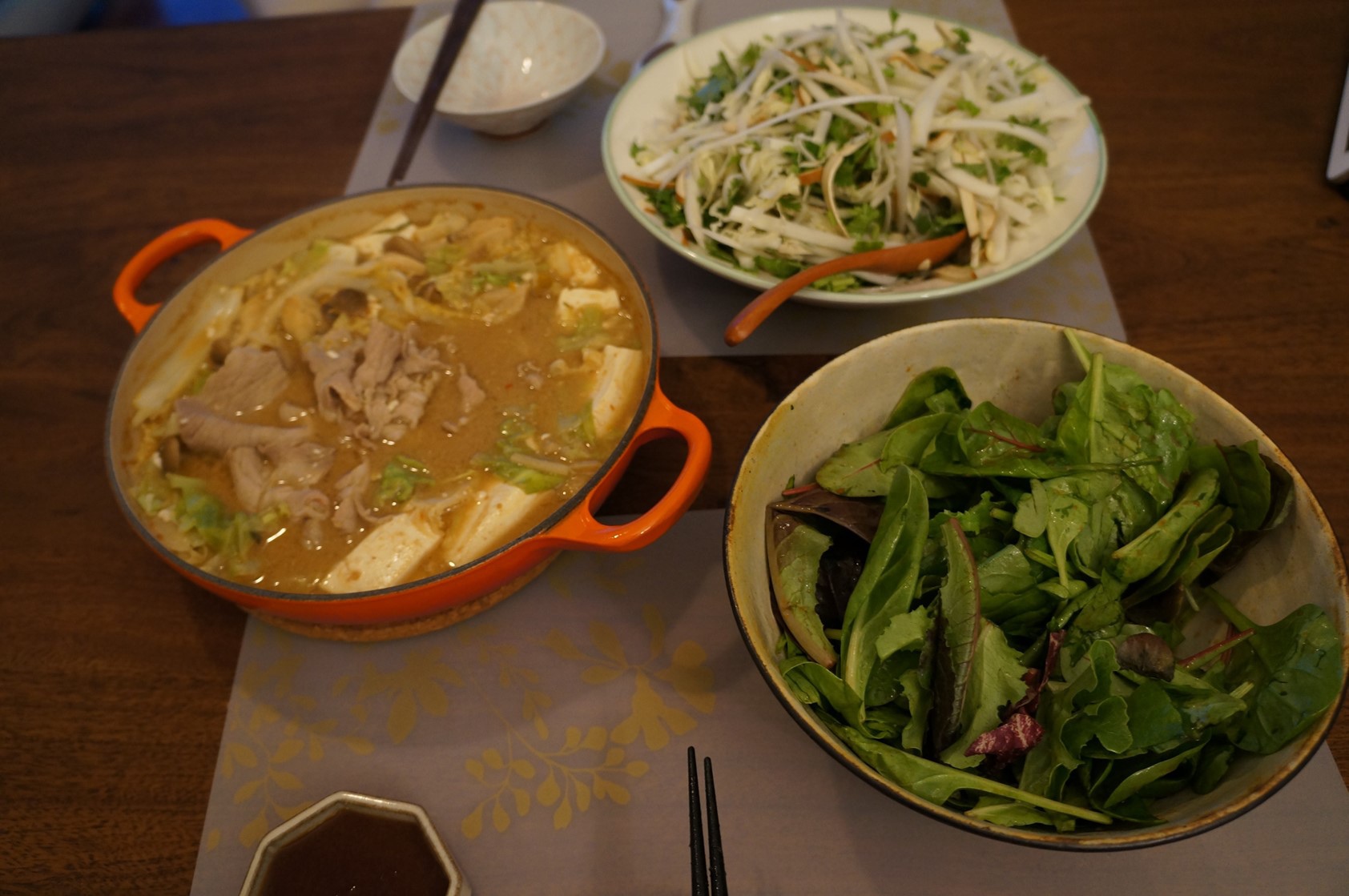 2014.07.28 前一天的芝麻火鍋高湯還有一些,終於買了豬肉火鍋片,加上豆腐,白菜等等就變成了小火鍋,松柏長青仍是我的涼拌菜最愛,生菜則是用日本烤肉連鎖店"敘敘苑"的醬汁涼拌,好香阿