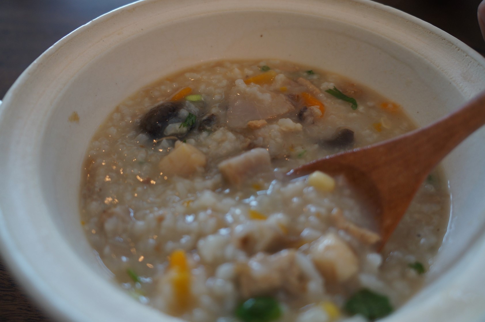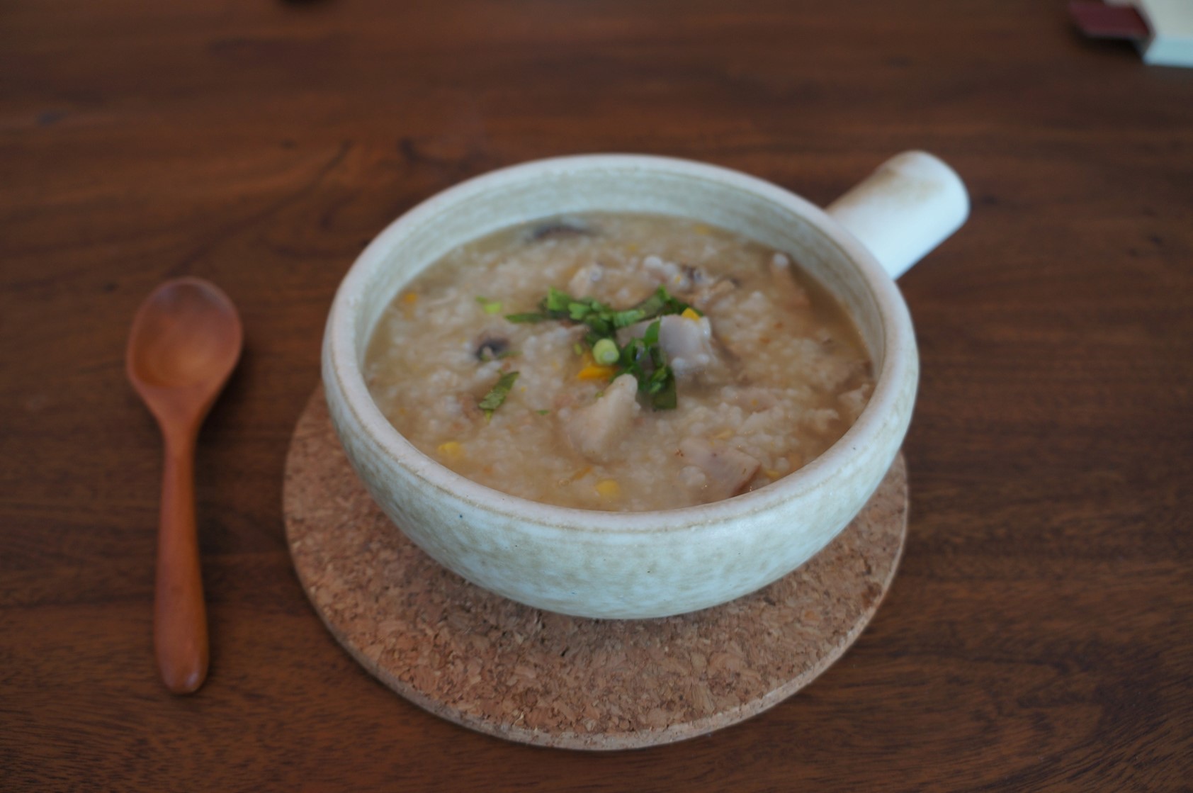 湯底是用罐頭雞湯,喔還有一個我自己的小撇步,我喜歡喝粥的時候還能喝到湯,但是一般煮粥到最後都會被米吸光湯汁變得稠稠的,尤其是吃到第二餐,就完全沒湯汁了,於是我把高湯預留一些,等要上桌吃的時候再加到碗裡,這樣就可以控制粥的濃稠程度啦。