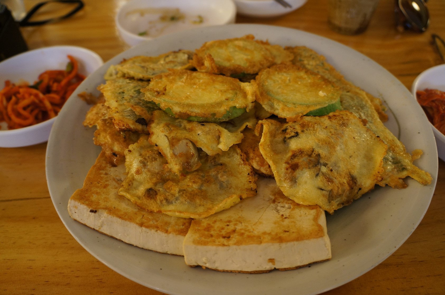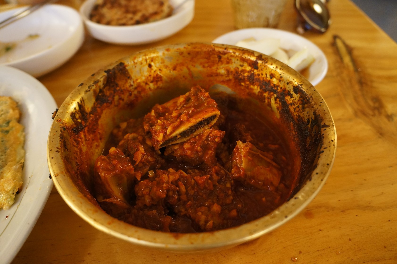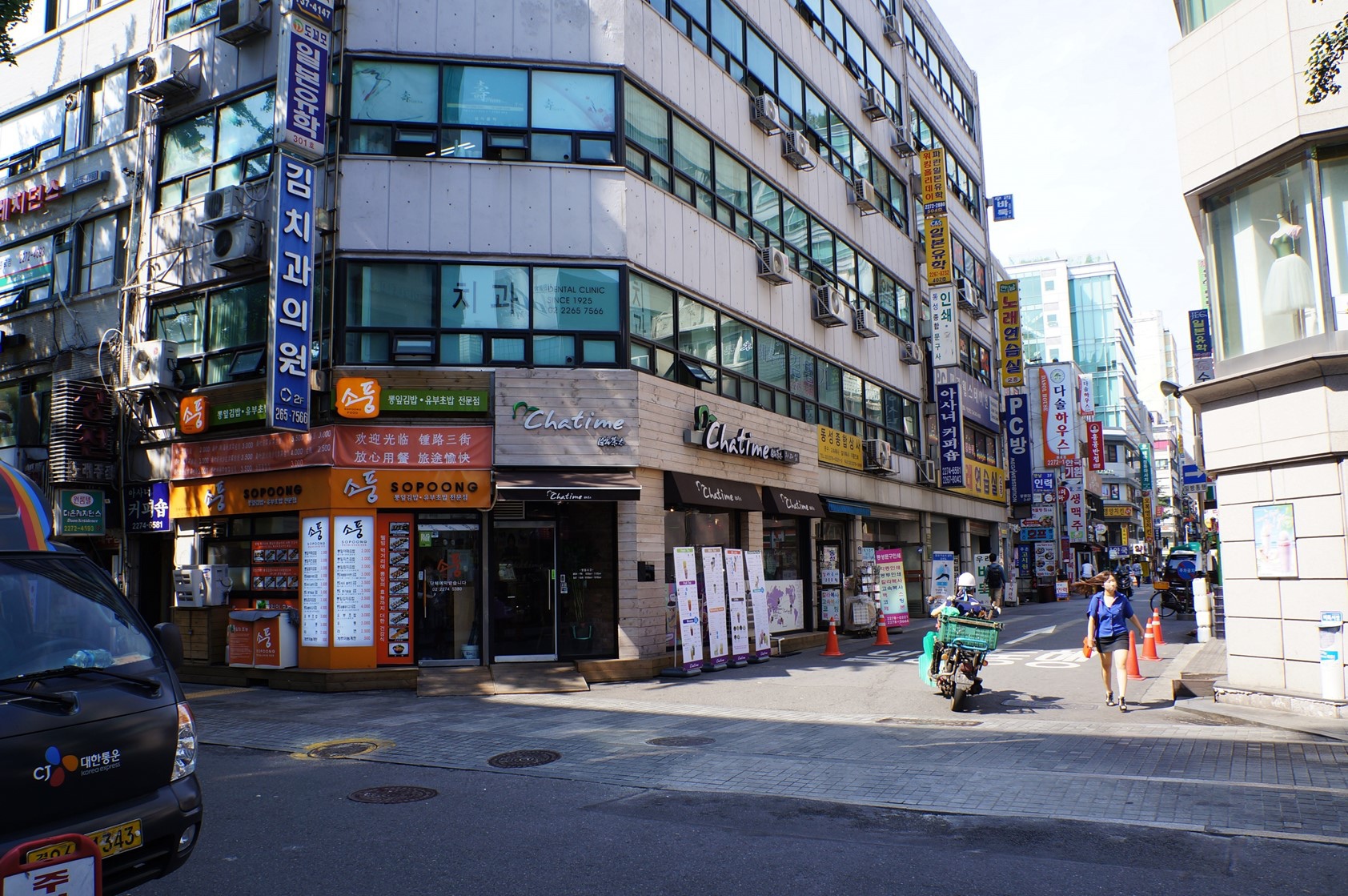 稍微在有名的狎鷗亭大街上逛逛,不過因為今天真的身體虛,沒甚麼力氣逛街,網路上找了間有人推薦新沙小吃동인동,循著路線走去,找到了這間吃煎餅的店,店裡一進門川著圍裙的大嬸面帶笑容地正在吃飯,我還以為他們休息呢,她親切的叫我進去,頓時對這家店印象不錯。點菜的大叔會簡單英文,我們說要點綜合煎餅,還要辣醬牛排骨,他說這樣太多了,但是他可以幫我們坐小份的牛肉,真是很好心耶,有滿足到旅人貪吃又有限的胃,這點跟台灣有點接近,就是蠻有人情味的,要是在日本老闆一定不會這麼有彈性。