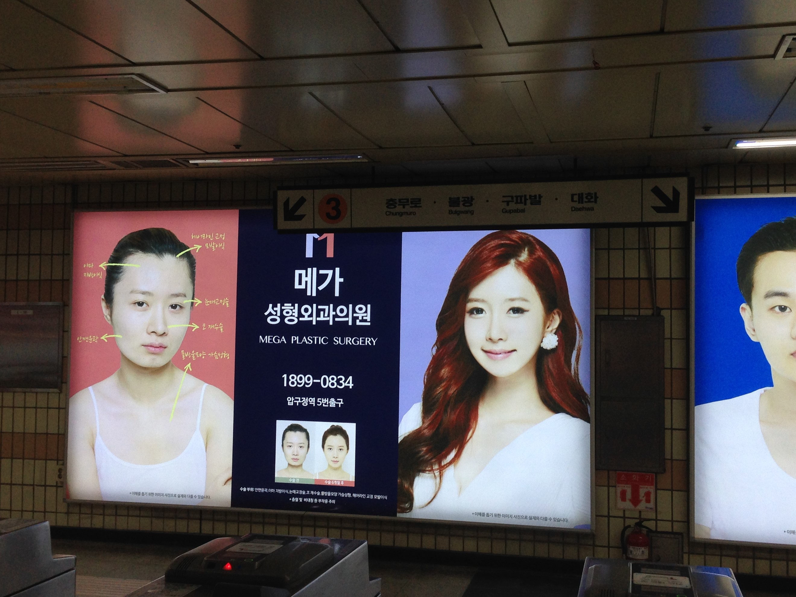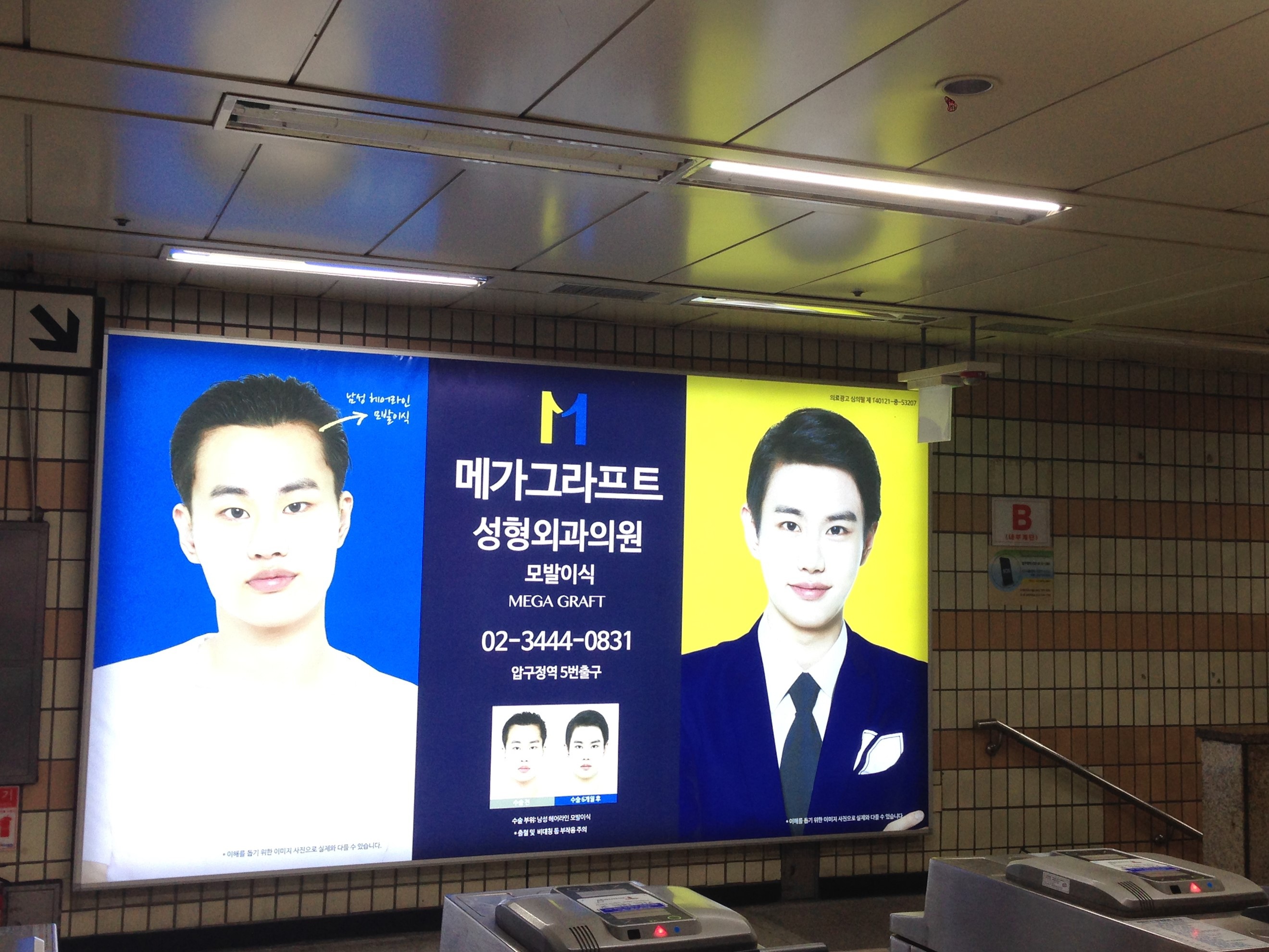 坐地鐵來狎鷗亭,地鐵站馬上就有感覺是整形診所大本營,許多整形前後的照片,不知是我們太敏感還是真是如此,看到幾個女生單眼蒙起來,帶著像是針眼還是甚麼在治療一樣的眼罩在街上走著,我們猜那會不會是做眼睛整形,先做一眼再做另一眼? 想想可能是我們太愛亂猜,人家可能只是眼睛受傷啦!