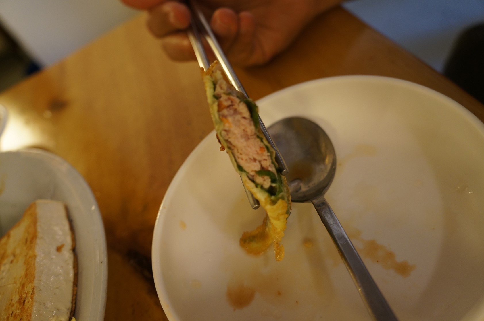 煎餅一上來我們就昏了,這根本是四人份吧…硬著頭皮猛吃,原來有不同口味,有蚵仔煎餅,很像我們的蚵仔煎,但是更原味,還有特別的是芝麻葉包的肉煎餅,葉子果蛋皮煎炸很香,還有一個很大的不知是啥好像是魚肉的煎餅。