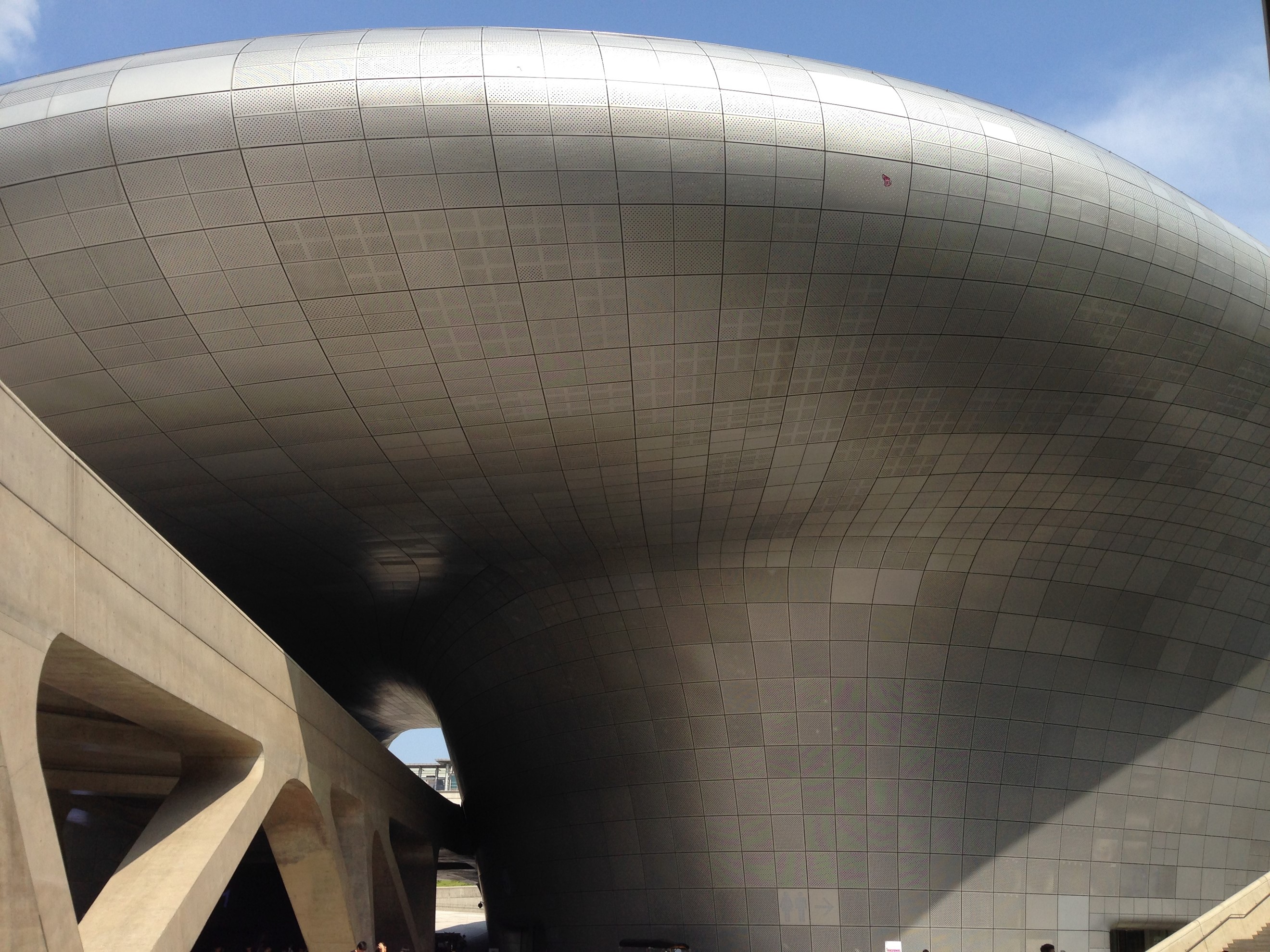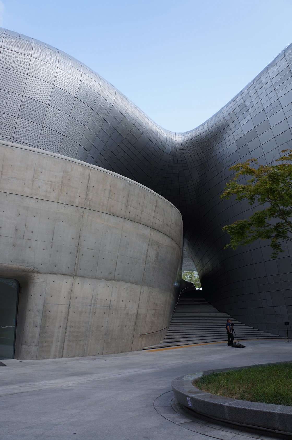 今天是M的生日,我之前就爬文找首爾有特色的餐廳,訂了首爾塔上的餐廳N Grill,五點用餐,所以打算先早點往那區移動,順便去東大門逛逛,一到就看到這很超現實的建築,以前看雜誌介紹Zaha Hadid的這建築時就很震撼,親眼所見真的有種外太空來的異物的感覺。站在前面有種很特殊的感受,有點詭異又有點敬畏,廣場的空間人很多卻不吵雜,更增添了股味道。