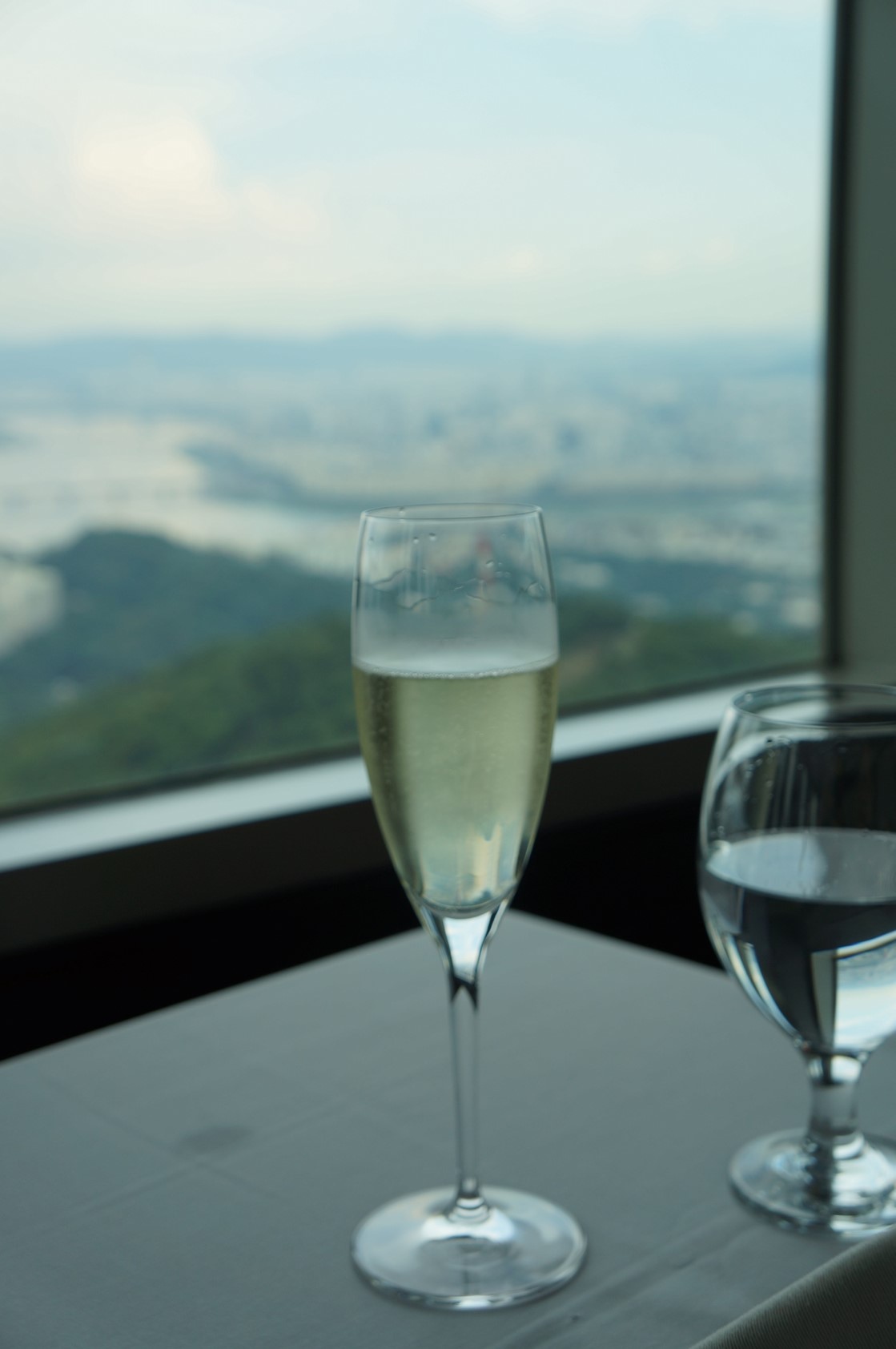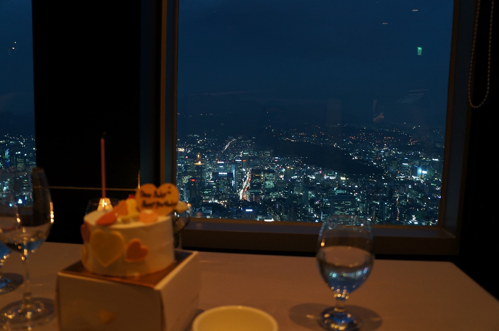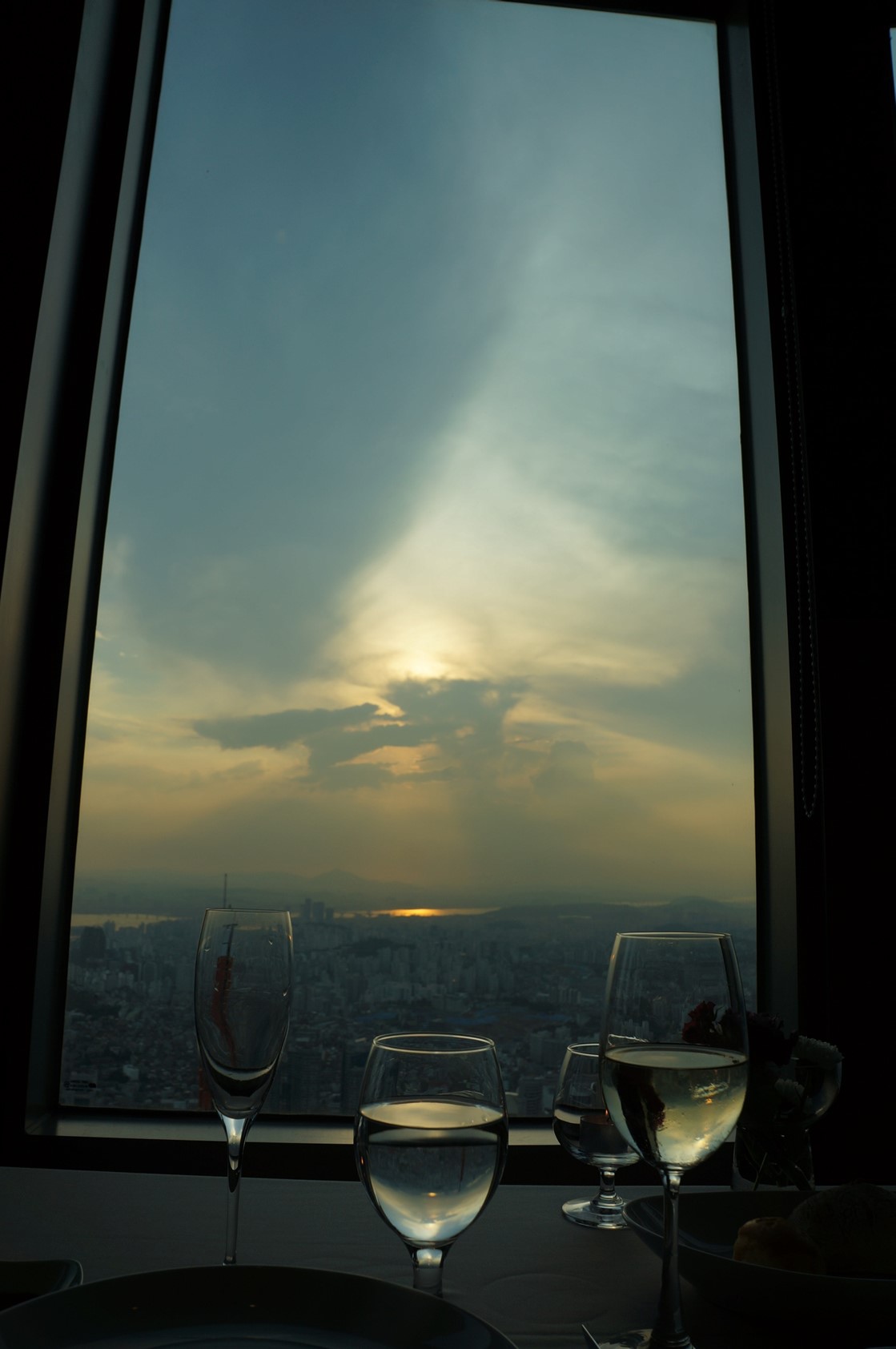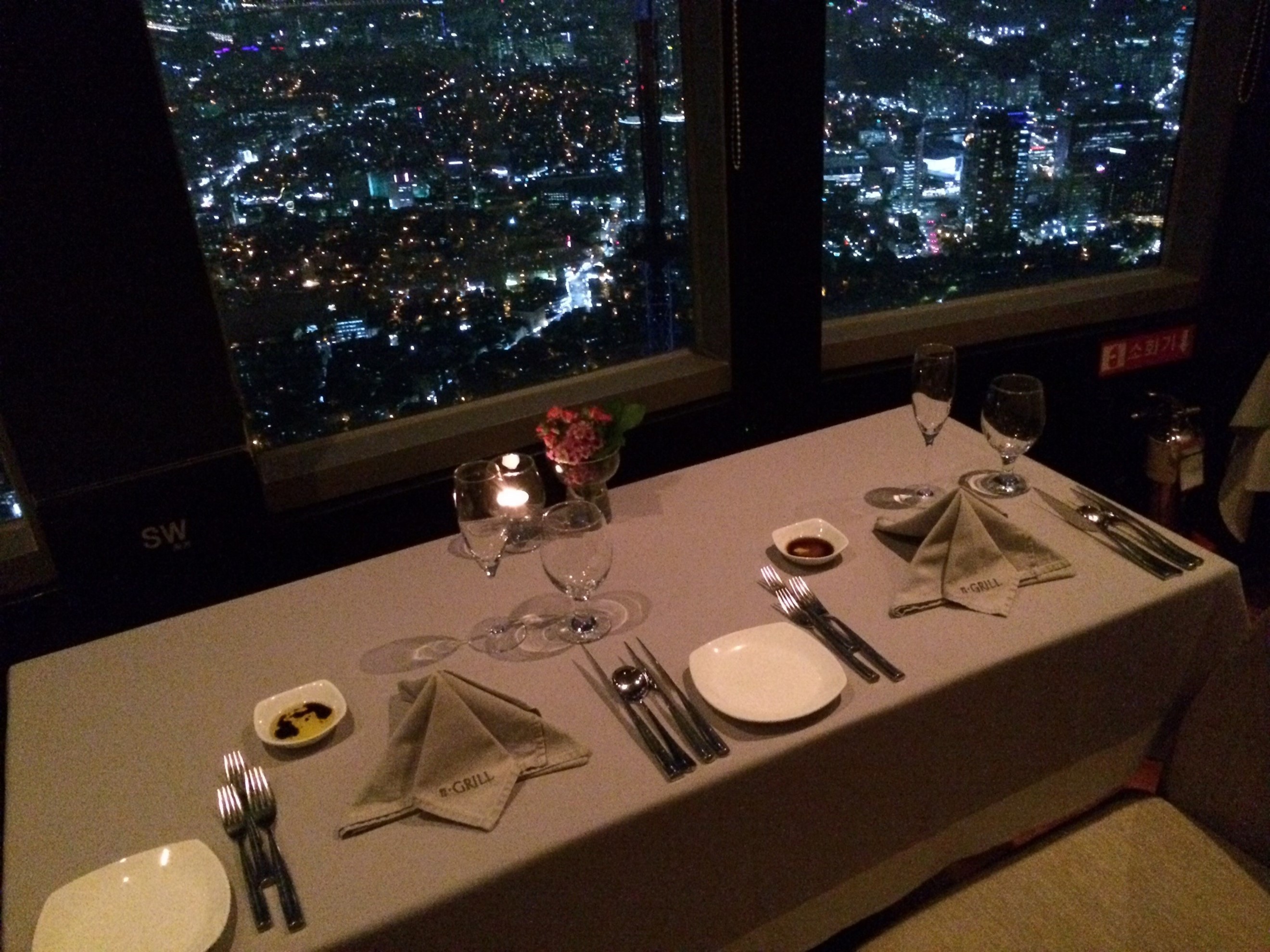 其實來這用餐蠻麻煩的,計程車和私家車都不准上來南山,我們被建議去忠武路站前坐公車,結果一路堵車,到了南山公園才順暢起來,下車後居然還要走一段上坡路,要是盛裝出席的人這時已經昏了。好不容易走到,確認了訂位,拿了免費票乘搭電梯上去頂樓餐廳,天還未暗,視野很好,坐下才發現真的在旋轉耶,蠻酷的。