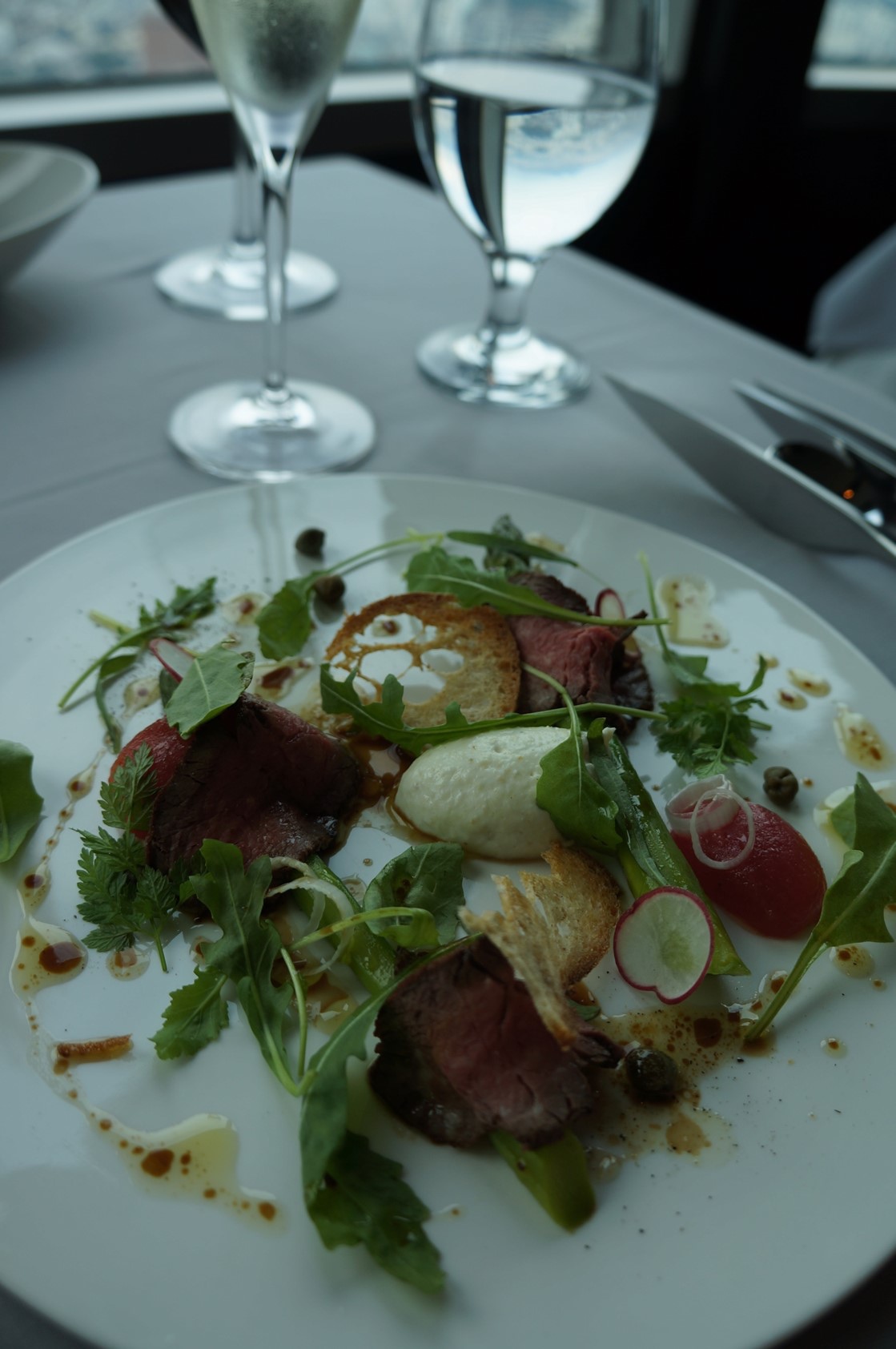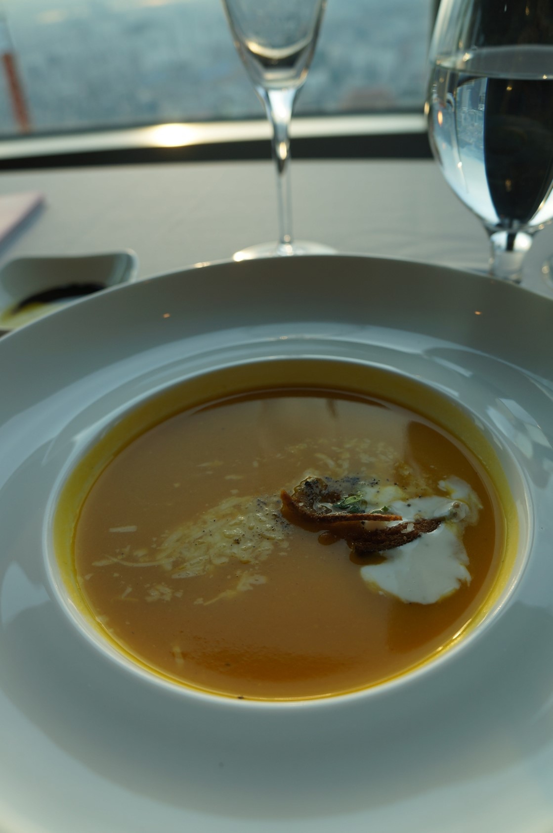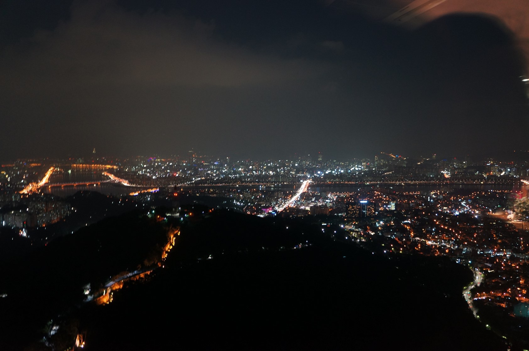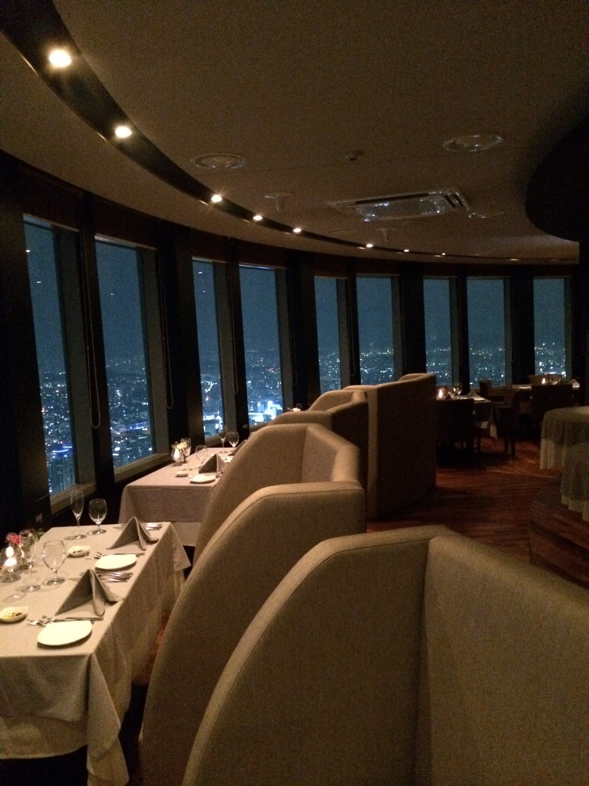 其實來這用餐蠻麻煩的,計程車和私家車都不准上來南山,我們被建議去忠武路站前坐公車,結果一路堵車,到了南山公園才順暢起來,下車後居然還要走一段上坡路,要是盛裝出席的人這時已經昏了。好不容易走到,確認了訂位,拿了免費票乘搭電梯上去頂樓餐廳,天還未暗,視野很好,坐下才發現真的在旋轉耶,蠻酷的。