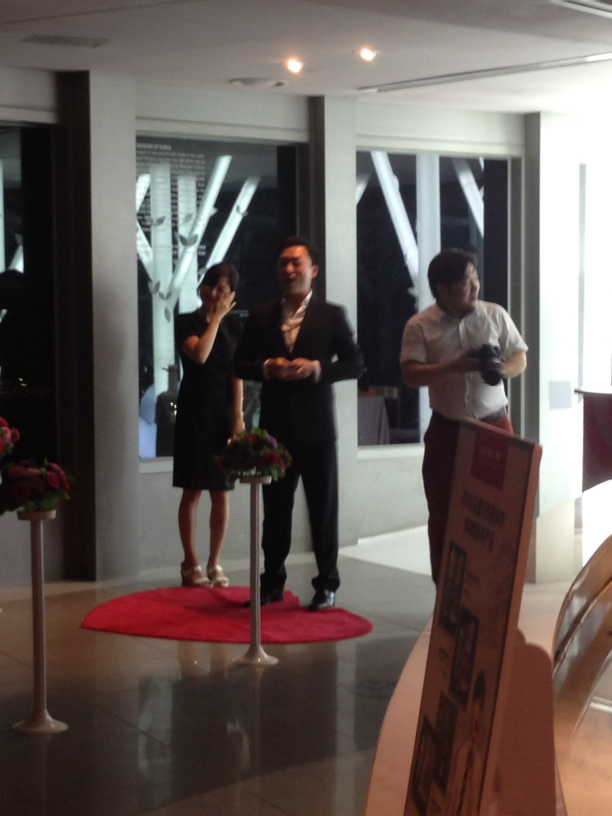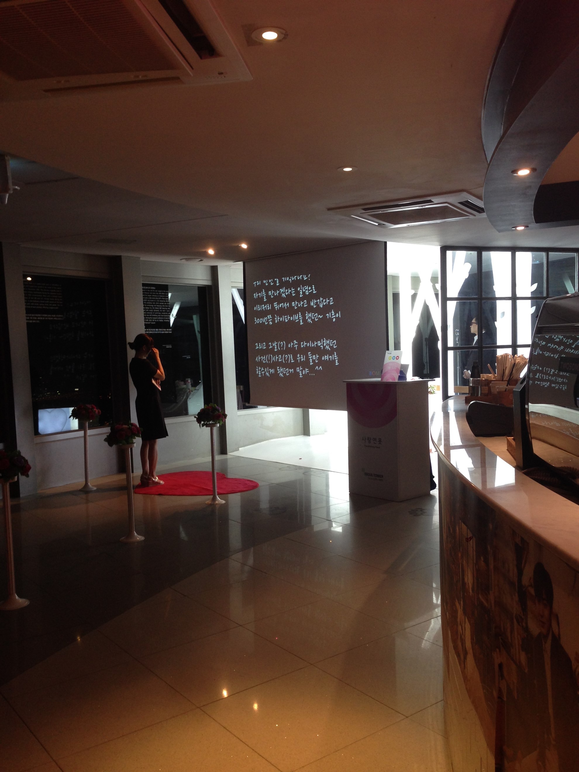 女生很像很驚訝的望著投影的螢幕,上面打了很多字,配上Yimura的鋼琴配樂,很抒情感人,雖然不知道寫些甚麼,看到女生開始不停的擦眼淚,男生站在螢幕的另一邊,好像在等待女生看完。後來男生開始唱歌耶,在大家的注視下就這樣很穩重的唱了一首抒情歌,還很有架式跟台風,唱得也不差,莫非韓國許多人都有做過明星準備?