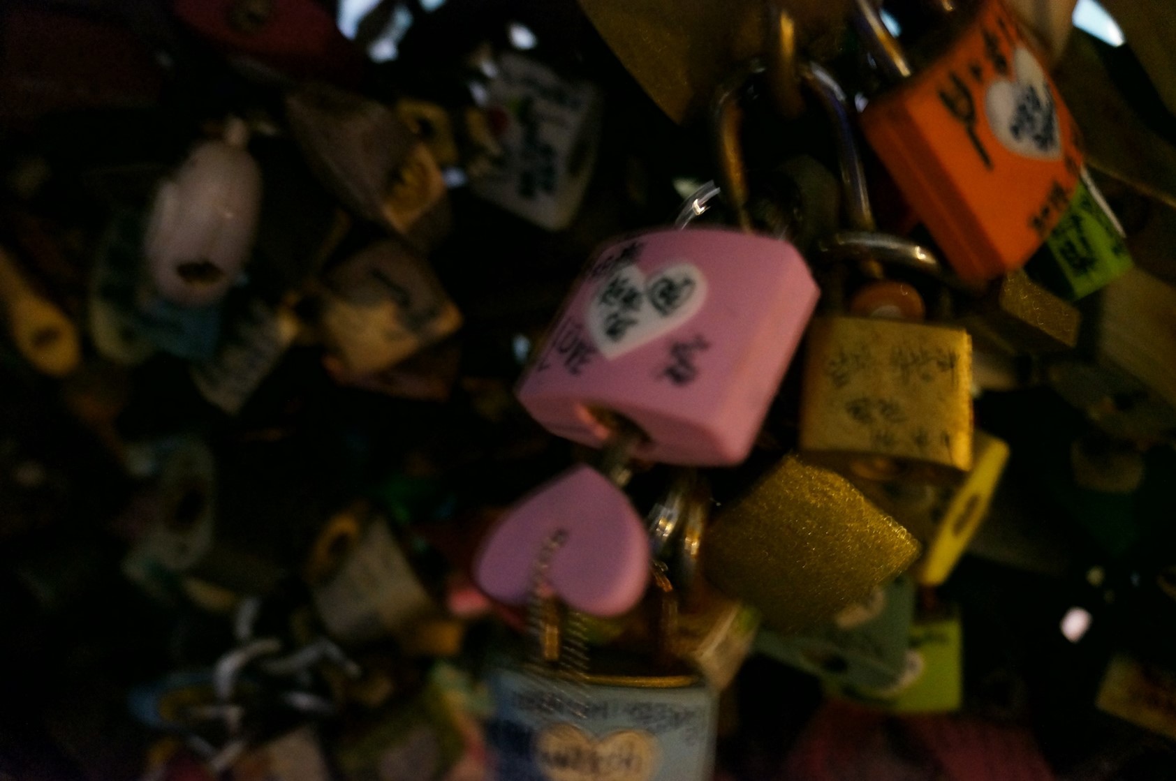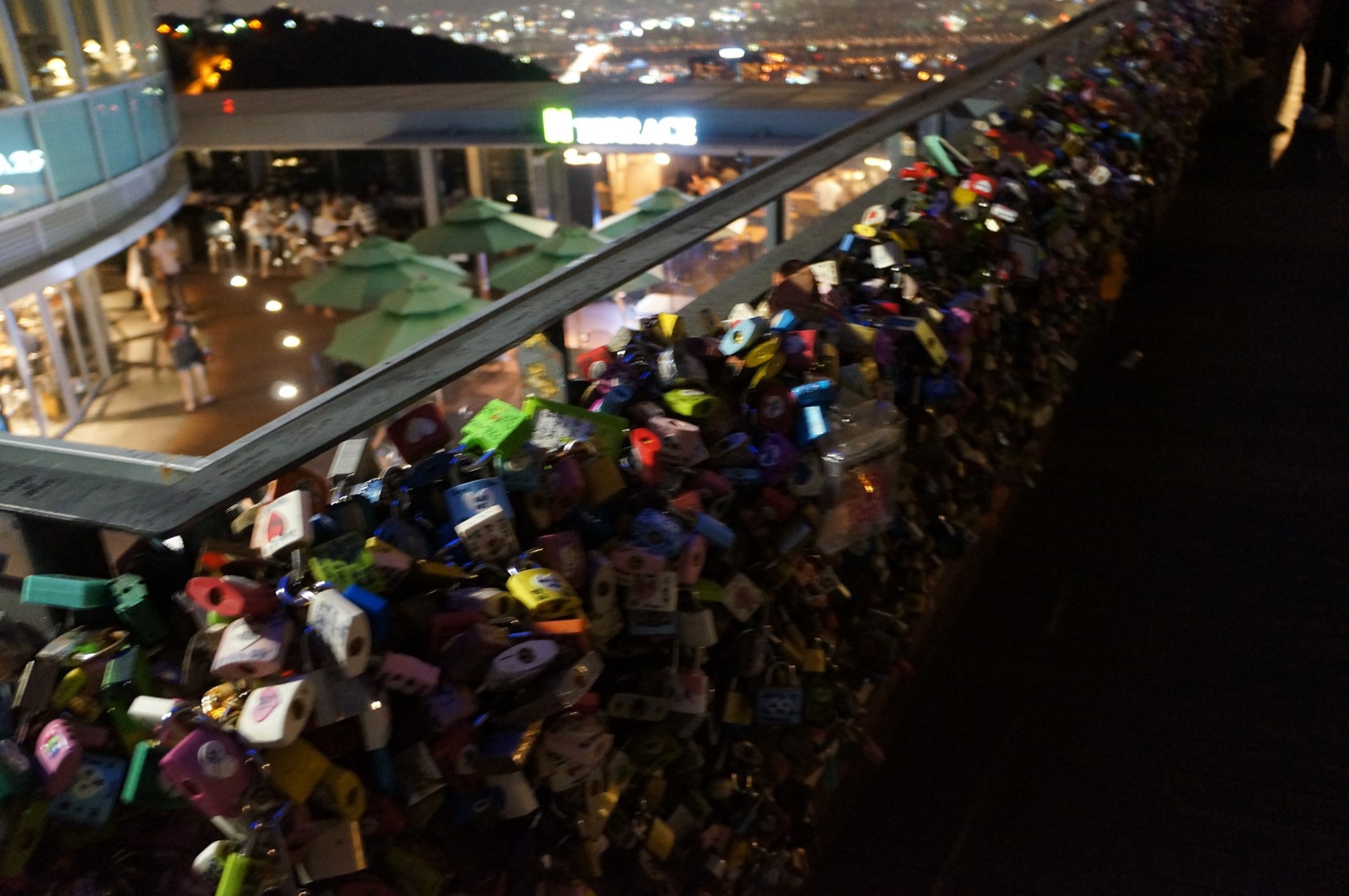 又是另一個韓劇洗腦的例子,我其實有點忘了原來"星星"有此劇情,就是最後男女主角在南山塔上鎖上兩人的鎖,並把鑰匙丟掉,象徵兩人從此所在一起,吃完飯逛完觀景台到樓下,很多人都在這一區上鎖,我們也"不免俗"的買了鎖,還附送一個油性筆,寫了肉麻話在鎖上面,選了個好位子鎖起來,這片鎖牆真是很壯觀阿。