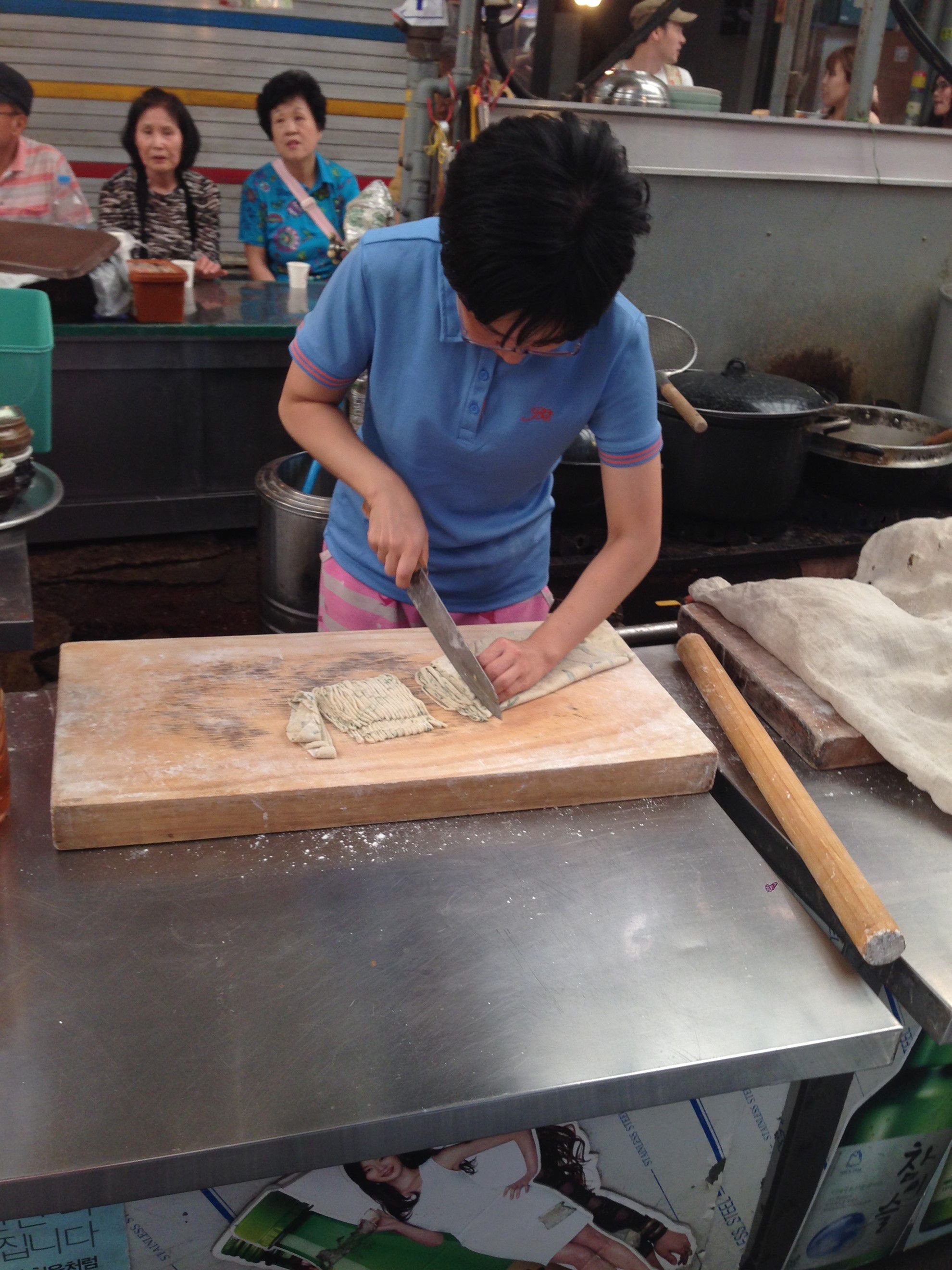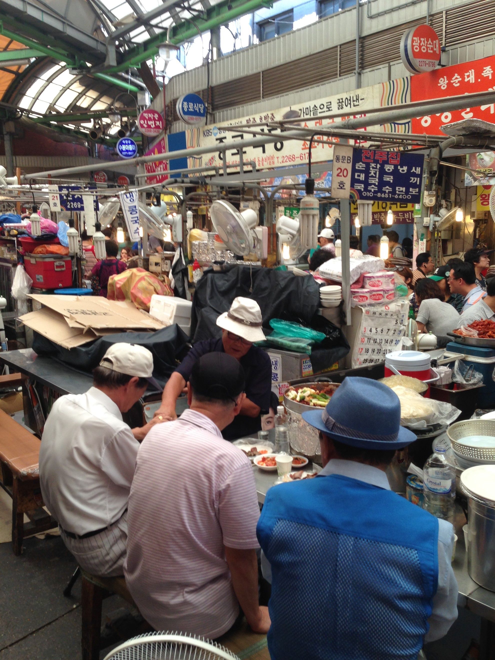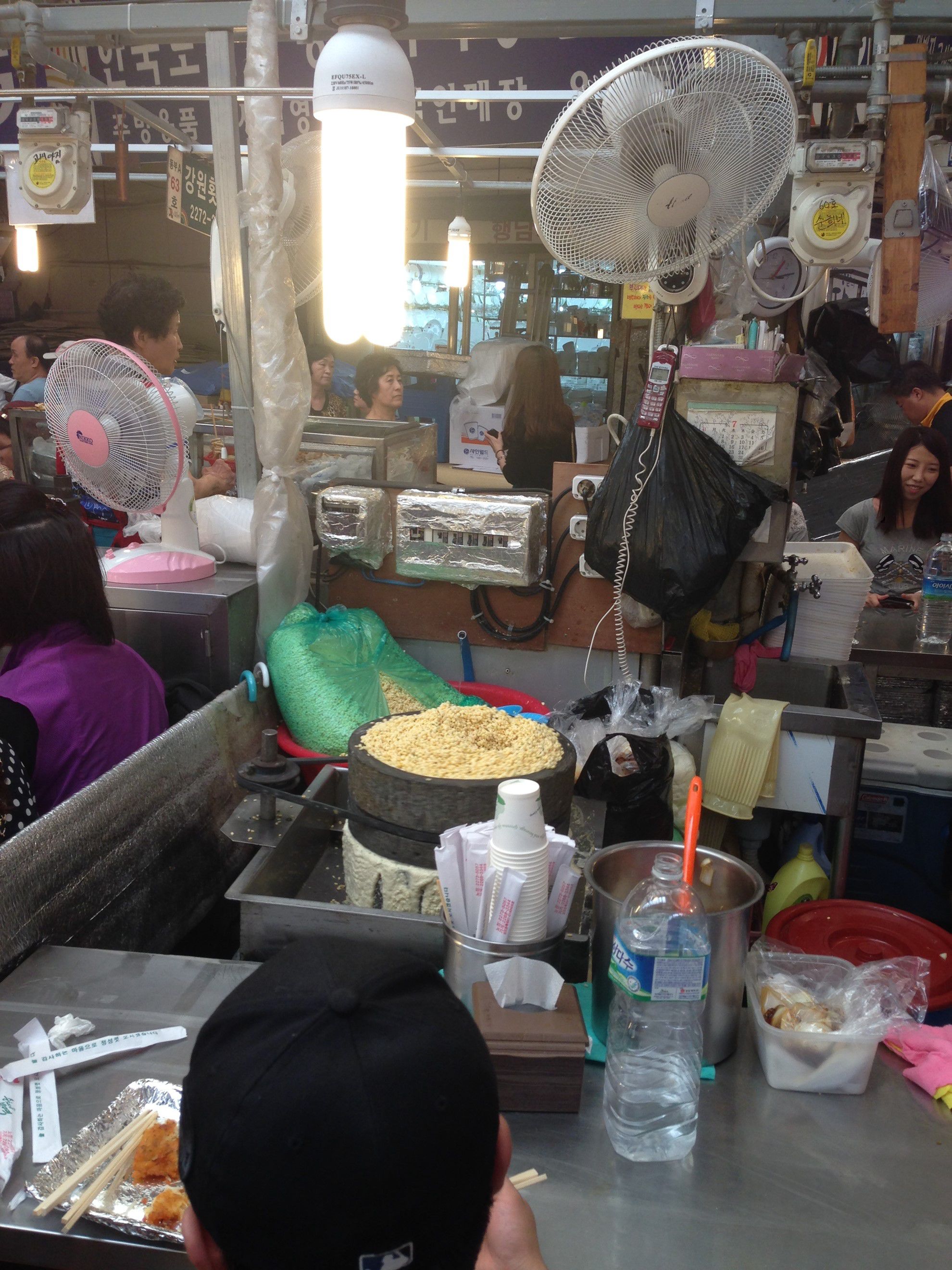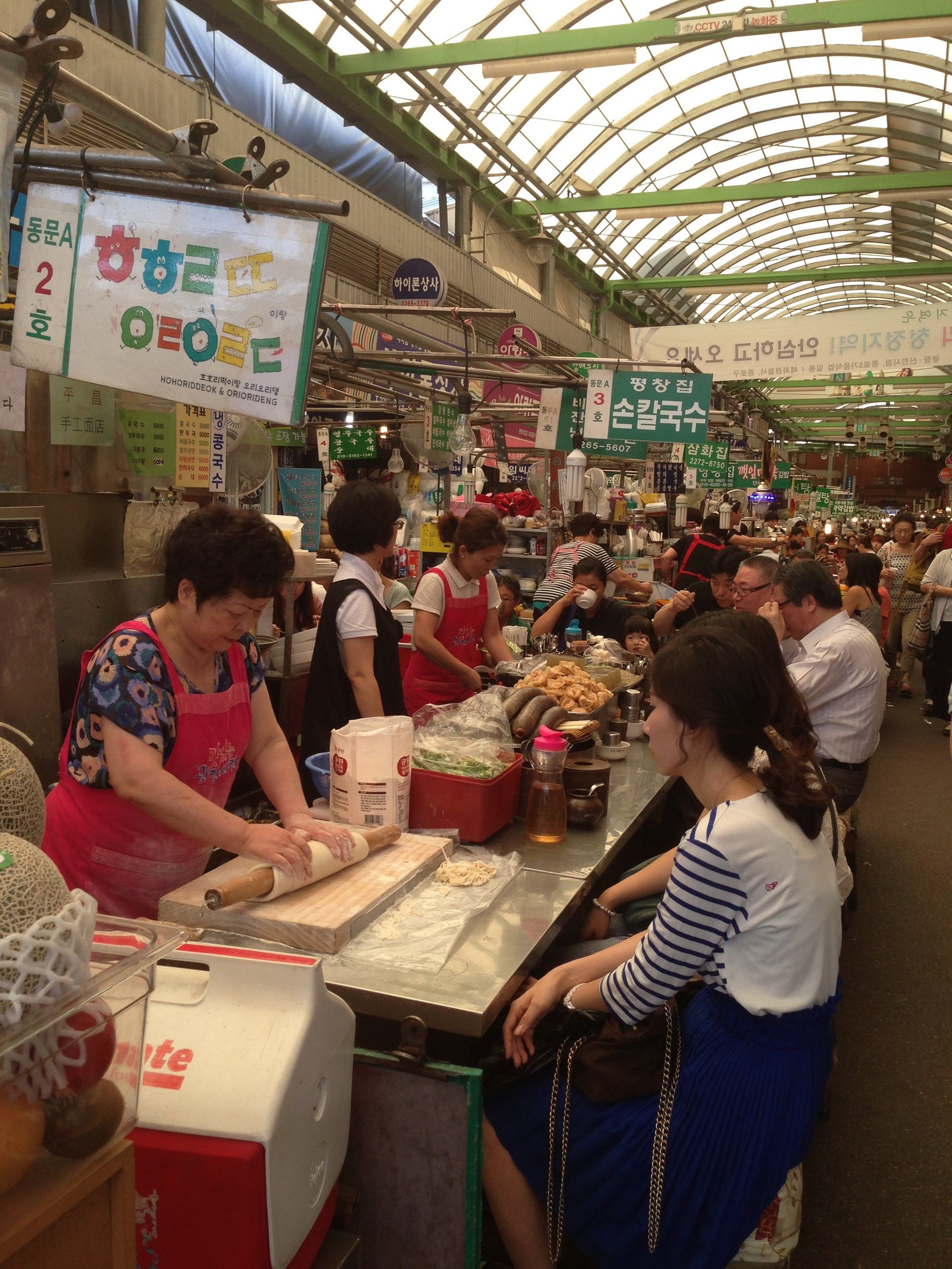 這天早上慢慢的爬起來,實在很懶得出門,M去樓下幫我買了杯咖啡,我才悠悠的梳洗出門,想到可以去廣藏小吃街吃早餐,馬上上網查一下,也好多人介紹必吃的東西,沒多看就先去再說,果真是精彩的不得了啊! 基本上這是個綜合的市場,有賣現做小吃的,也有賣布料、用品、生鮮食材的,我們從北二門進入,馬上就是精彩的小吃區,人很多觀光客也超多,到處都是講中文的人客,大都數的菜單上都會有中文翻譯,連我們坐下來吃麵的店家也有大嬸是講中文的,韓國的中文化真是很驚人啊!