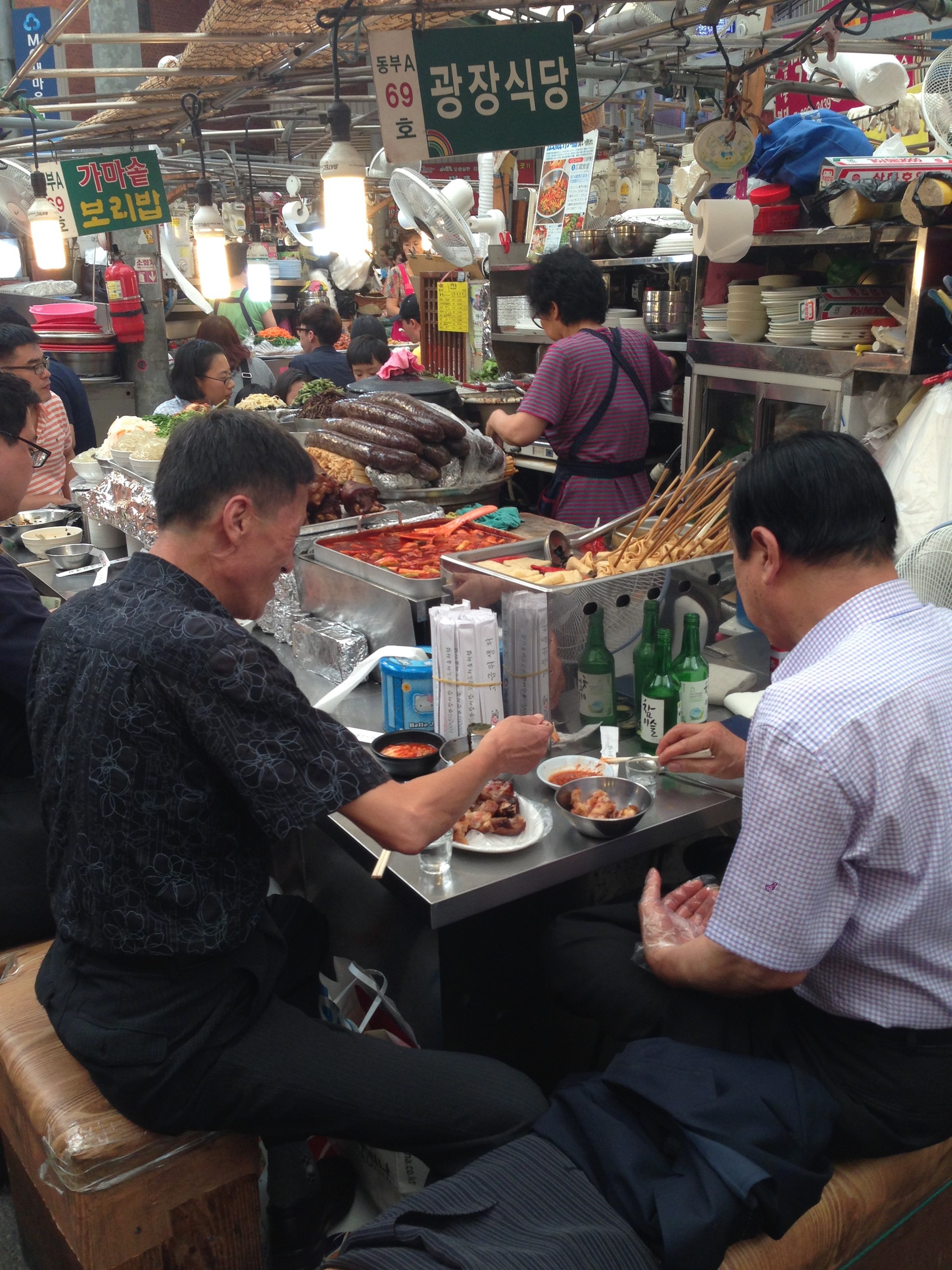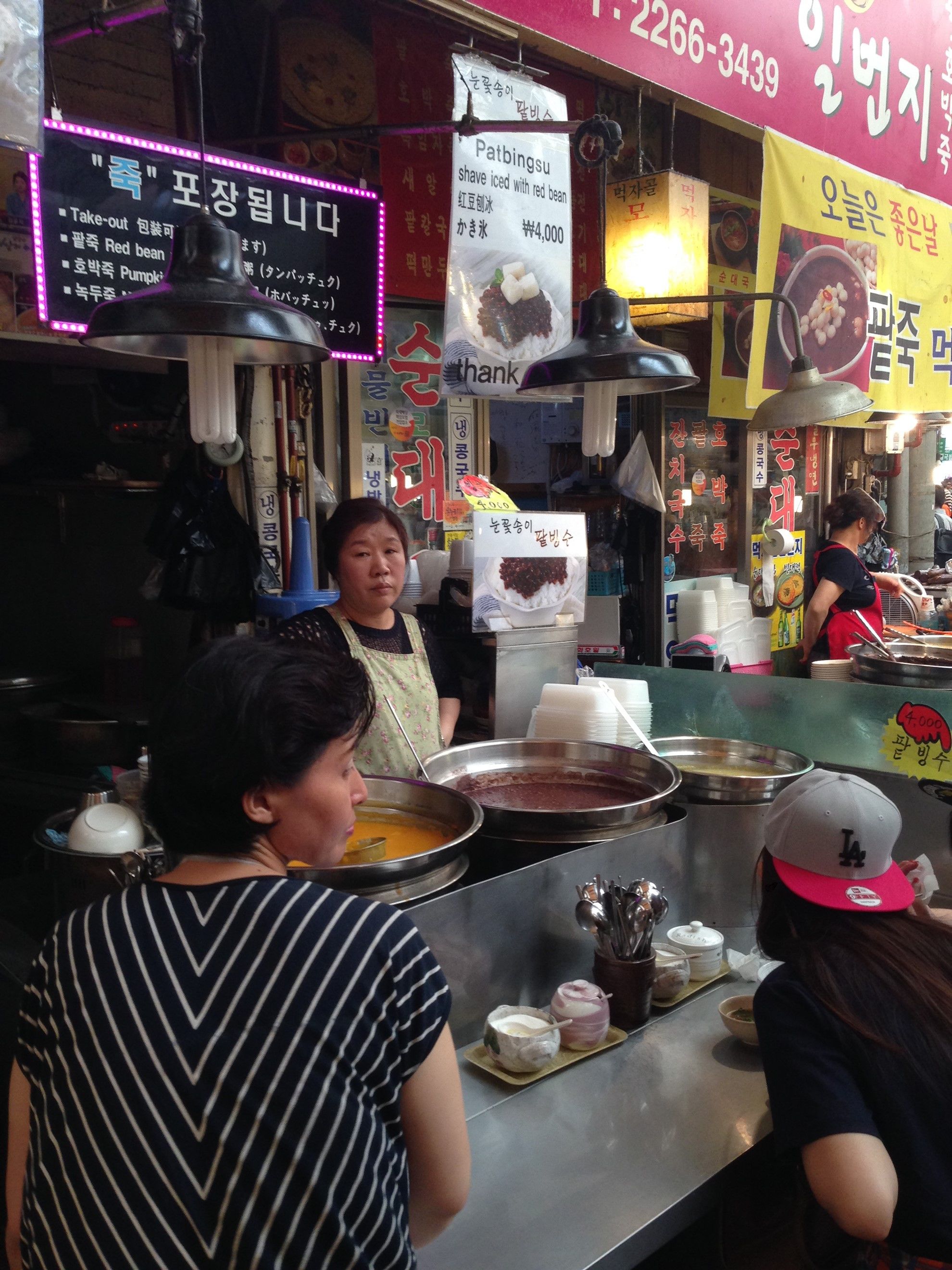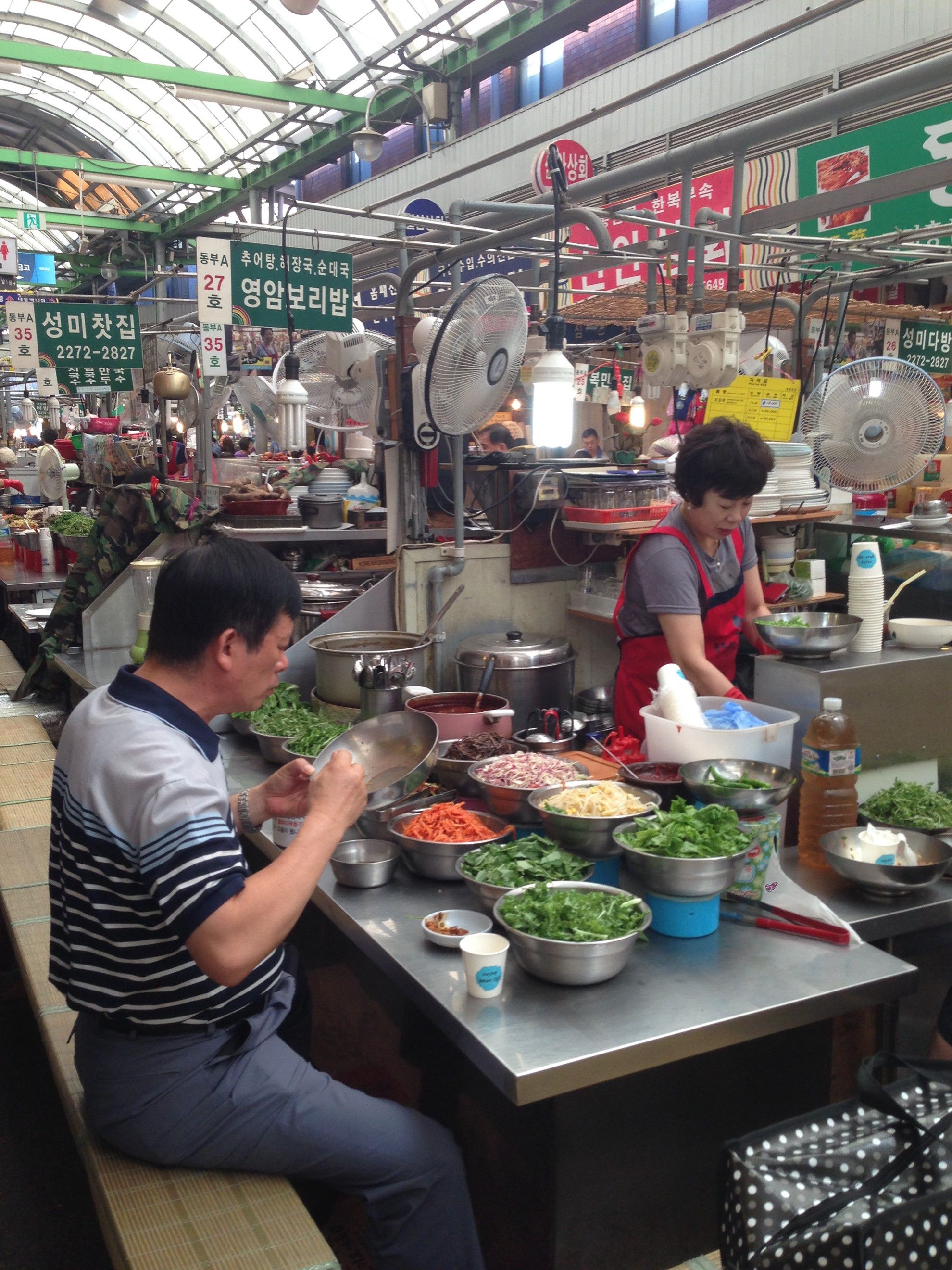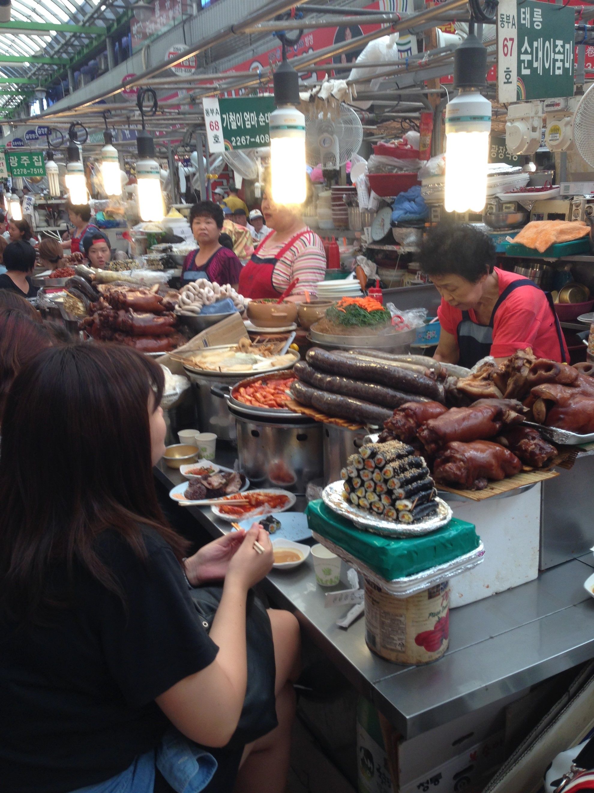 這天早上慢慢的爬起來,實在很懶得出門,M去樓下幫我買了杯咖啡,我才悠悠的梳洗出門,想到可以去廣藏小吃街吃早餐,馬上上網查一下,也好多人介紹必吃的東西,沒多看就先去再說,果真是精彩的不得了啊! 基本上這是個綜合的市場,有賣現做小吃的,也有賣布料、用品、生鮮食材的,我們從北二門進入,馬上就是精彩的小吃區,人很多觀光客也超多,到處都是講中文的人客,大都數的菜單上都會有中文翻譯,連我們坐下來吃麵的店家也有大嬸是講中文的,韓國的中文化真是很驚人啊!
