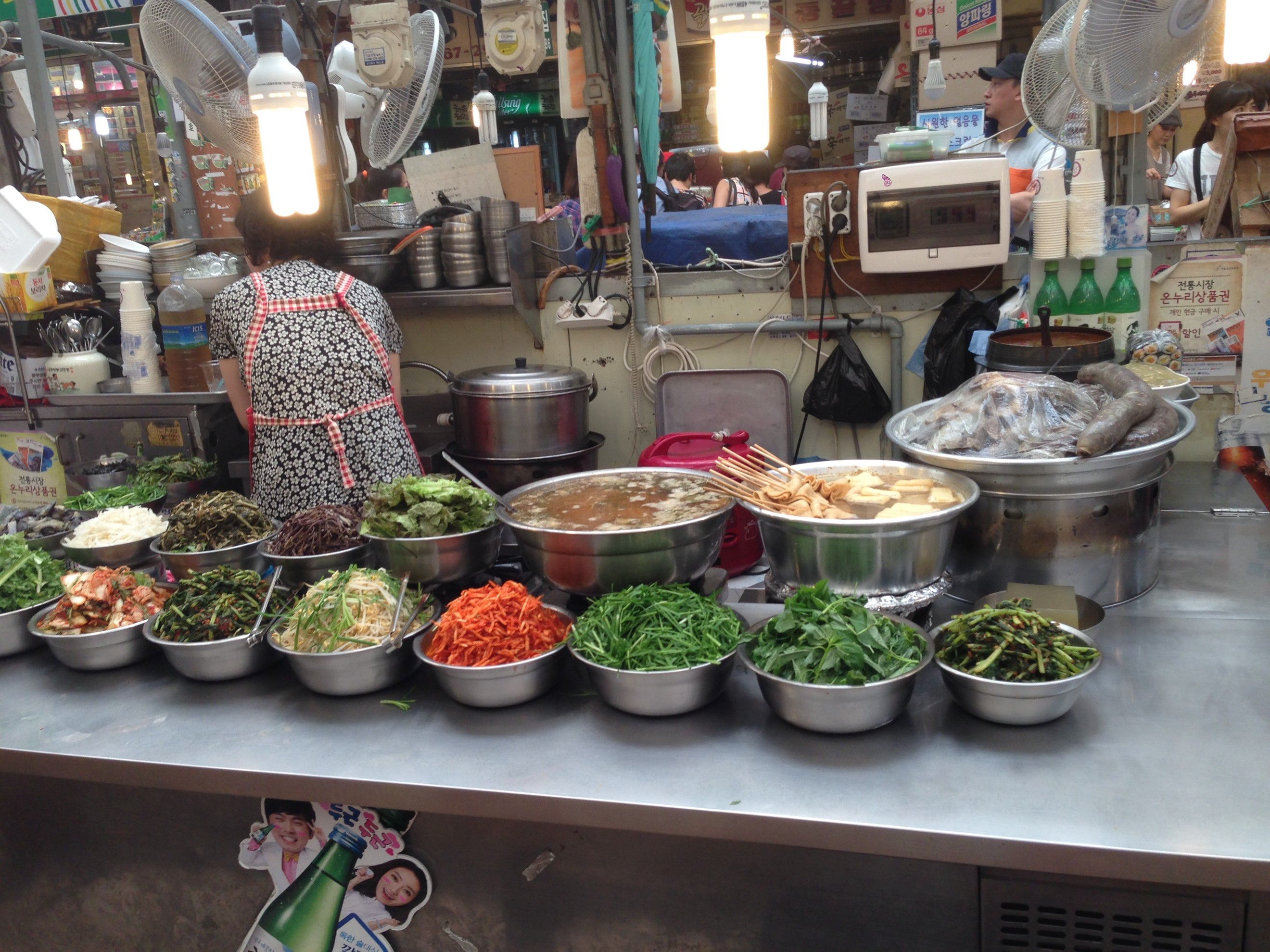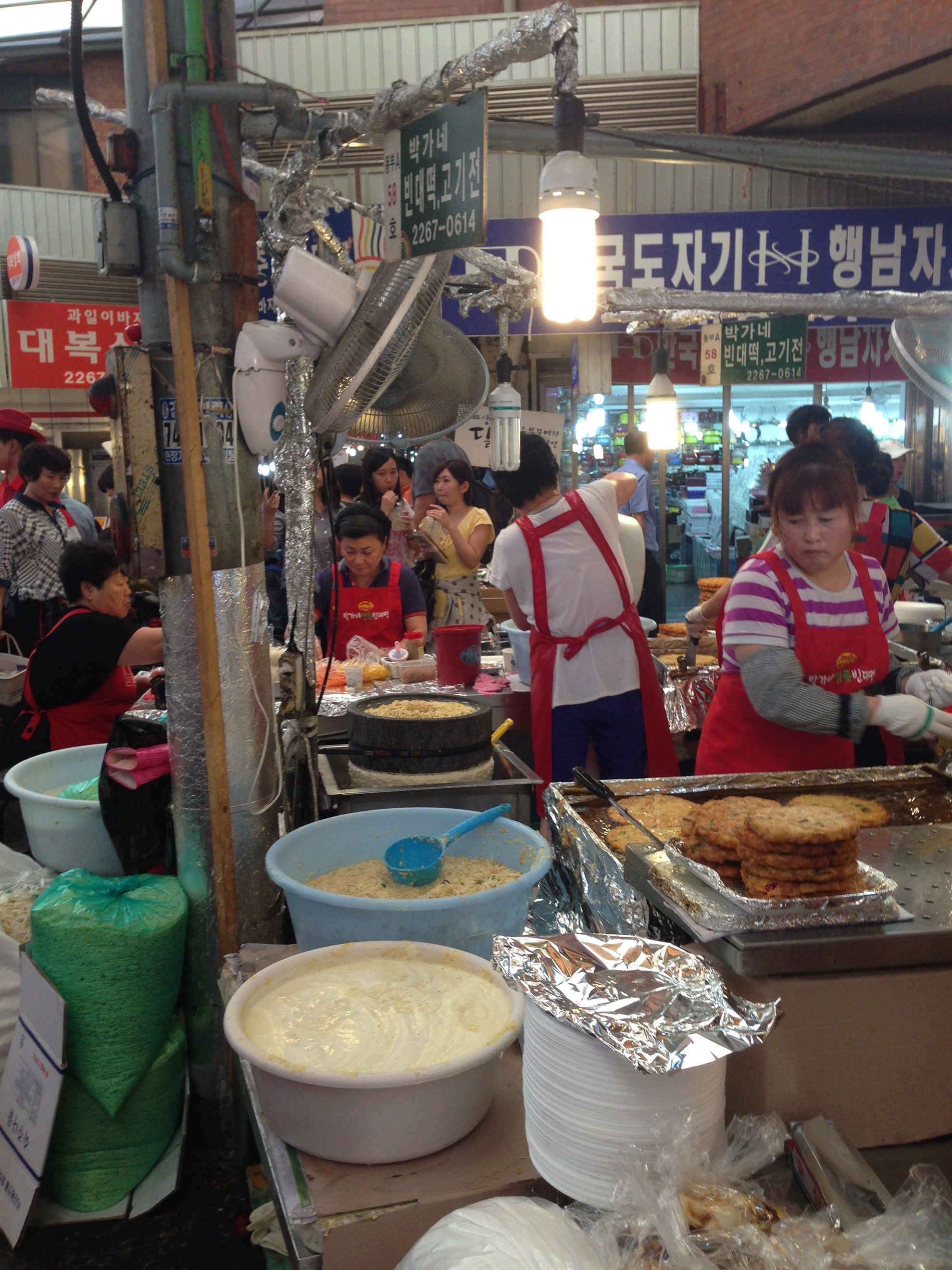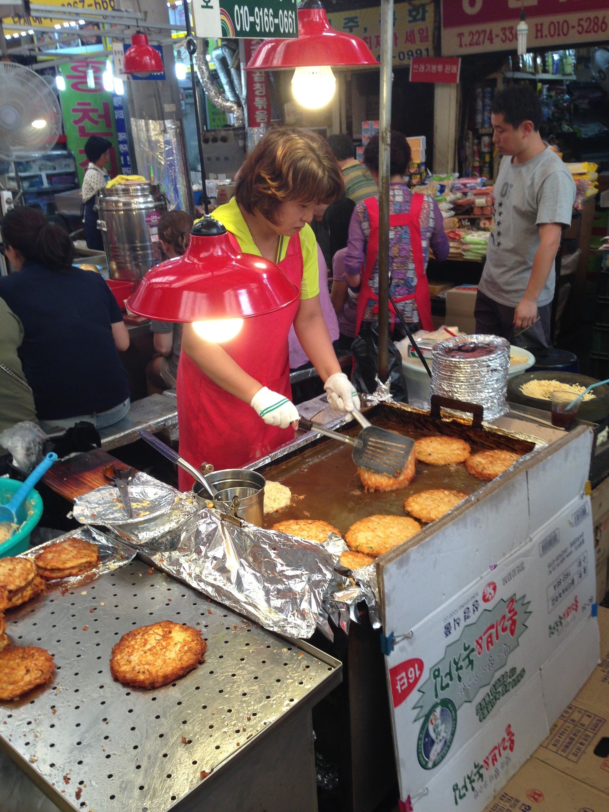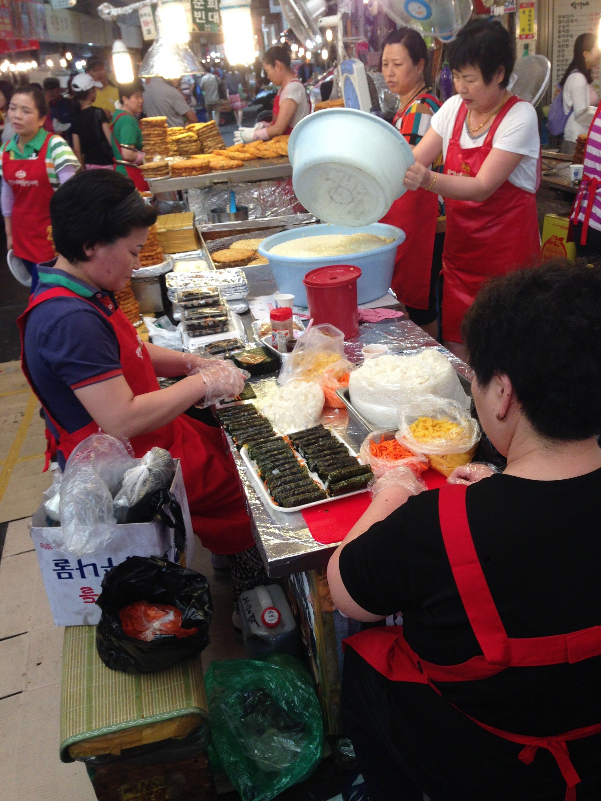 這天早上慢慢的爬起來,實在很懶得出門,M去樓下幫我買了杯咖啡,我才悠悠的梳洗出門,想到可以去廣藏小吃街吃早餐,馬上上網查一下,也好多人介紹必吃的東西,沒多看就先去再說,果真是精彩的不得了啊! 基本上這是個綜合的市場,有賣現做小吃的,也有賣布料、用品、生鮮食材的,我們從北二門進入,馬上就是精彩的小吃區,人很多觀光客也超多,到處都是講中文的人客,大都數的菜單上都會有中文翻譯,連我們坐下來吃麵的店家也有大嬸是講中文的,韓國的中文化真是很驚人啊!
