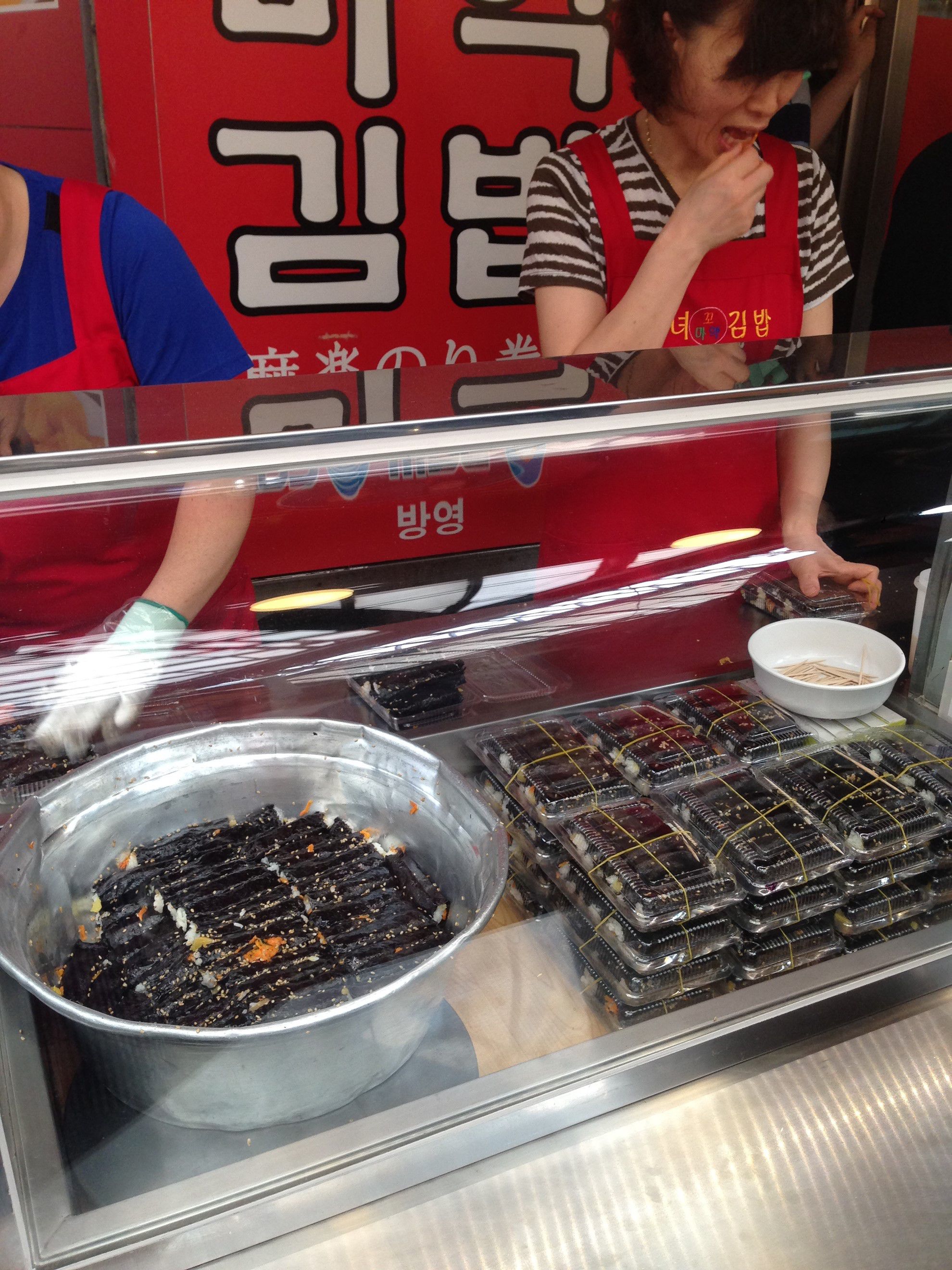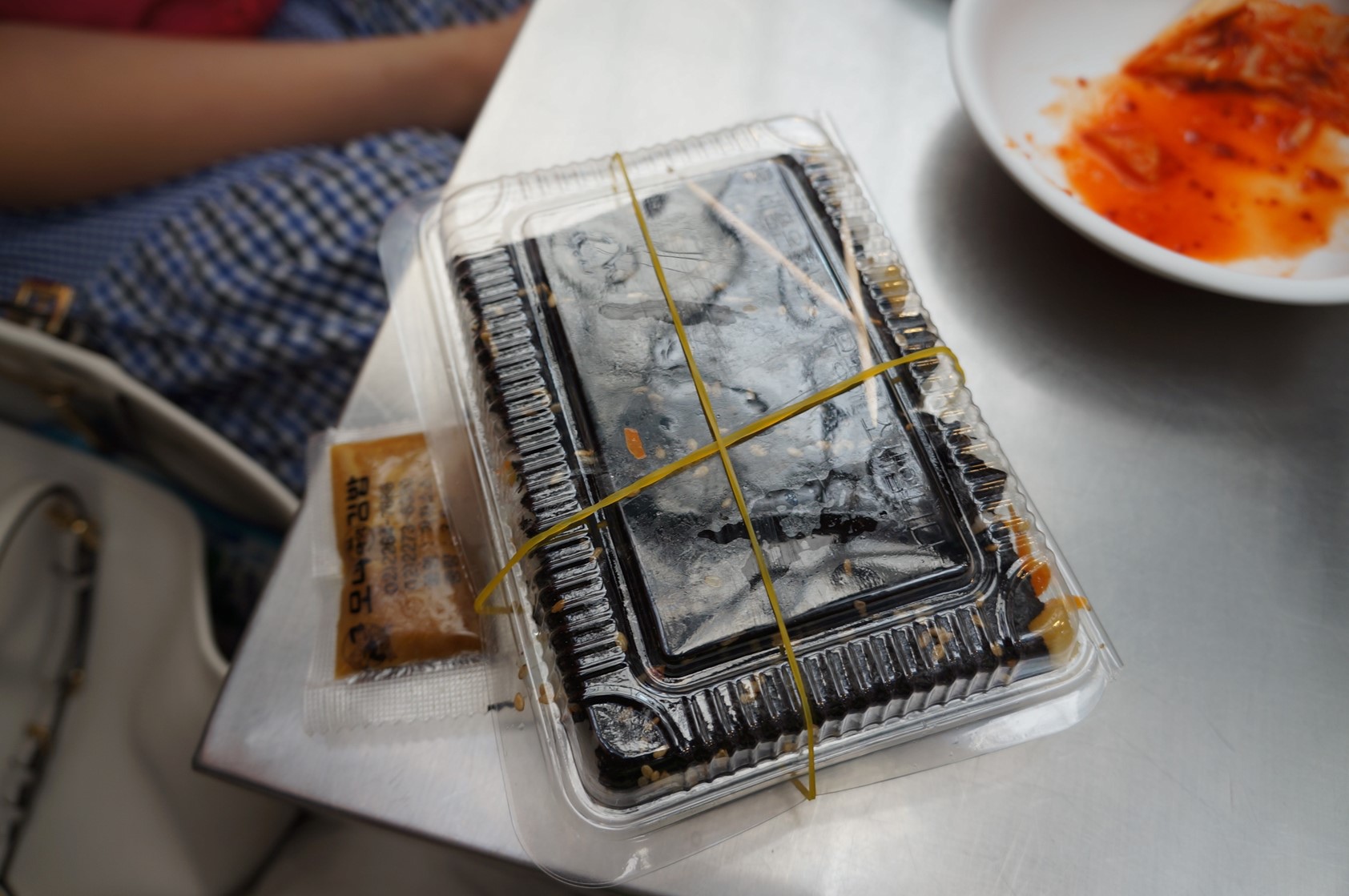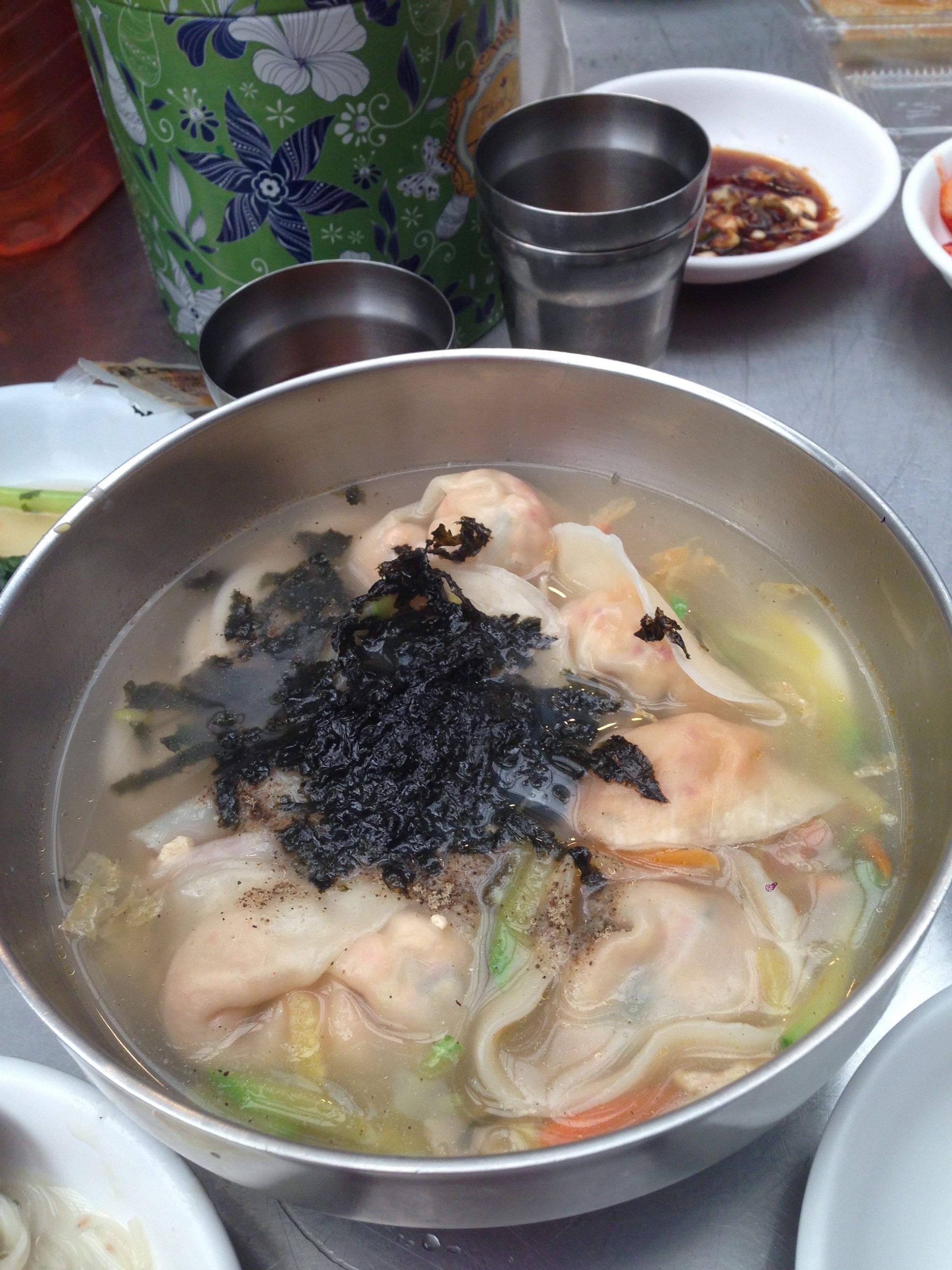 講中文的大嬸好像覺得我們兩人只點一份太少,我們只好又點了一個韓式餃子湯,這樣我們才敢把在別攤買的紫菜捲拿出來吃,很香喔,上面塗了一層麻油,還附了芥末醬