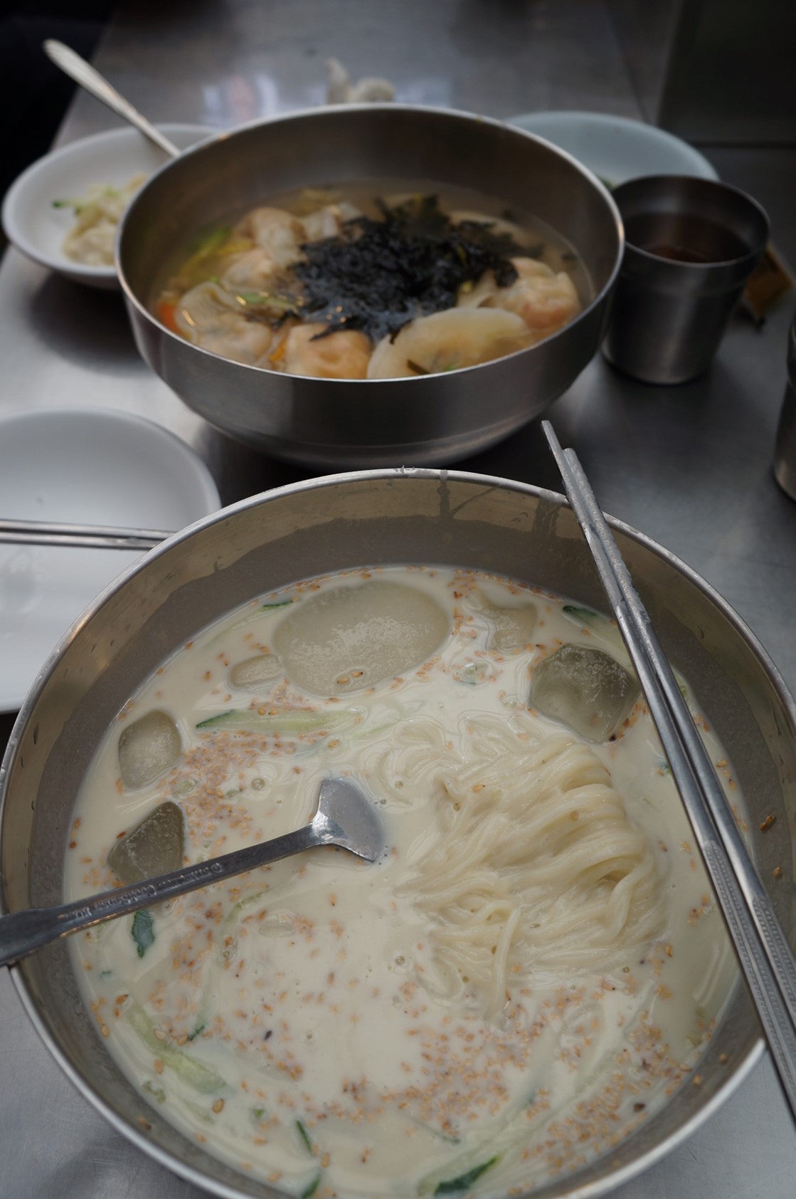 好清爽又健康的豆汁冷麵啊! 湯體真的是濃稠的豆漿,本身是沒有鹹味的,可以自己加入旁邊一瓶醬油和蔥的調味料,不過因為另一盤韓國餃子式泡菜口味偏辣,剛好這晚的湯頭可以解辣,所我我也沒再多調味。