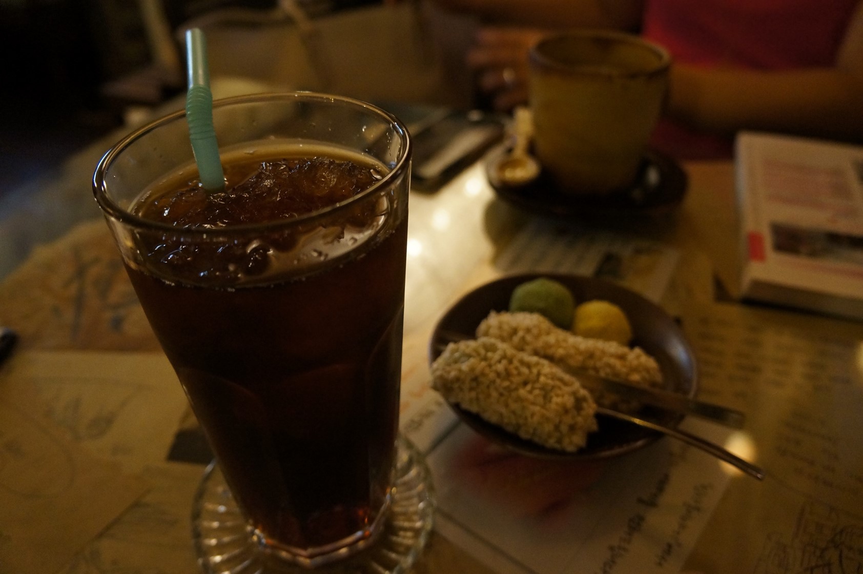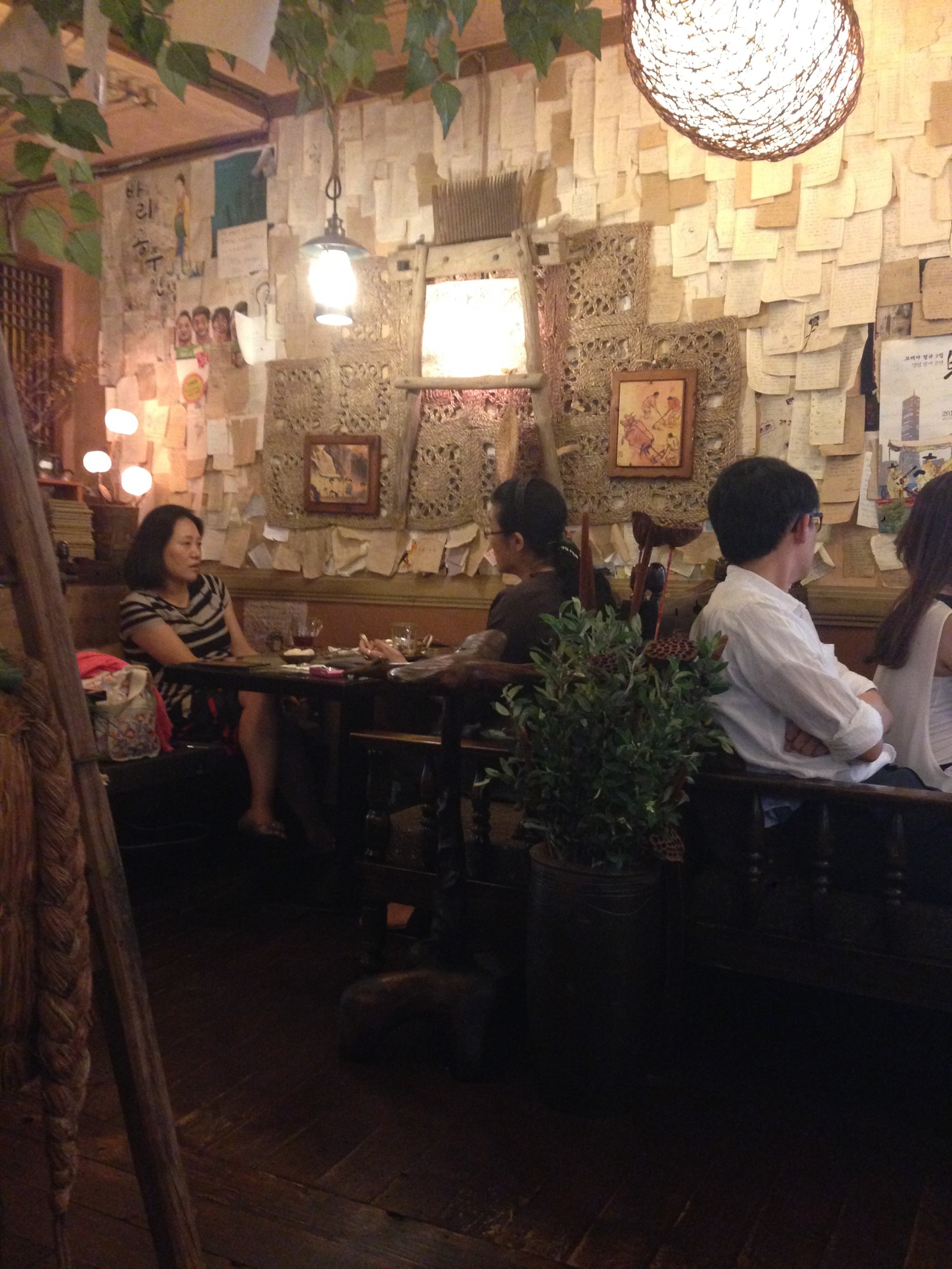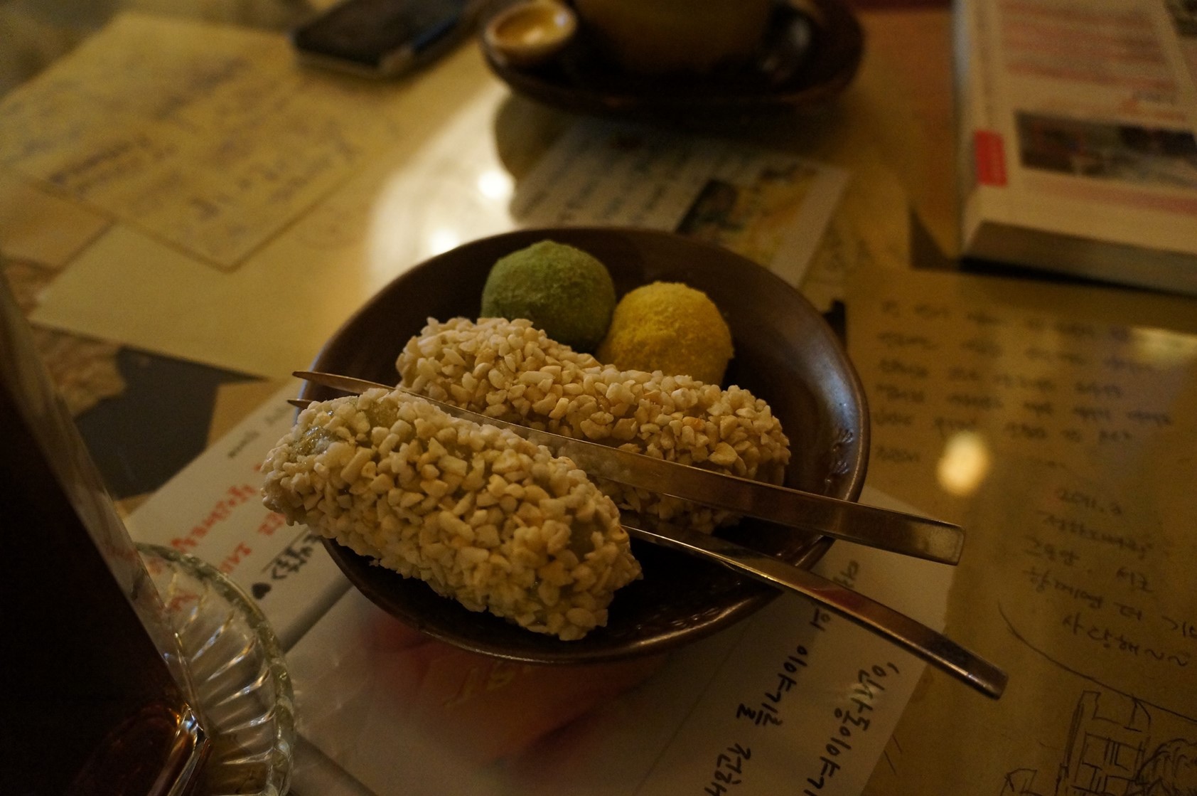 逛完市場,決定先去下午四點看表演的地方,看看有沒有好逛的,便前往鐘路三街,結果也是熱鬧的街區阿,有一整條樂器專賣店,另外還有一條很像西門町的熱鬧街市,大概是可以走到仁寺洞,好多攤販和咖啡店,我們選了一家好像也是有拍過偶像劇的二樓咖啡,坐下來休息一下,我點了一杯薏仁茶,韓國真的是把許多傳統藥材食材都搬上這種咖啡店耶,很養生。還送上一盤傳統點心,很像我們的痲荖,也是油油的,小丸子是麻糬。一個簡單的咖啡店但也好像弄得很認真,每桌都放了一本很像古代書籍的空白書,讓你可以撕下來寫字,然後訂在旁邊牆上,所以身邊都是過去的旅人在這邊留下的文字,是個很妙的氛圍。