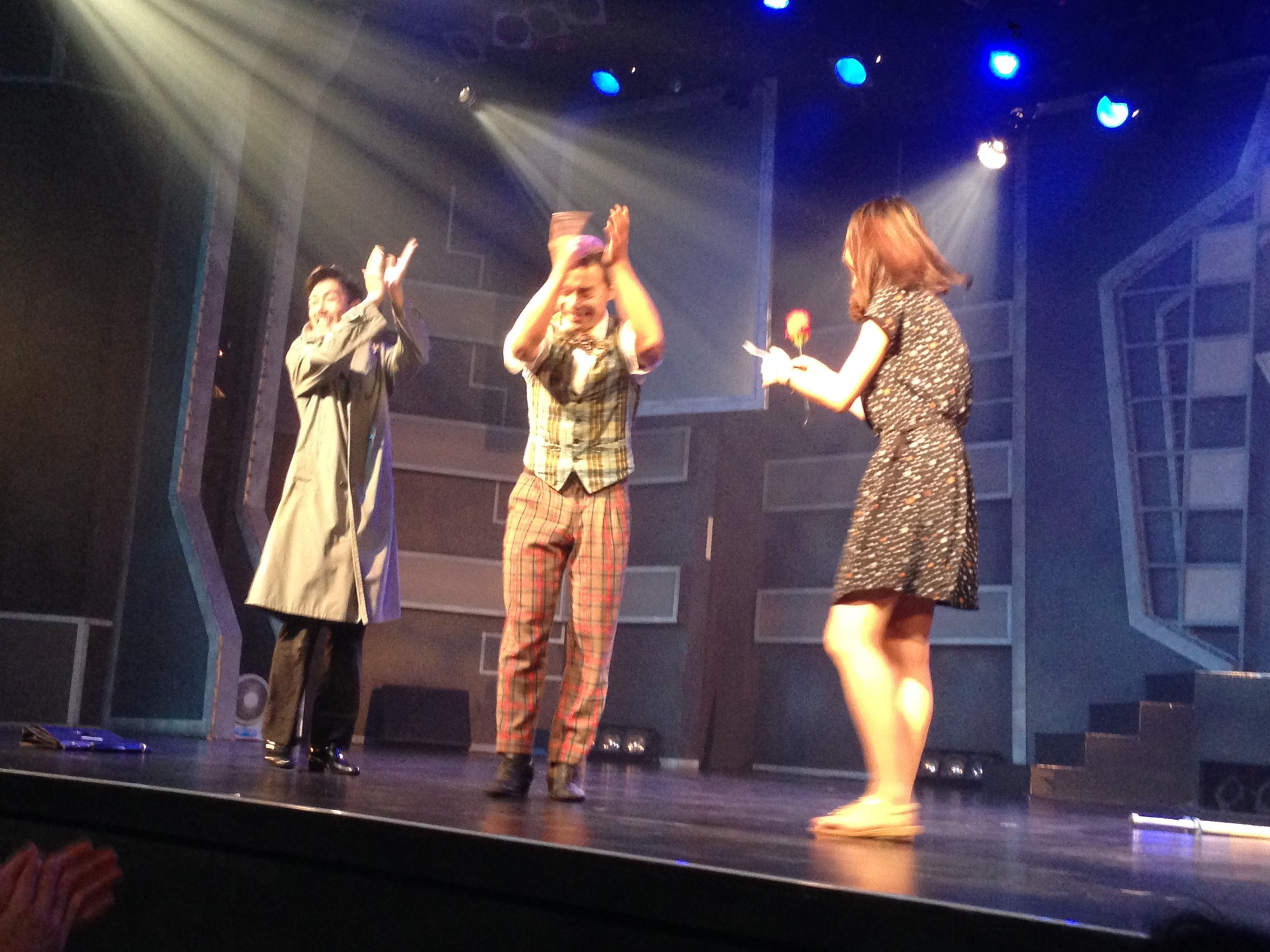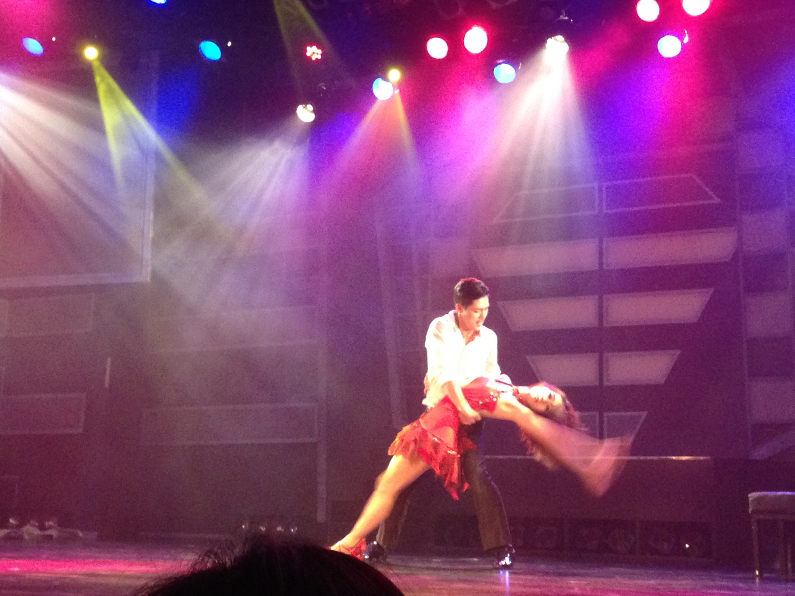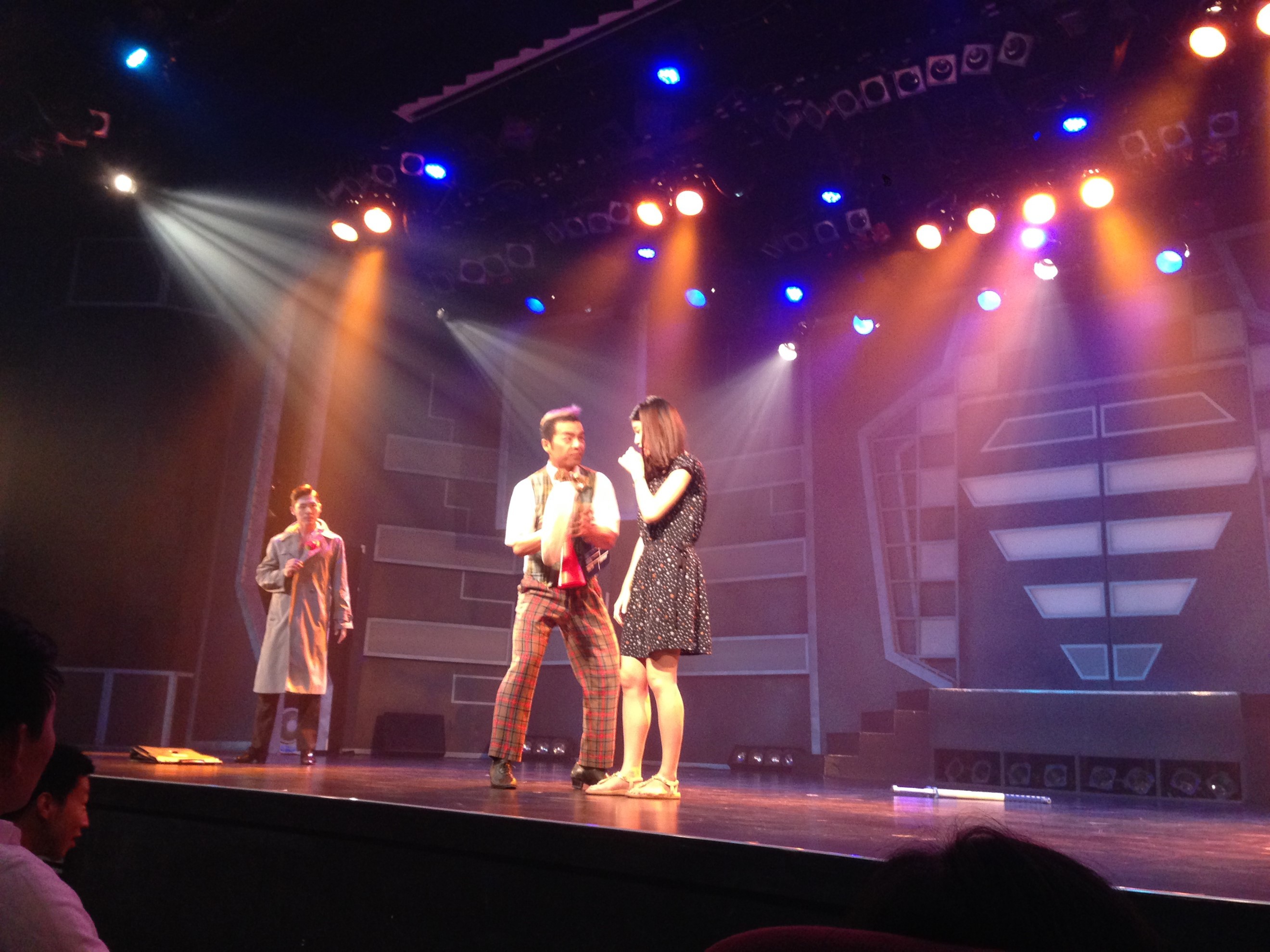另外我發現我們的位子就在第二排,想說為什麼很晚買還這麼近哩,原來他們其實有特別安排,把外國客都排在這邊同一排,後來搞笑主持人還特別在台上問我們說會不會講中文,我當下很驚嚇,很怕也被請上去,結果他用中文解釋給我們聽,說剛剛教了一段簡單的舞要在表演最後跟大家一起跳舞,阿這我就放心了,我們右邊幾個女生是新加坡來的,主持人也用英文跟她們解釋。