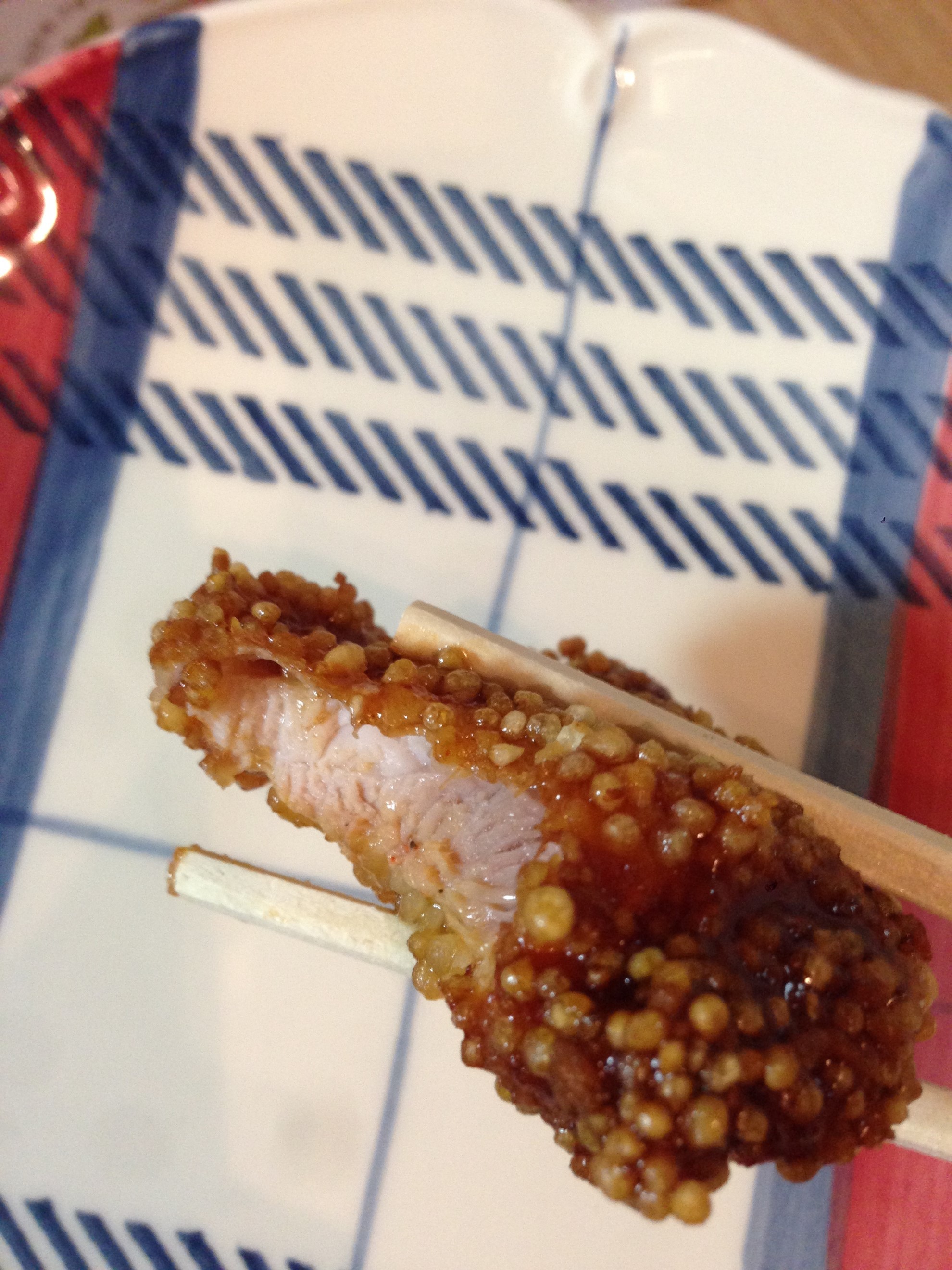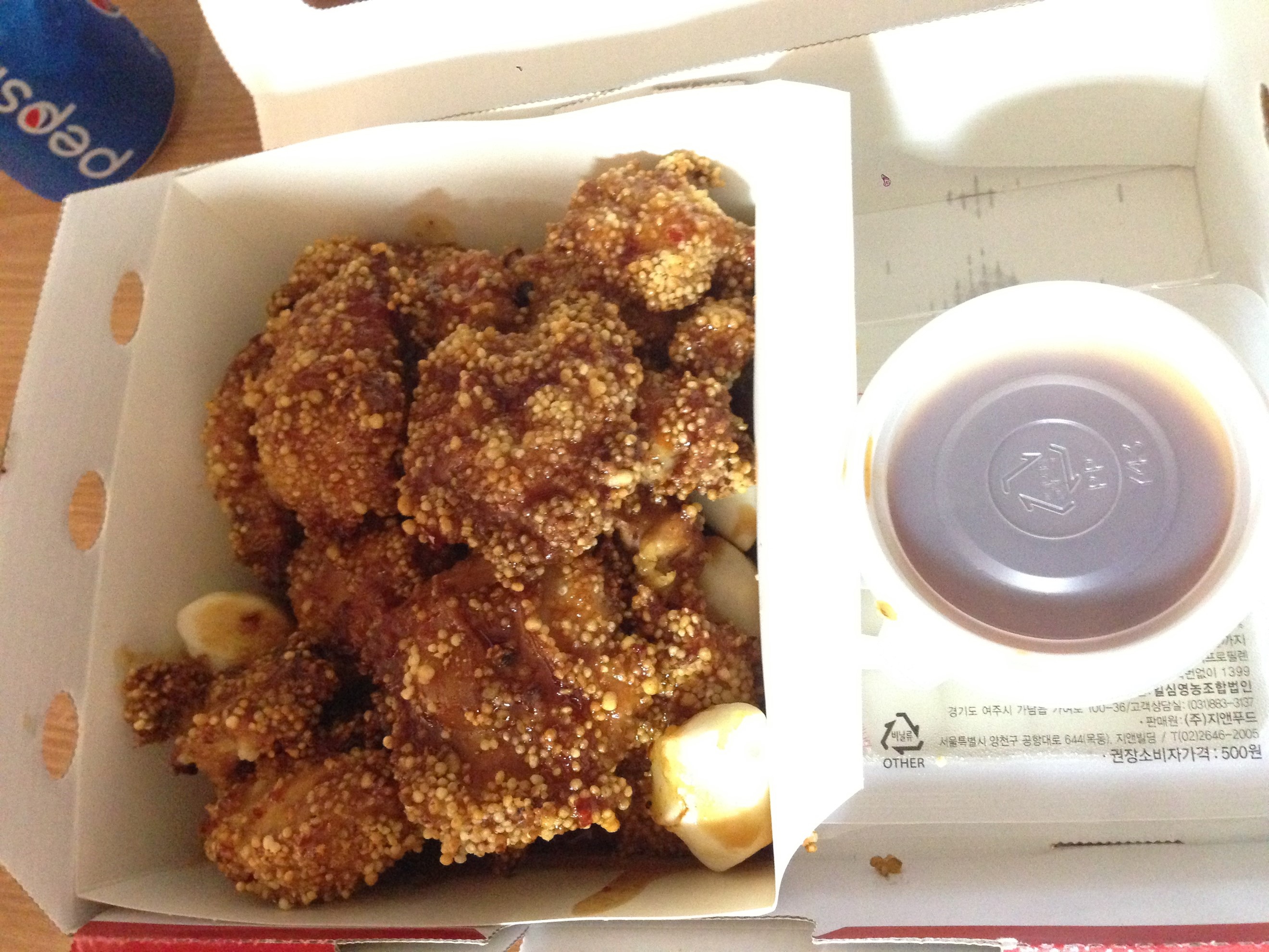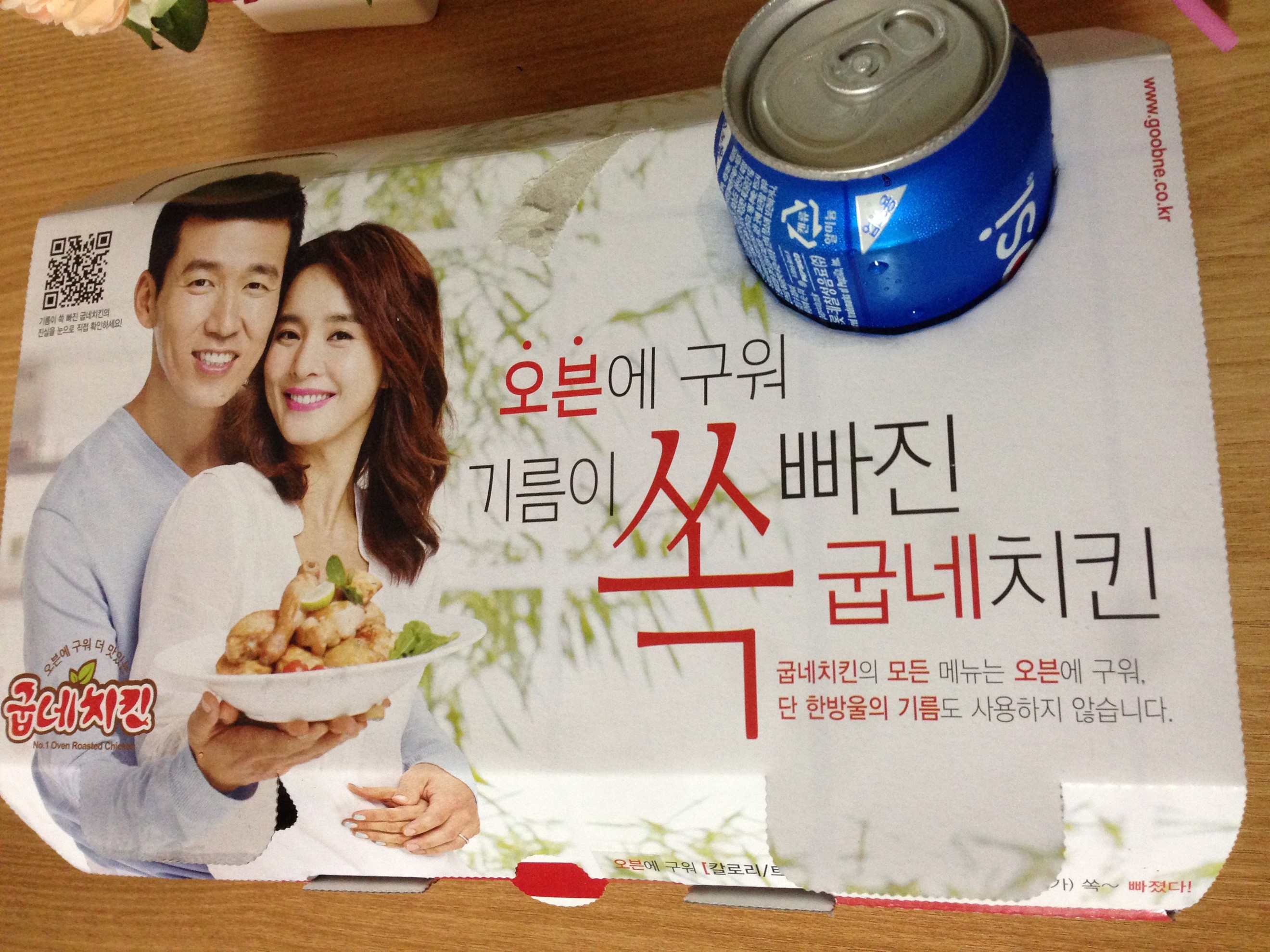 結果我們選了GOOBNE這家炸雞,聽說是少女時代連續多年代言,其實他們很多其實是烤雞,我們最後選了這款米炸雞,結果出奇的好吃!! 貌似把炸雞沾上米粒,可能是先炸再烤,很像我們的碳烤雞排,醬汁也是鹹鹹甜甜,非常的好吃,兩人窩在公寓一口接一口,還把星星叫出來溫習,有沒有很有感覺!!
