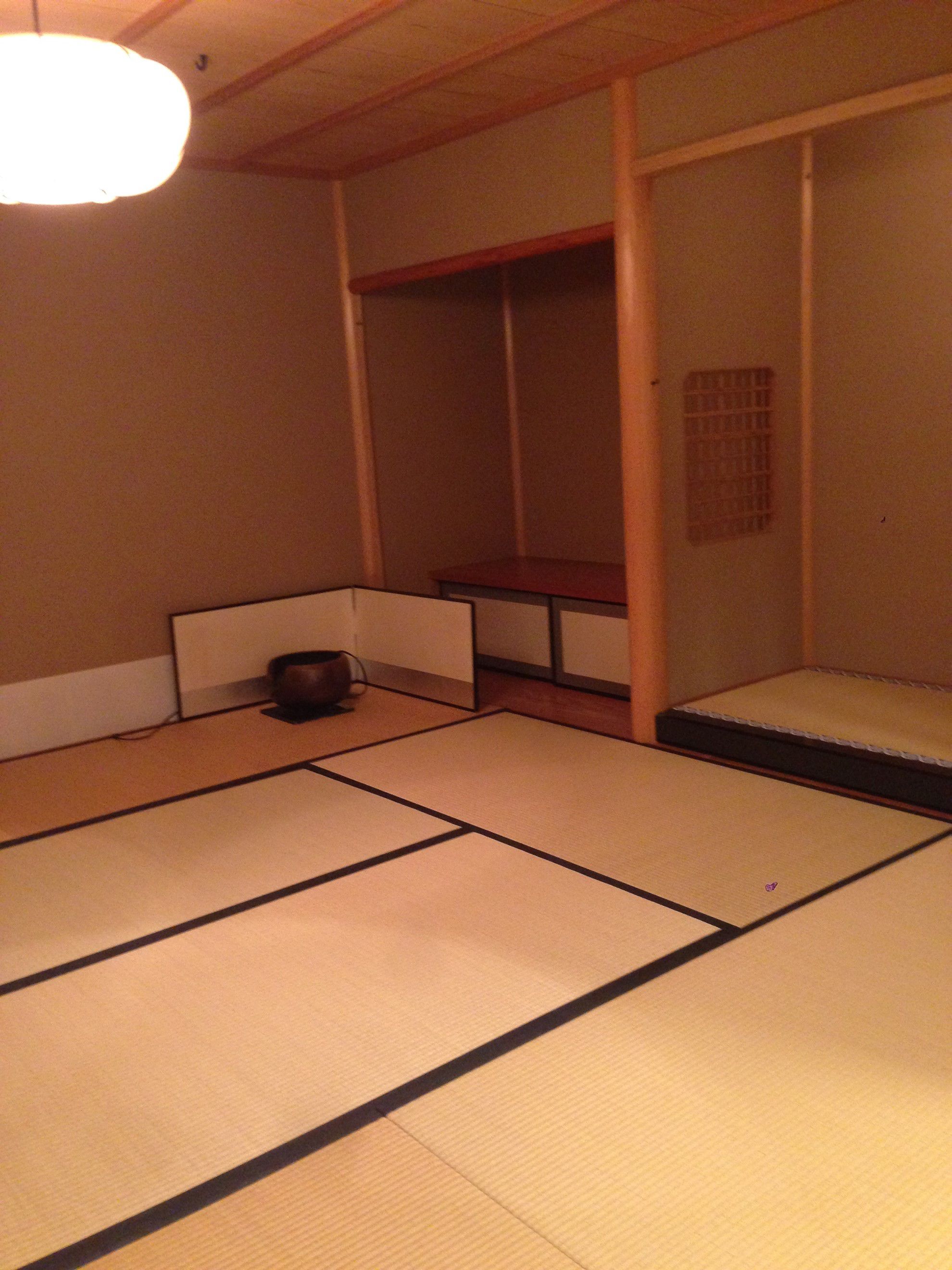 接下來我移到旁邊看朱小姐練習,那位年輕的日本美眉則在旁邊幫忙糾正她,似乎茶道有大一部分學習是這種學姊學妹制。接著是日本美眉練習一個好像很難的茶,看她進出和室好幾次,連怎麼開門、哪隻腳先進茶室、哪隻腳先出茶室,怎麼走好像都有一定的方式,高太太跟我說,茶道有好多好多可以學喔。日本美眉的客人是高太太和日本太太,我跟朱小姐在後面看,高太太之前告訴我,以前千利休是為武士泡茶,武士之後或許會活回來也或許不會,我自己的延伸想法是,怪不得許多人說茶道是一期一會,就像此時此刻,完全不同背景的幾個人,同坐在這個空間分享這個片刻,亭主認真的泡茶,招待客人,而客人則以滿滿的禮節回應,主客間和這個場域形成了神奇的片刻,我們不像古代武士有可能一去不回,但因緣際會,此時的人事物和心境未來也未必會再重複,當下也無限珍惜這片刻,這種第一次感受茶道的美好稍縱即逝卻令人無限懷念的感覺,很美好喔。
