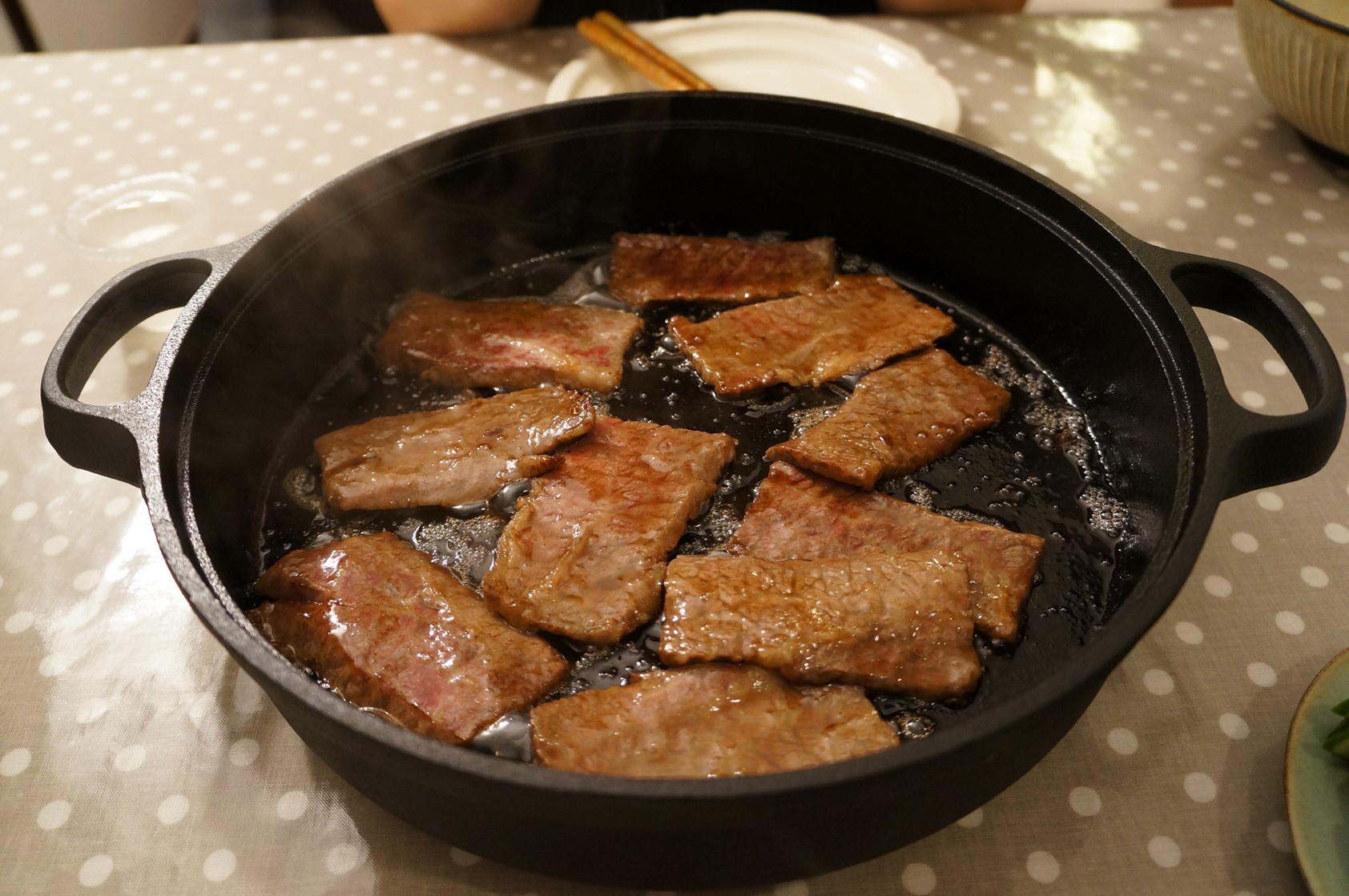 把肉片放下鐵鍋,放點砂糖和壽喜燒醬汁,馬上就有讓人流口水的香味溢出