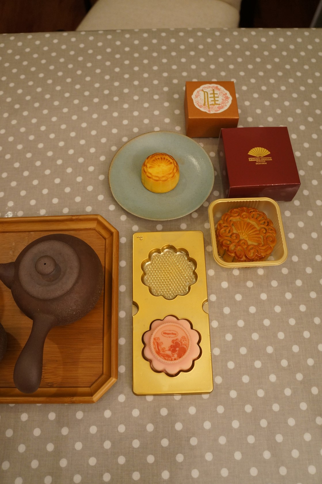 香港人很瘋月餅,M收到一盒香港文華東方的迷你奶黃月餅,用烤箱微微加熱,切開後很方便入口,鹹蛋黃的香氣跟半島的不相上下。這次剛好從上海帶了幾個飯店送的上海文華東方月餅,長的就很傳統,擺在桌上馬上就有濃濃的過節氣氛。這次還有朋友送冰淇淋店的冰月餅,過甜我們不愛,況且放在桌上居然不會融化,這也真是太可怕了…