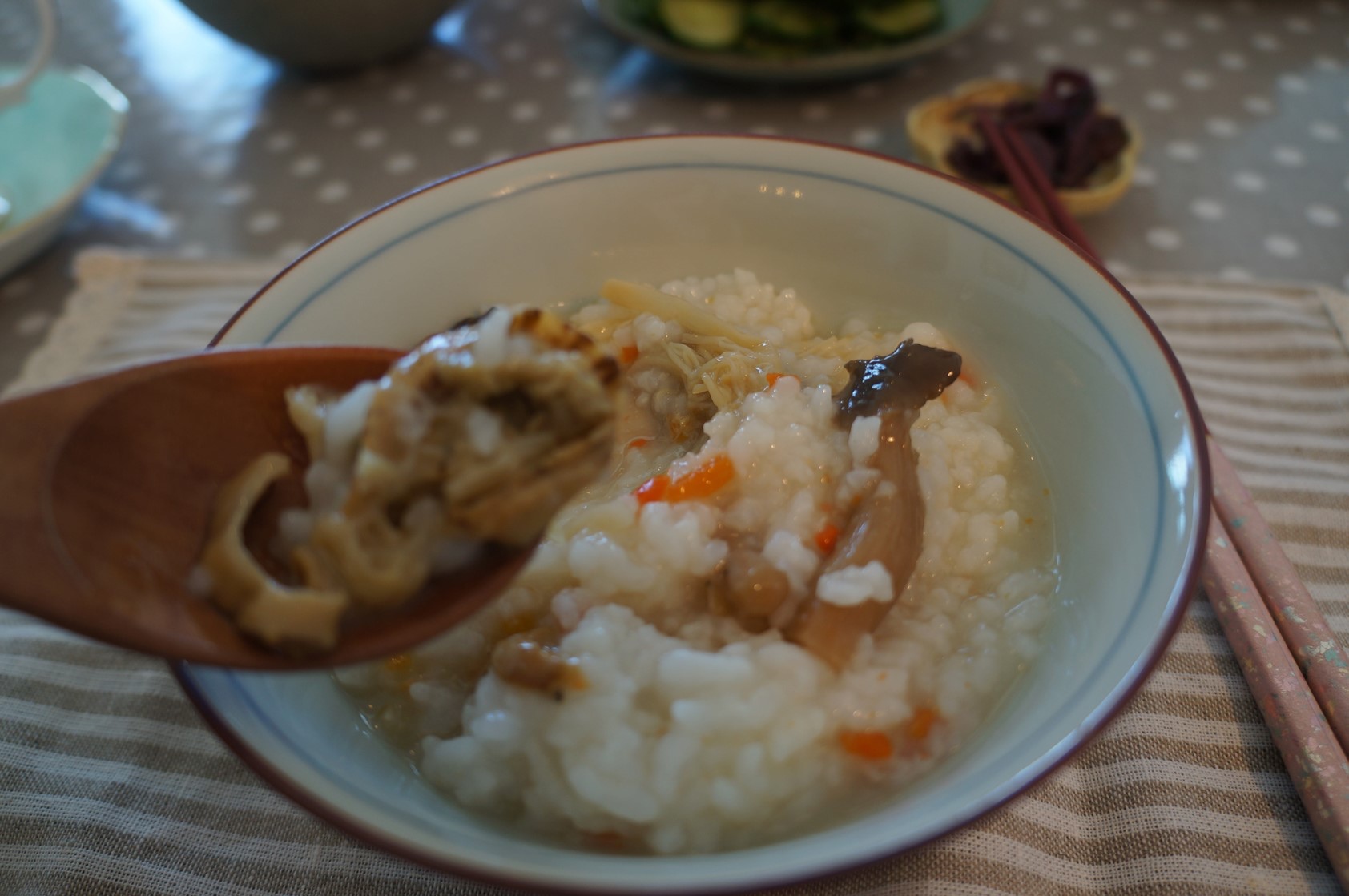 周末的早上也會特別餓,把日本帶回來一包煮飯的配料丟進鍋中,跟美瑛帶回來的米飯煮成粥,我們都很喜歡這種配料,雖然知道加工食品未必健康,但是很快速就能擁有充滿菇類和筍香氣的白米飯,打開鍋蓋的那刻總是令人期待不已。