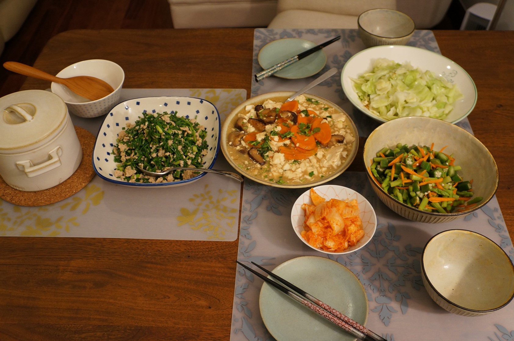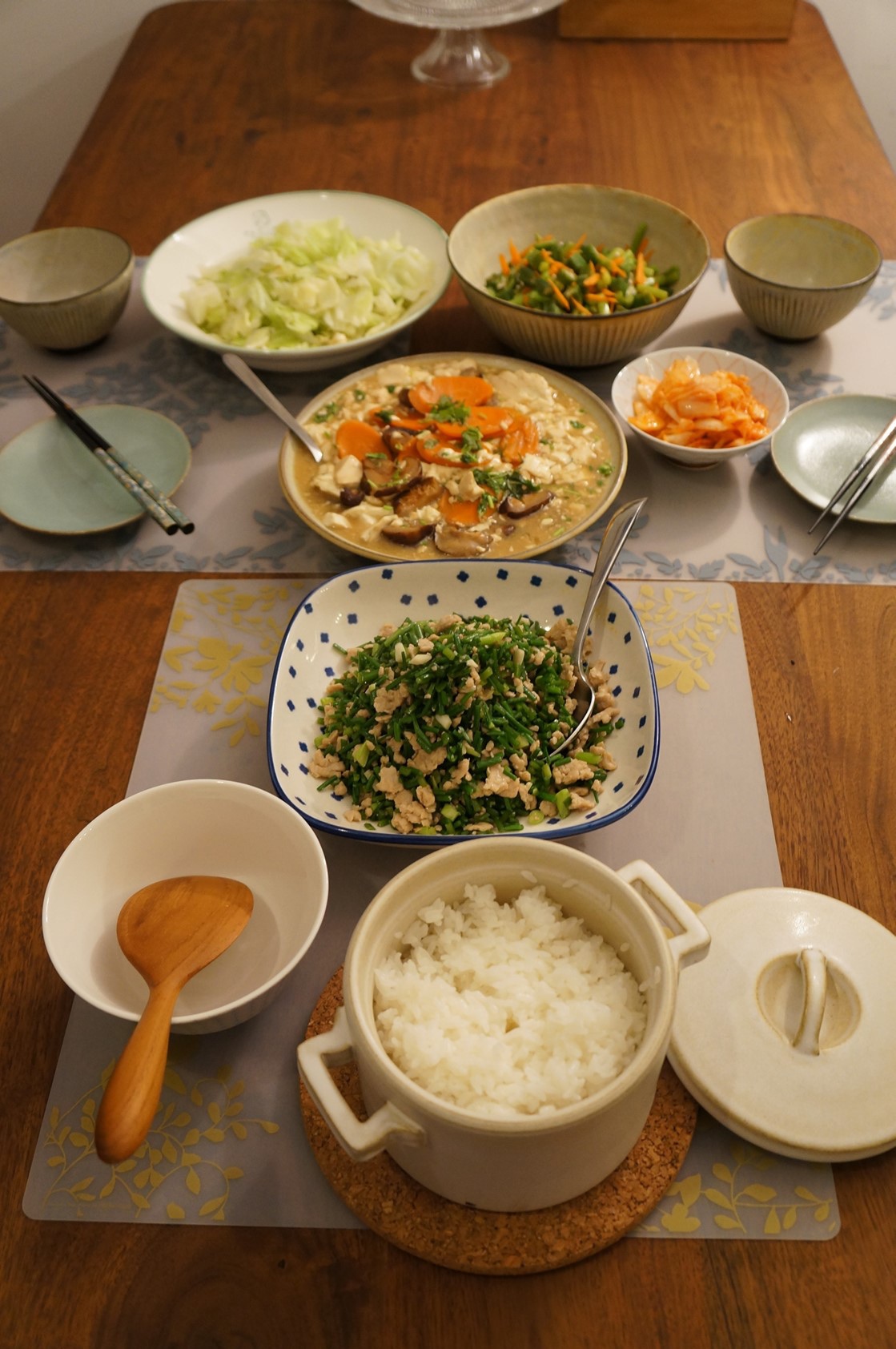 在台灣大家都還是常用油鍋,我在香港卻都很少用油,大多是清燙涼拌。今天看到了漂亮的韭菜花,內心隱約冒出了熱炒的想法,決定那就來大火快炒一番吧,其實也只有旅行回家的這幾天會有這種"超級想做菜"的心情。另一盤花菇紅蘿蔔燴豆腐則是廢物利用,把冰箱裡快到期的硬豆腐給解決掉而臨時想出的組合。