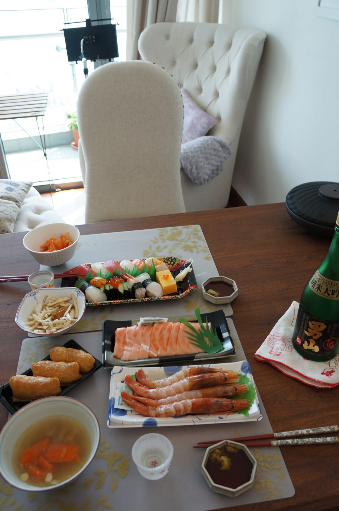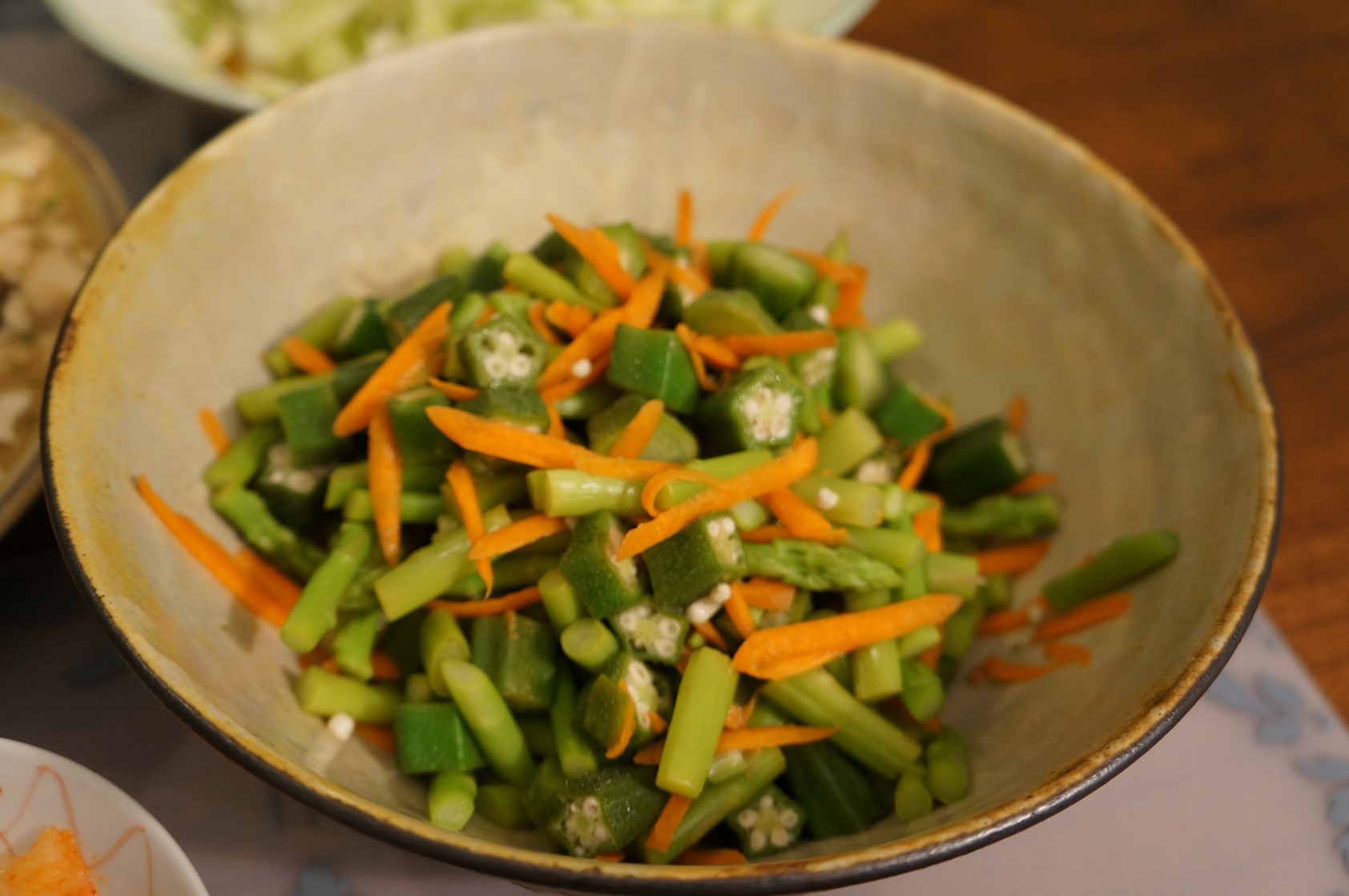 大碗裡裝的是北海道札幌的旅館早餐學到的想法,秋葵切片配上紅蘿蔔絲加上紫蘇醬汁,我今天為了增加蔬菜纖維還加了蘆筍,放入冰箱冰鎮一下,清爽可口,是今年夏天常做的菜色。