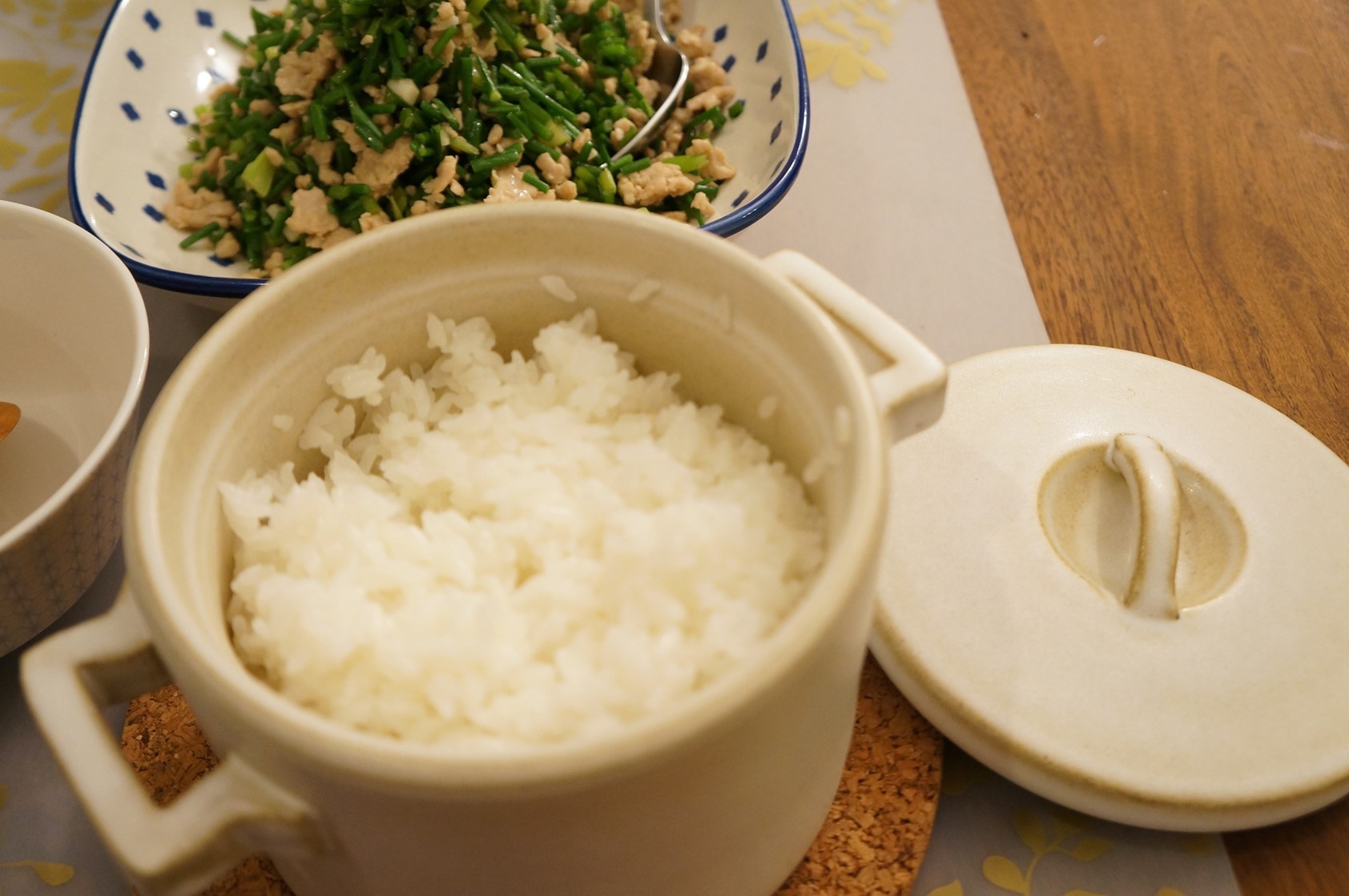 最近開始喜歡這種另類煮白飯的方法,用我的小土鍋洗米,吃多少煮多少避免有隔夜飯,大概都放一碗米左右,整個小土鍋放入電鍋加墊蒸,好處是用電鍋附的小鍋很難蒸一碗米,而且常常回有一層鍋巴再鍋底,土鍋加墊加熱的好處是底部不會過熱結鍋巴,即使沒吃完,整鍋放進冰箱,隔天再加熱土鍋內還是充滿水氣,飯不會變硬呢。