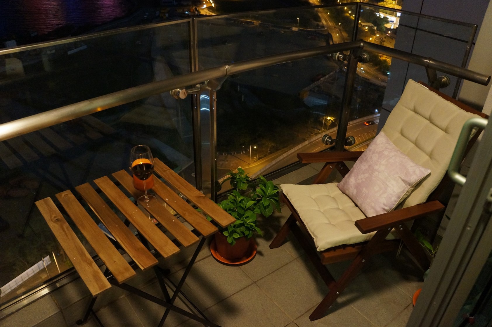 晚上迫不及待到我們陽台喝酒,兩人興沖沖把兩個新椅子和桌子搬出去,點了我的偽蠟燭燈(是的它是蠟燭材料做的,但是上面是電池的燈,還故意做的像蠟燭燈光一樣忽輛忽暗,我真是很驕傲發現這玩意阿,超適合室外),我喝紅酒M喝cider, 忍不住打卡炫耀一下這種"家裡終於完整"的滿足感。