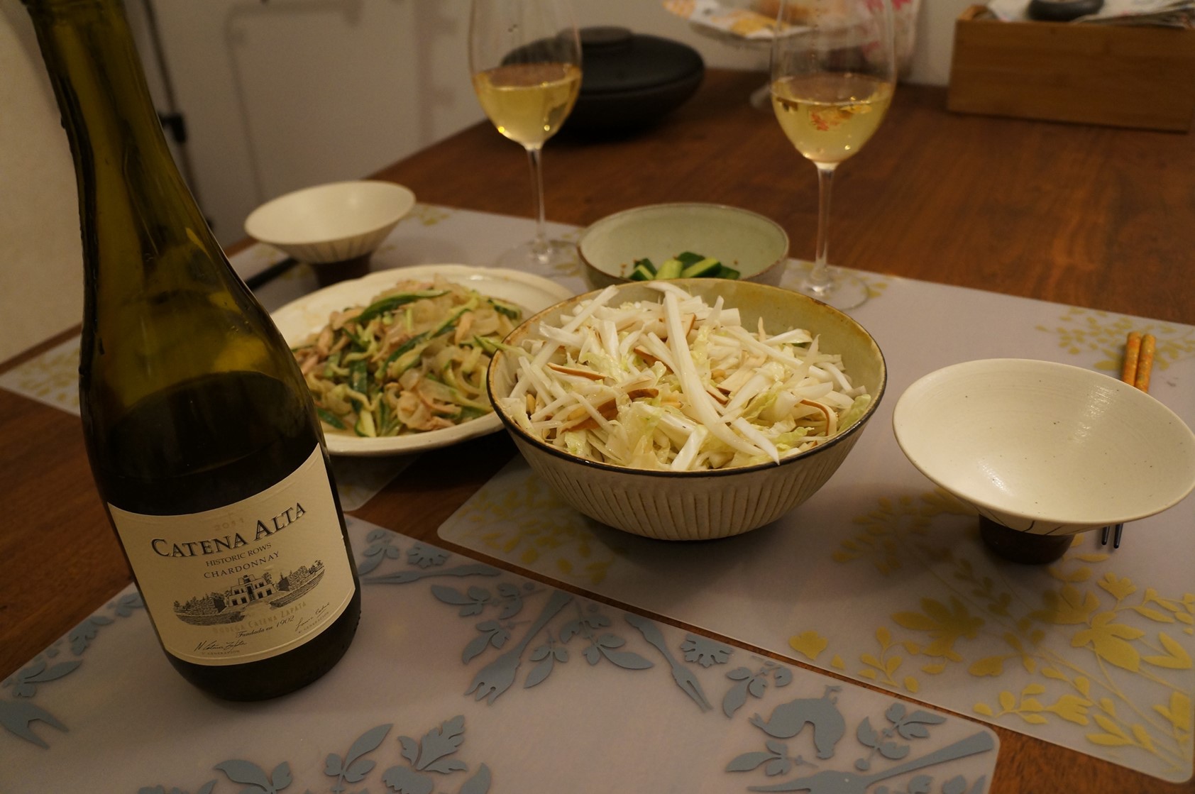 碰到周末就是會很想開酒,之前訂了一箱Catena Alta Malbec同時加訂的這瓶白酒,一直很想試試,今天兩個人懶在家,哪裡也沒去,就趁M晚飯前的午睡時,我快速的掃過冰箱,廢物利用後弄出幾個涼拌菜。