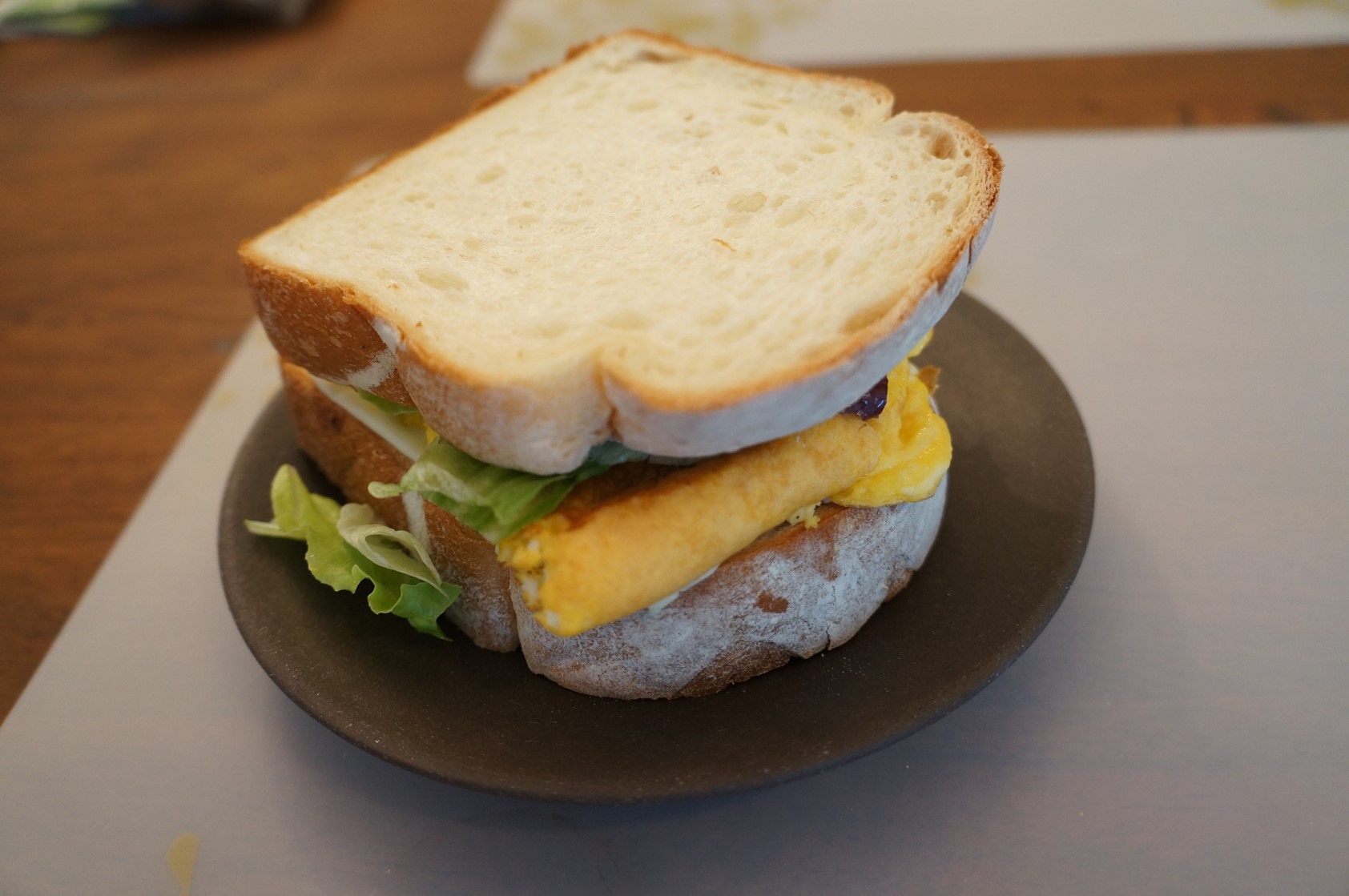 又是個重口味三明治的早餐,老外看到會昏倒八,炒蛋加了松露油和鹽,裡面還塗上芥末醬和蘿勒醬,邊啃酸黃瓜,等一下是要去上工嗎?