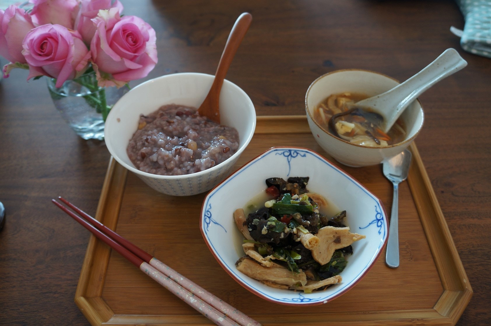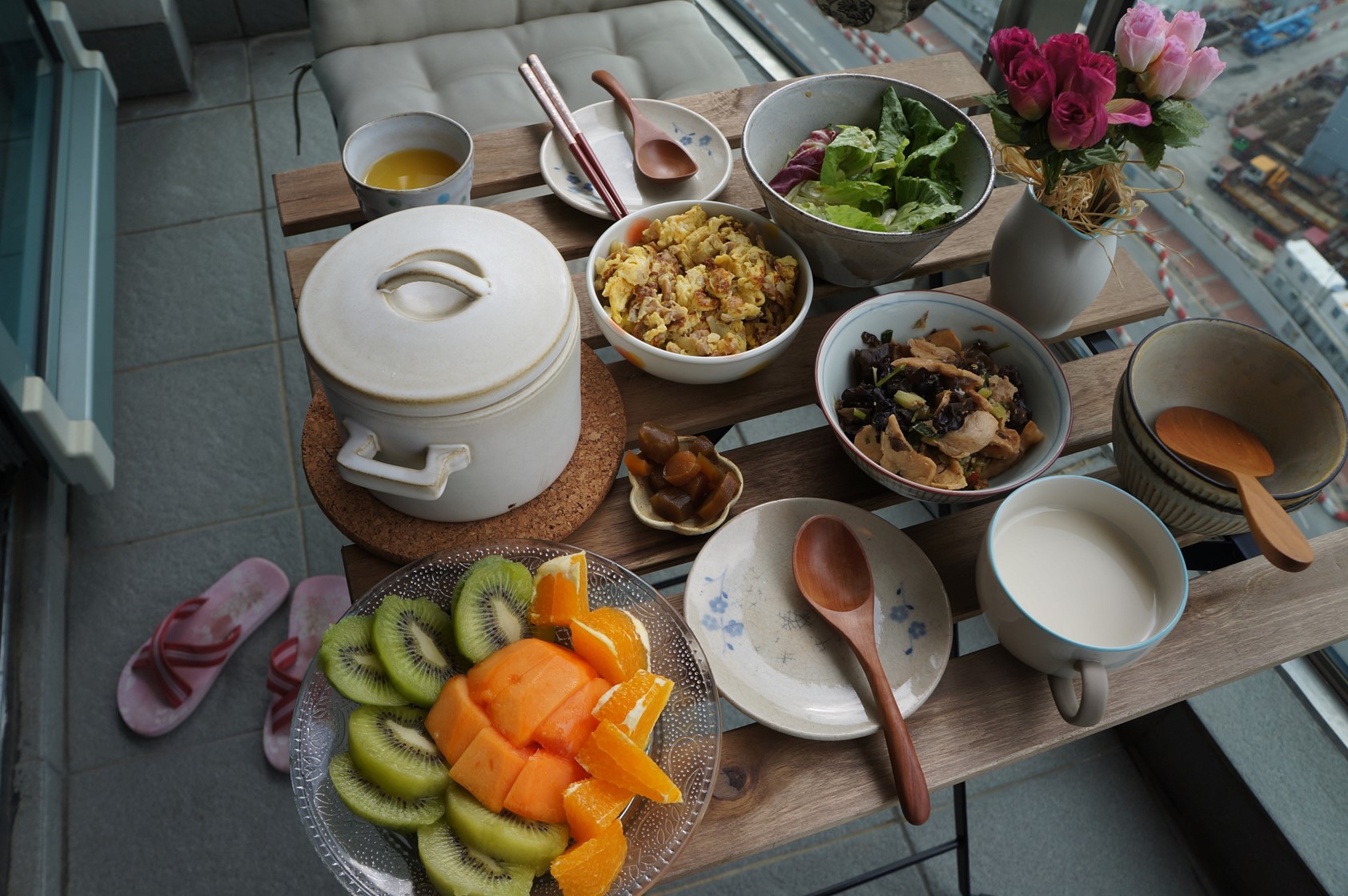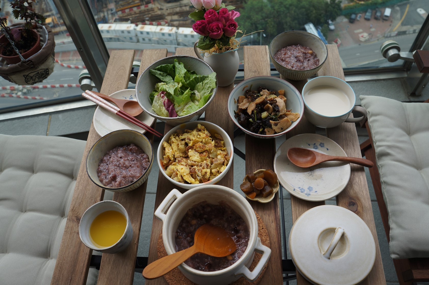 阿玲很好心,做了一盒雜糧稀飯和我愛吃的豆類小炒跟菜埔炒蛋,週日早上一早就興奮看到很天氣,不怕煩得把桌椅移到陽台擺桌弄碗,就是想要喜受這一年中難得的可以坐在室外悠閒吃飯的好天氣,現在的天氣有點涼又不冷,只要有太陽就美麗到不行。