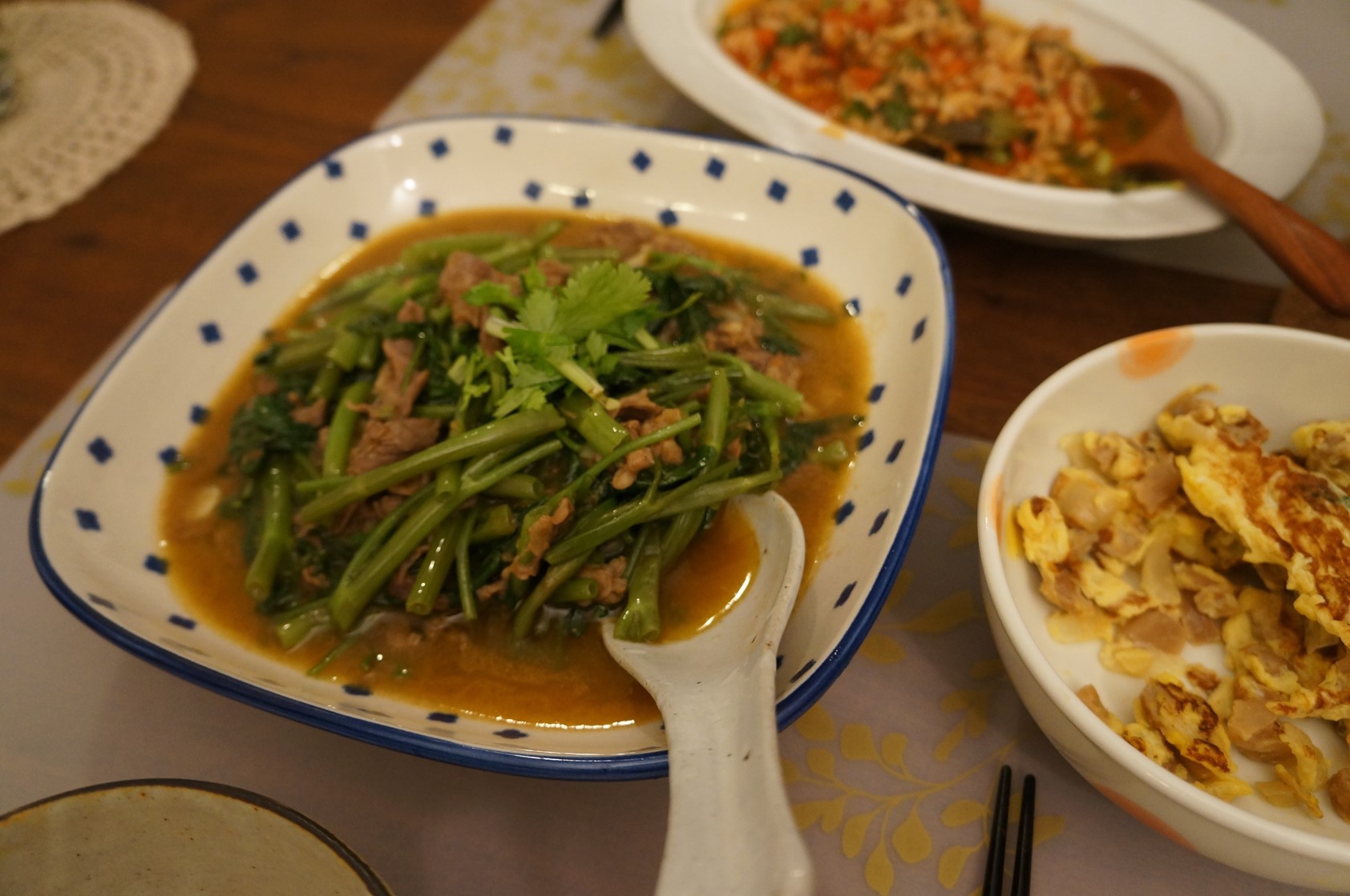 這天又"突然很想吃"沙茶牛肉,想到以前唸金華國中時,永康街小公園旁有一攤賣沙茶牛肉羊肉麵的店家,每次經過那香味真是勾人啊,於是列了單子請m下班時去買,他很拼命他公司樓下超市沒有,又回來家裡樓下超市,結果也沒他公司樓下超市沒有,又回來家裡樓下超市,結果也沒有沙茶醬和空心菜,他就跑到下一站"奧運"去買,終於買到回來,不負使命。家裡剩下的絞肉,想弄到酸酸辣辣也是重口味的東西吃,上網找了泰式打拋豬肉的作法,用到自己種的九層塔,還算不錯很下飯。