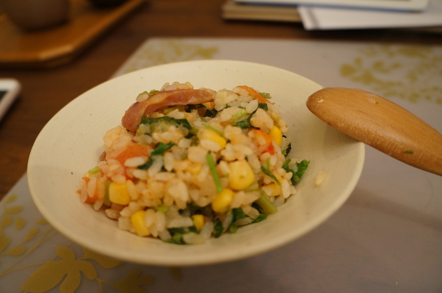 懶得出門採買,挖冷凍庫發現幾根很久以前買的高粱酒香腸,管他過期沒先用再說,加入冰箱有的東西和北海道玉米罐頭,也是一餐。