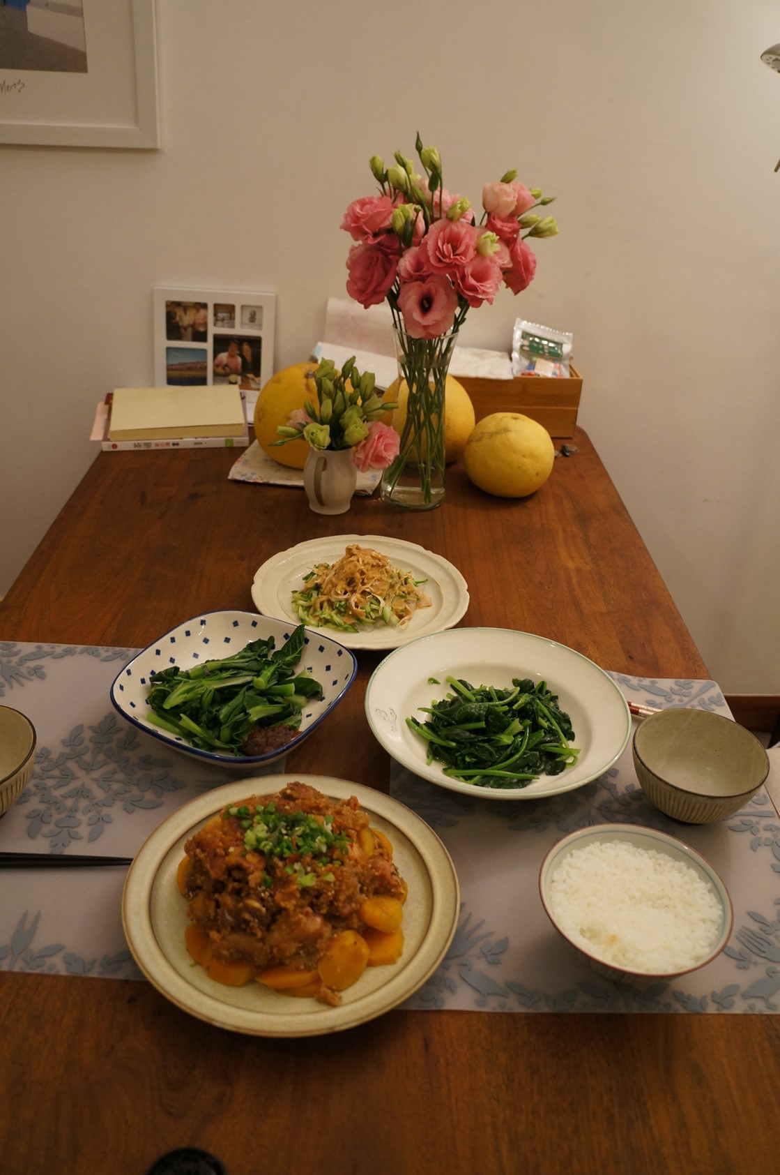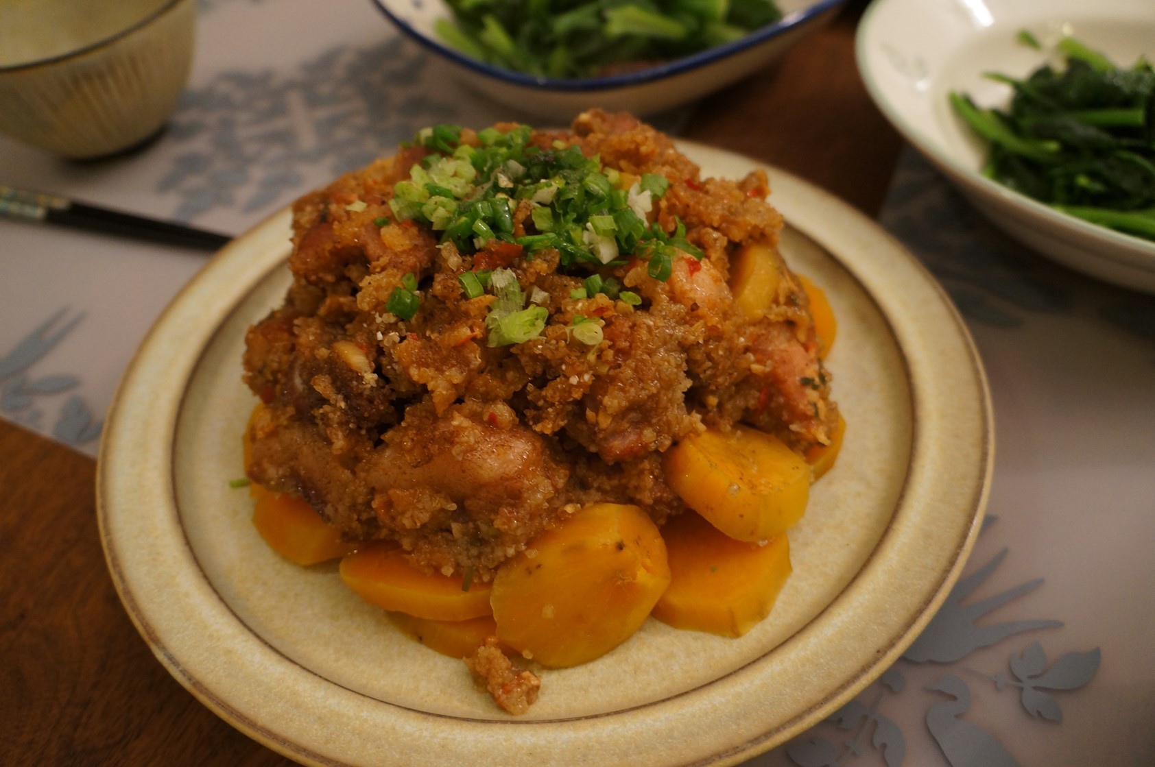 搭拉,終於有像樣的東西端出,粉蒸肉!! 我家奶奶以前就常做,奶奶的口味都做得清淡,但是肉嫩粉香,尤其是一起蒸的地瓜或南瓜都香的不得了,這次我上網看了阿基師的改良作法,採取了部分方式,例如醃肉時加了辣豆瓣醬,我還擅自加了點新買的瑞春醬油膏,好像還加了點蠔油,有點忘了,肉醃了一晚,隔天才料理,肉仍是切大塊,但採取了他跟地瓜交錯的排法,其他的還是跟奶奶一樣,放在大碗裡蒸,爭到第二次時上面鋪上地瓜片,蒸完倒扣在大中,就有漂亮的形狀。我這次只加一包粉,後來格參加熱時我又加了另一包粉,好下飯阿,下次做可以一次就下兩包粉,稍微加點水浸濕粉防乾,另外這次我的五花肉有帶皮,就一起切皮進去蒸,很有嚼勁也很香。阿基師上桌時還有熱油鍋淋蔥和灑一點椒鹽,是川式做法,我覺得可以免去,畢竟五花肉已經油脂夠多了。