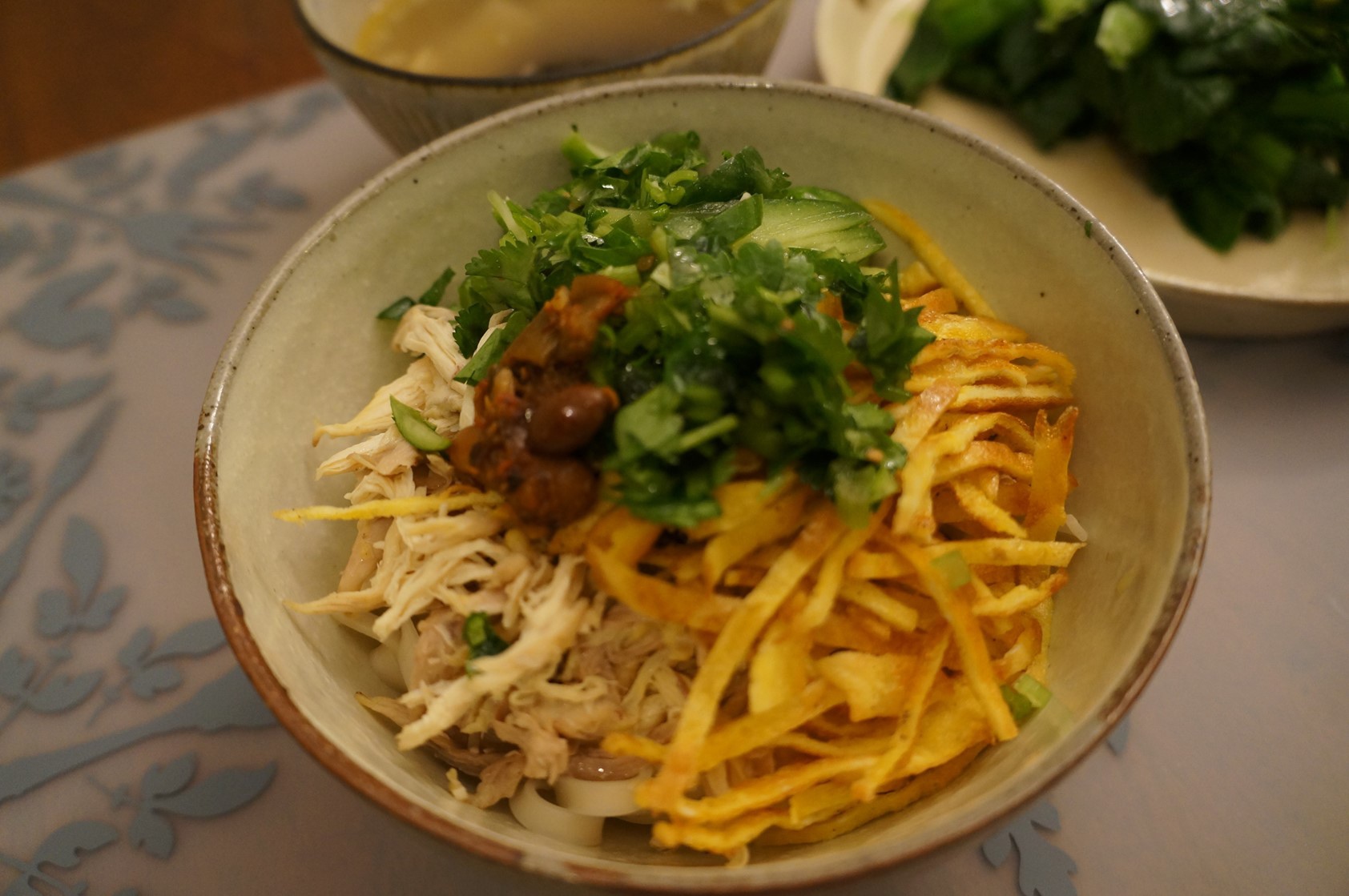 因為煮了雞湯,就會出現很多雞絲的料理,我覺得雞湯固然好喝,但處理雞肉真的很麻煩阿,每次都要吃雞絲相關菜色幾天,這天做了麻辣雞絲乾麵,還是遠不及我家附近的我家吃麵來的好吃阿。