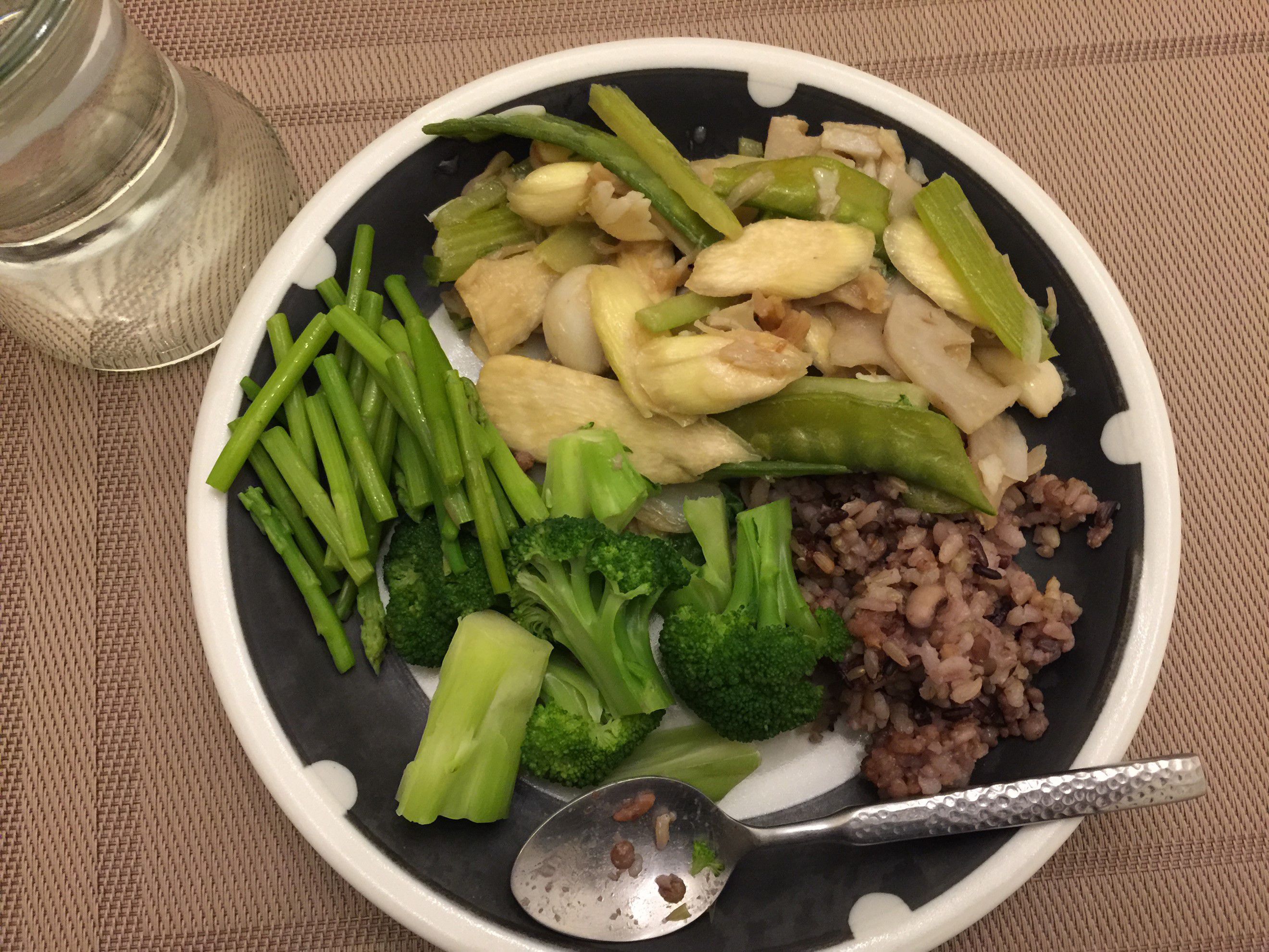 為了以蔬食為主食,是真的要自己下廚,而且花很多時間自己準備才能吃得健康,剛好時下流行罐裝沙拉,我也準備了幾本食譜,提供很多idea, 平常就在冰箱準備好幾個盒子的常備菜,像是烤南瓜、普羅旺斯烤野菜、日式紫蘇梅子醬涼拌蓮藕、白酒醋橄欖油拌沙拉等等,這樣每餐只要每個盒子瓦一點出來就可以吃到營養又很多蔬菜的一餐了。