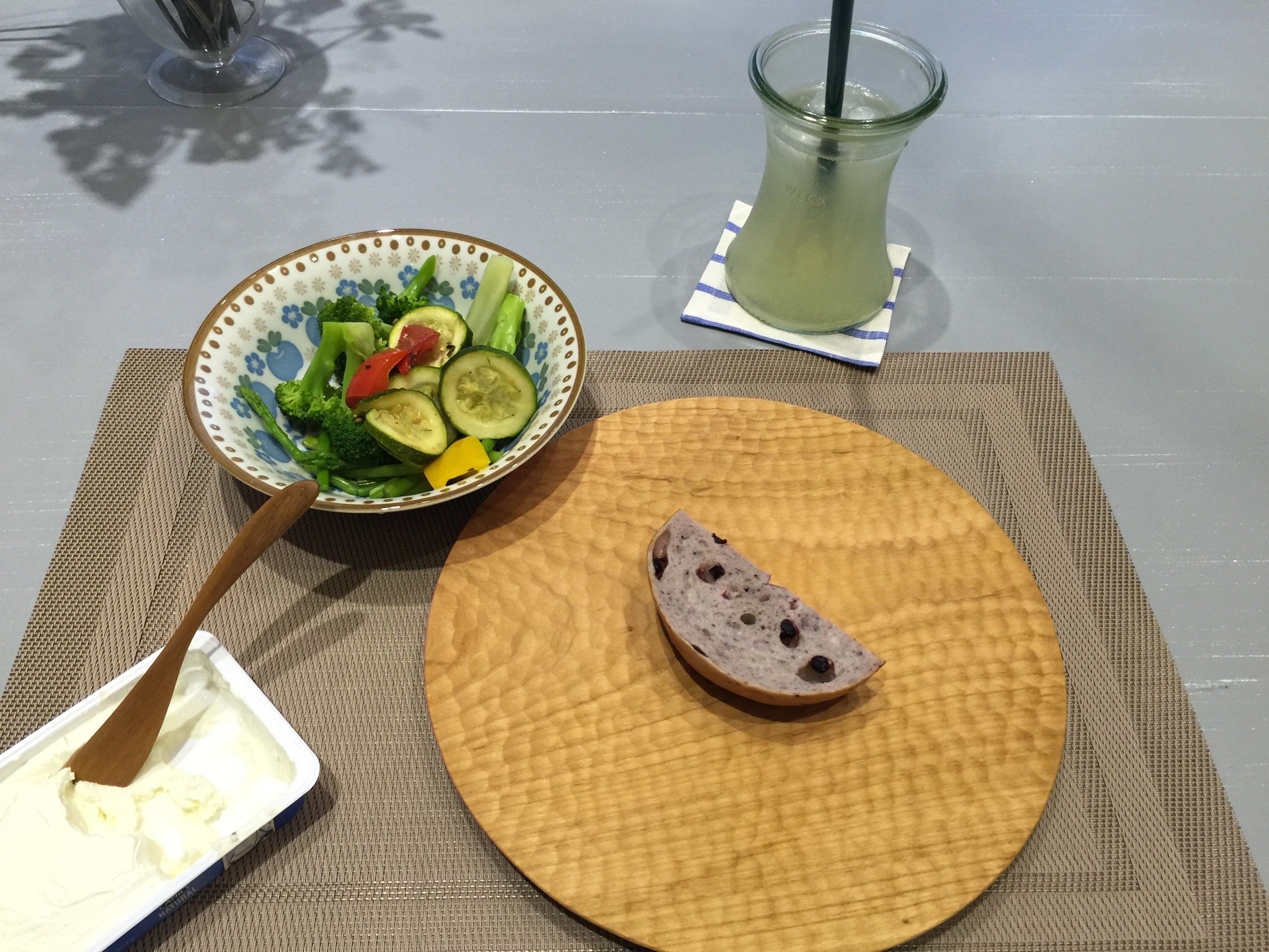 烤蔬菜、綠葉蔬菜和無花果貝果,飲料是檸檬汁