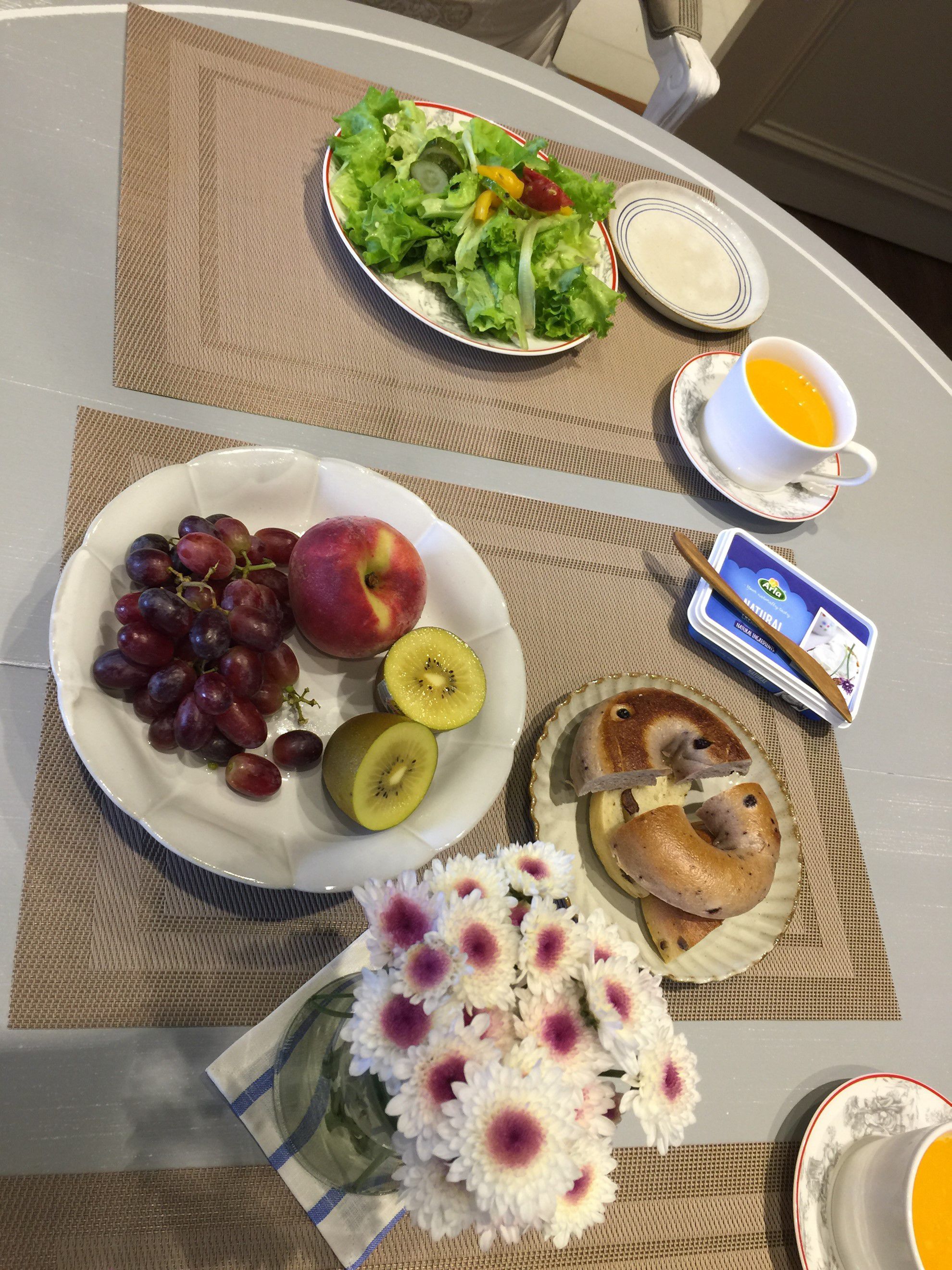 藍莓貝果跟預先準備在冰箱的瓶裝沙拉