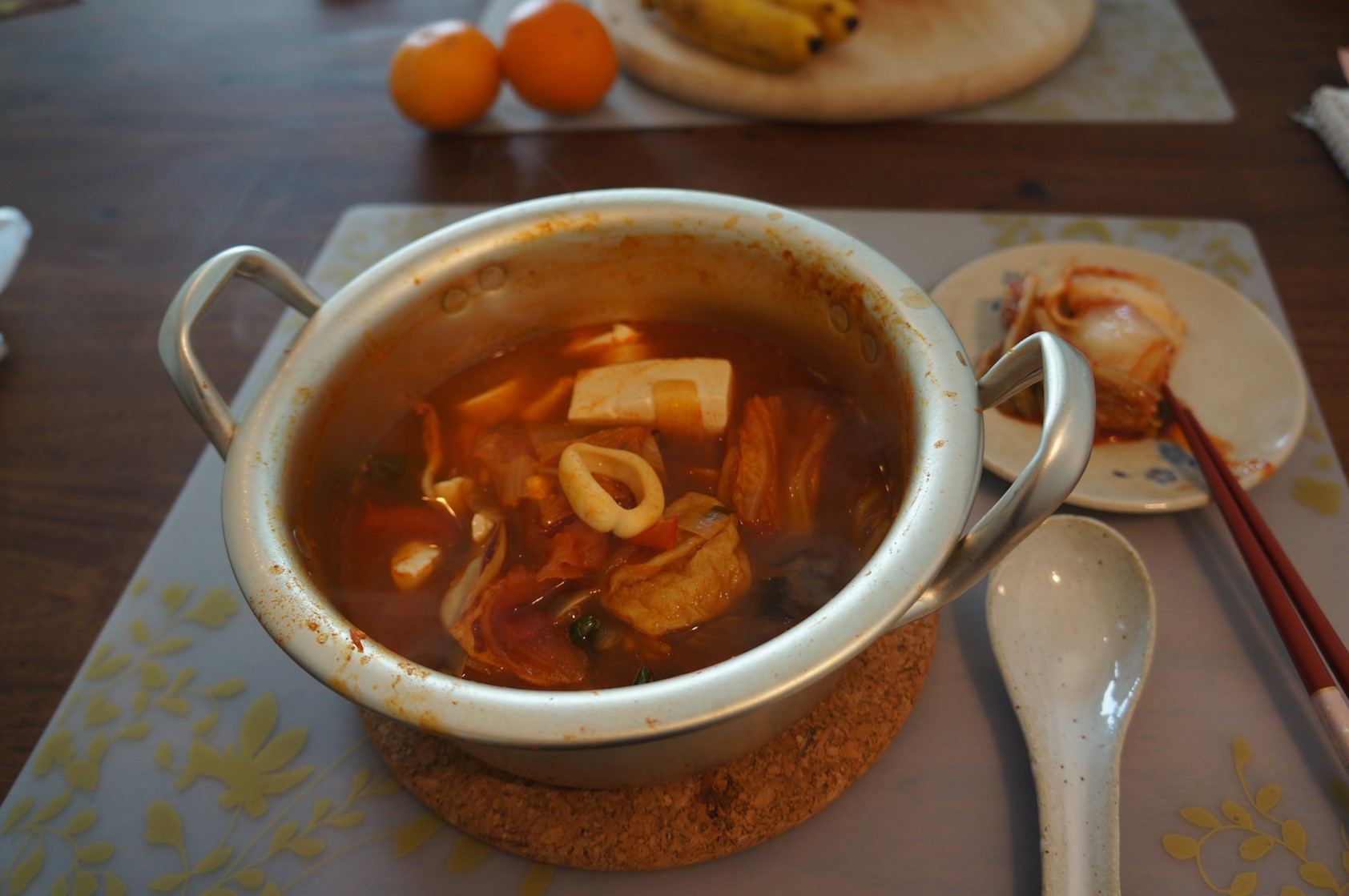 終於從日本回來了,從來沒有這麼鬆了一口氣的感覺,第一周很棒,第二周在京都發現事情大條後就陷入了地獄,胃脹加嘔吐,完全不知道能吃甚麼,又餓又脹,像是生了場嚴重胃病,回家後至少有自己廚房,可以慢慢試試到底甚麼能吃甚麼不能吃。上網查,友人分享說她懷孕時突然很愛吃一款韓國拉麵,就讓我想到韓國豆腐泡菜鍋,搞不好我會想吃,等不及晚上m幫我買回來,自己研究一下食譜就殺去超市買料,買了海鮮、豆腐、韓式辣椒醬等等,還把香港的魚豆腐也買了,亂煮一通嫌不夠酸,還加了醋進去,果真有開胃的效果,讓我享受到了很久沒有的"吃飽飽"的感覺。但是煮了一大鍋,吃到第二三天又膩了,又得要尋找新花樣了…